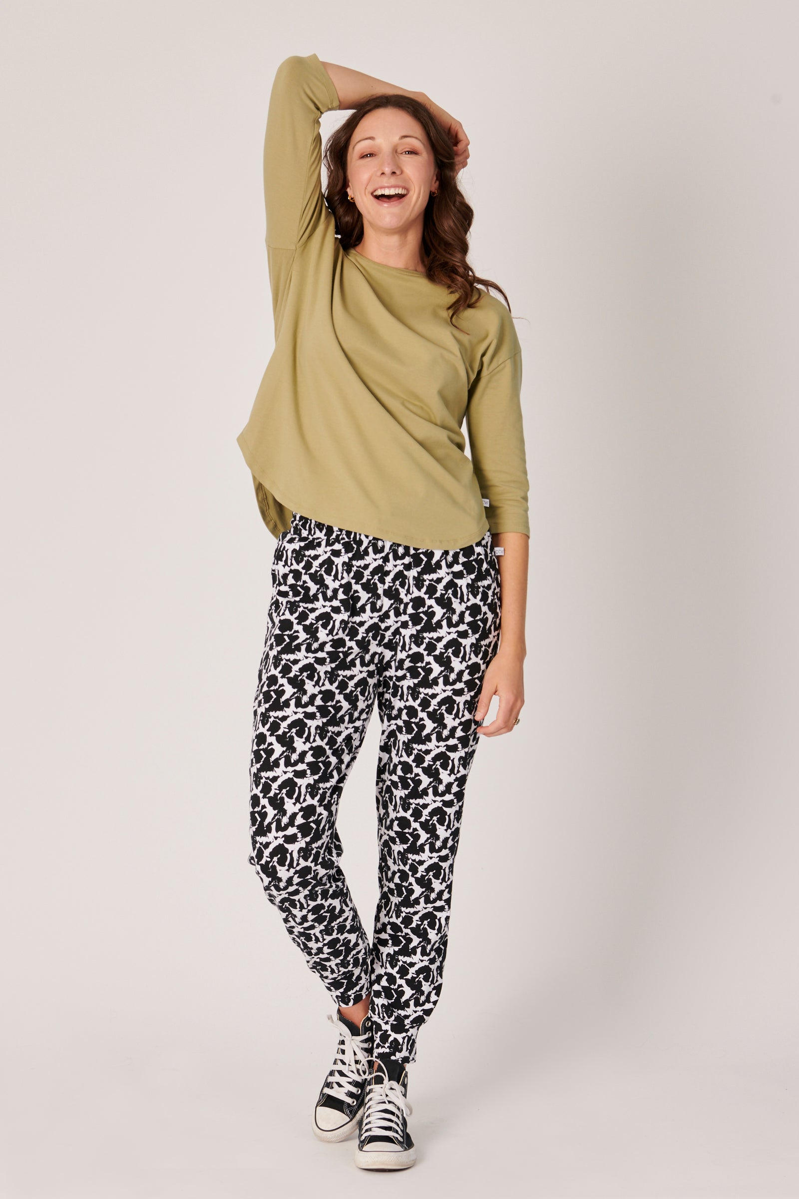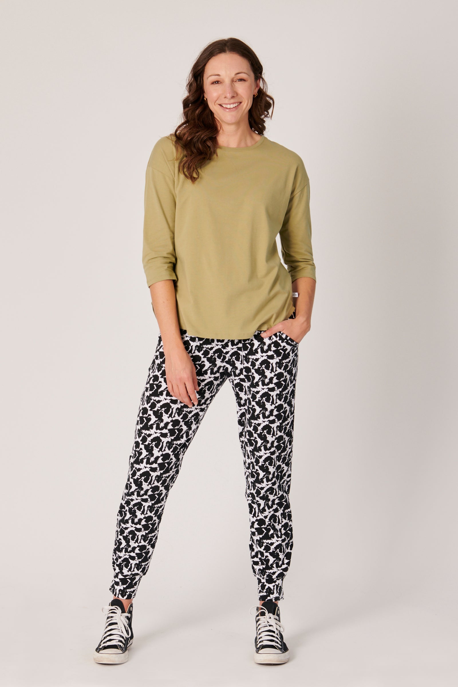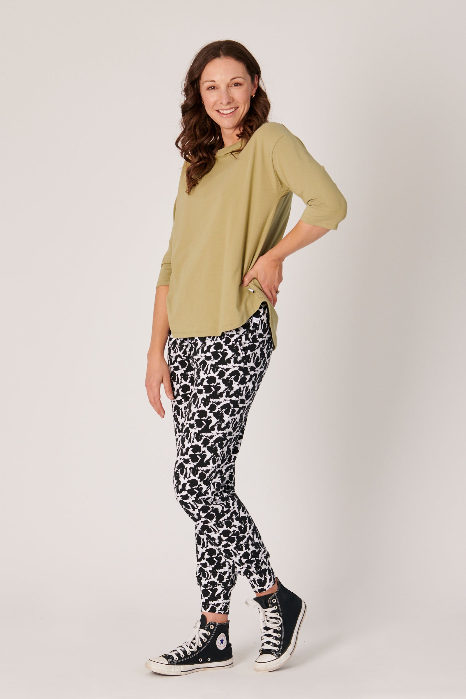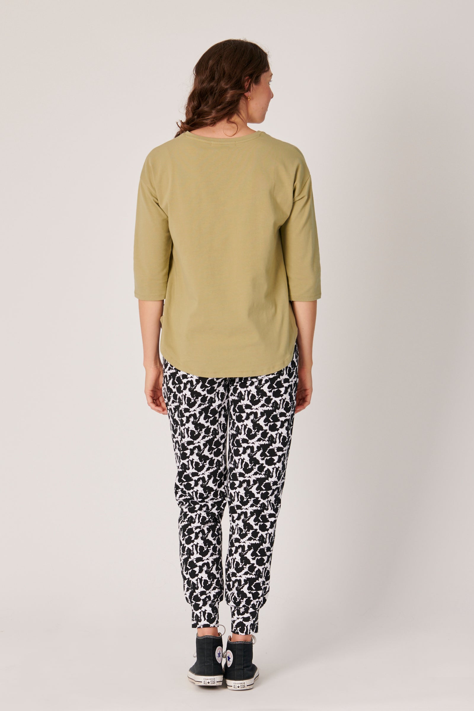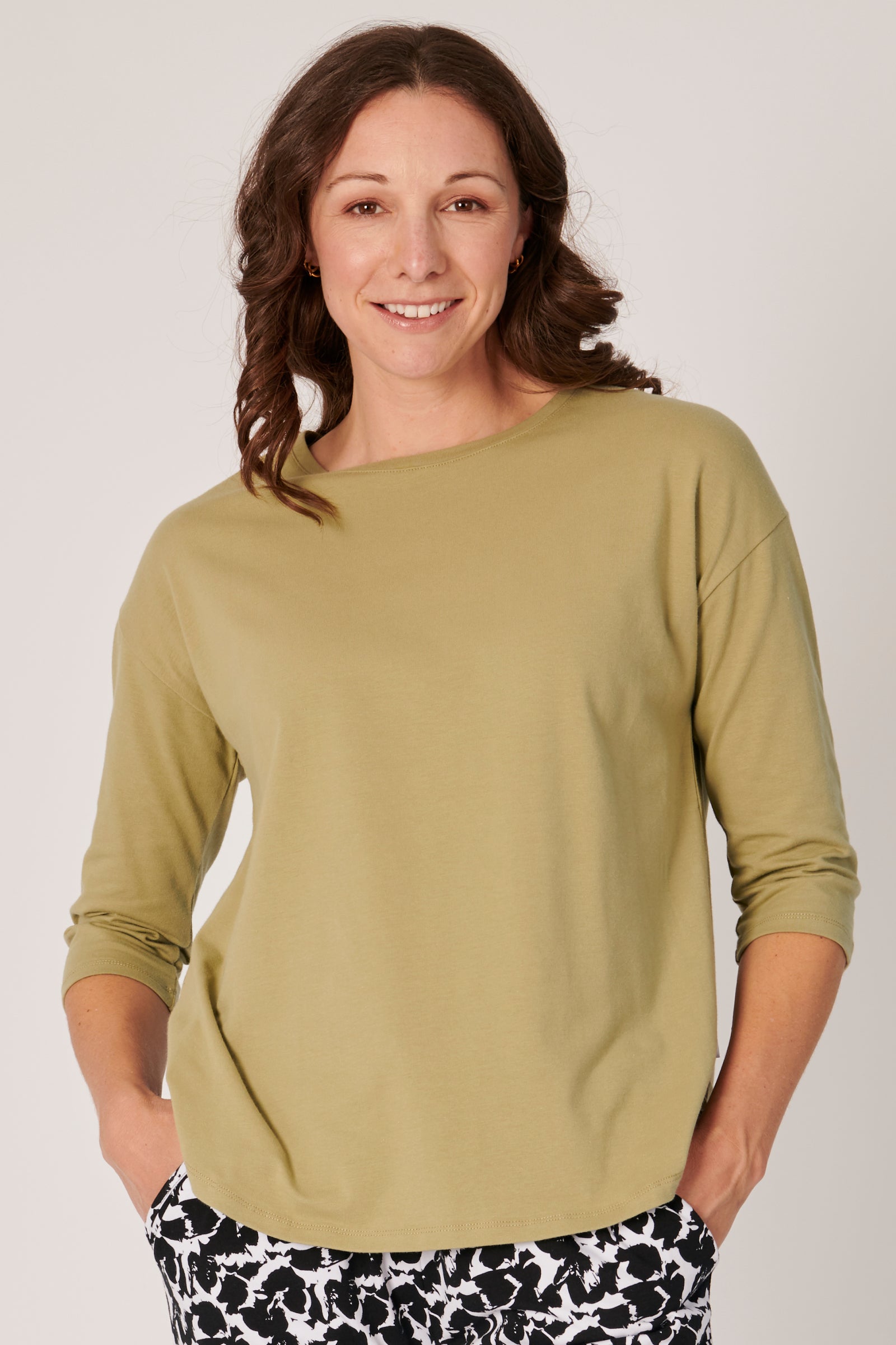 The 3/4 length sleeves provide a versatile option for layering or wearing on their own, making this tee a year-round staple. The classic round neckline adds a timeless touch, making it easy to pair with a variety of outfits, from casual jeans to tailored skirts.