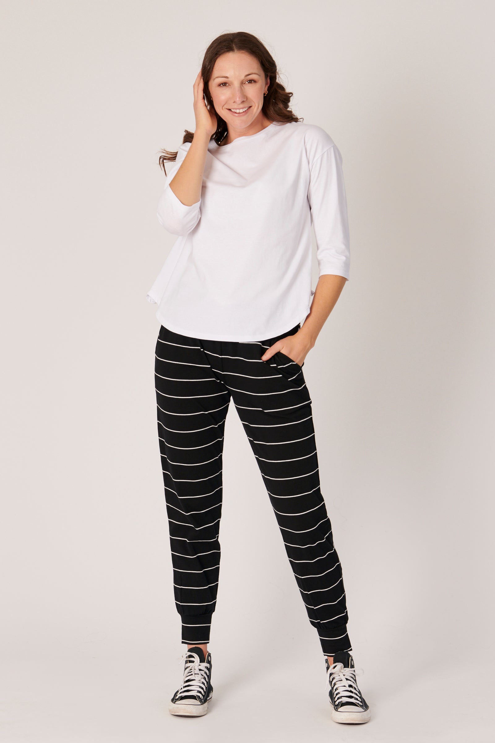 The 3/4 length sleeves provide a versatile option for layering or wearing on their own, making this tee a year-round staple. The classic round neckline adds a timeless touch, making it easy to pair with a variety of outfits, from casual jeans to tailored skirts.