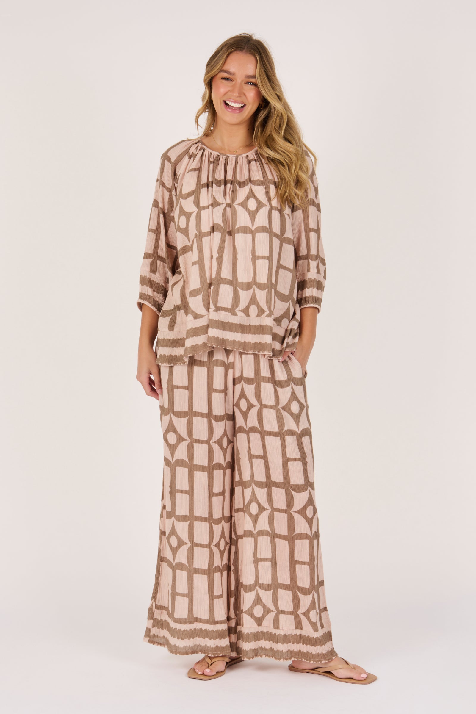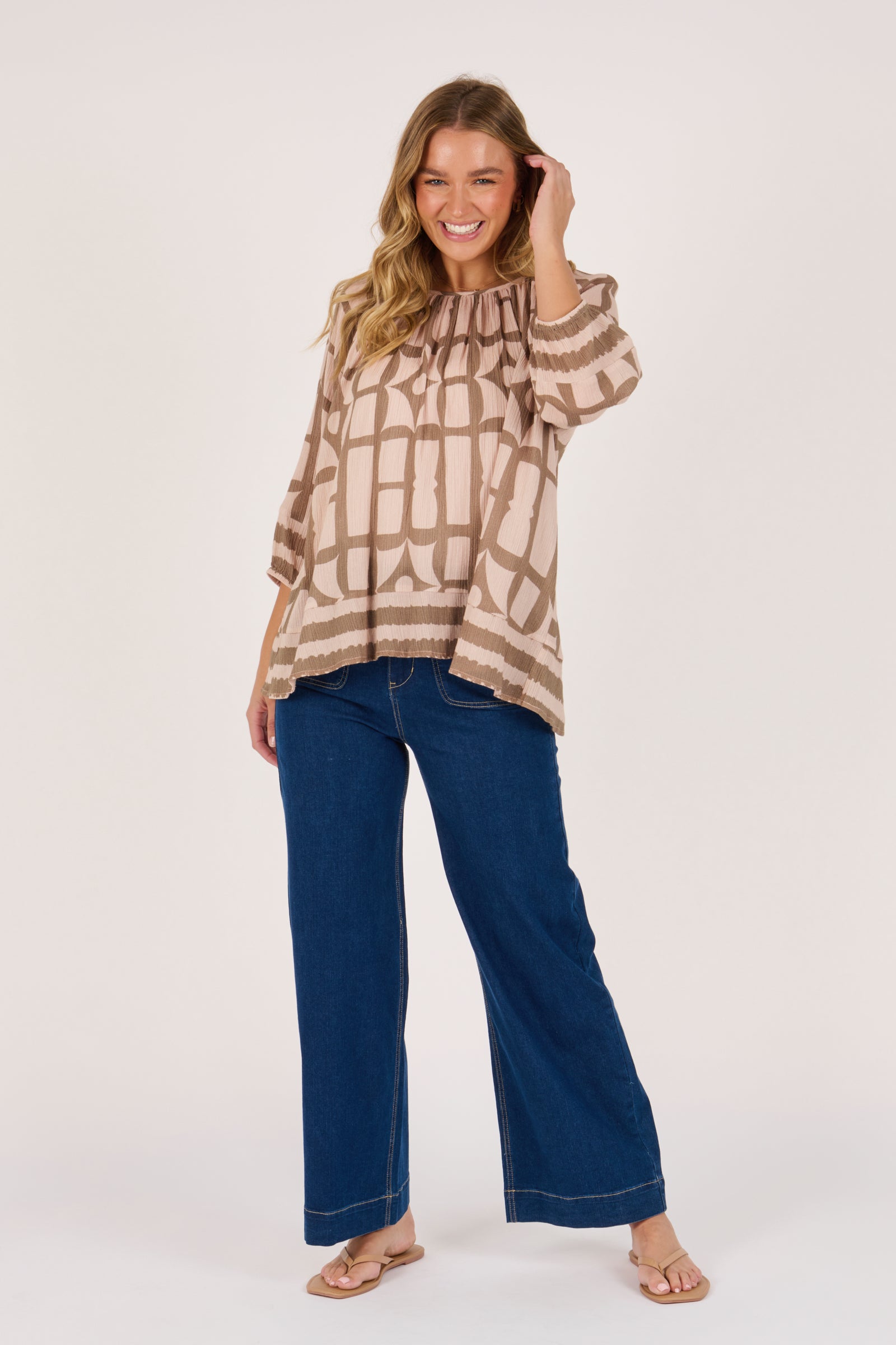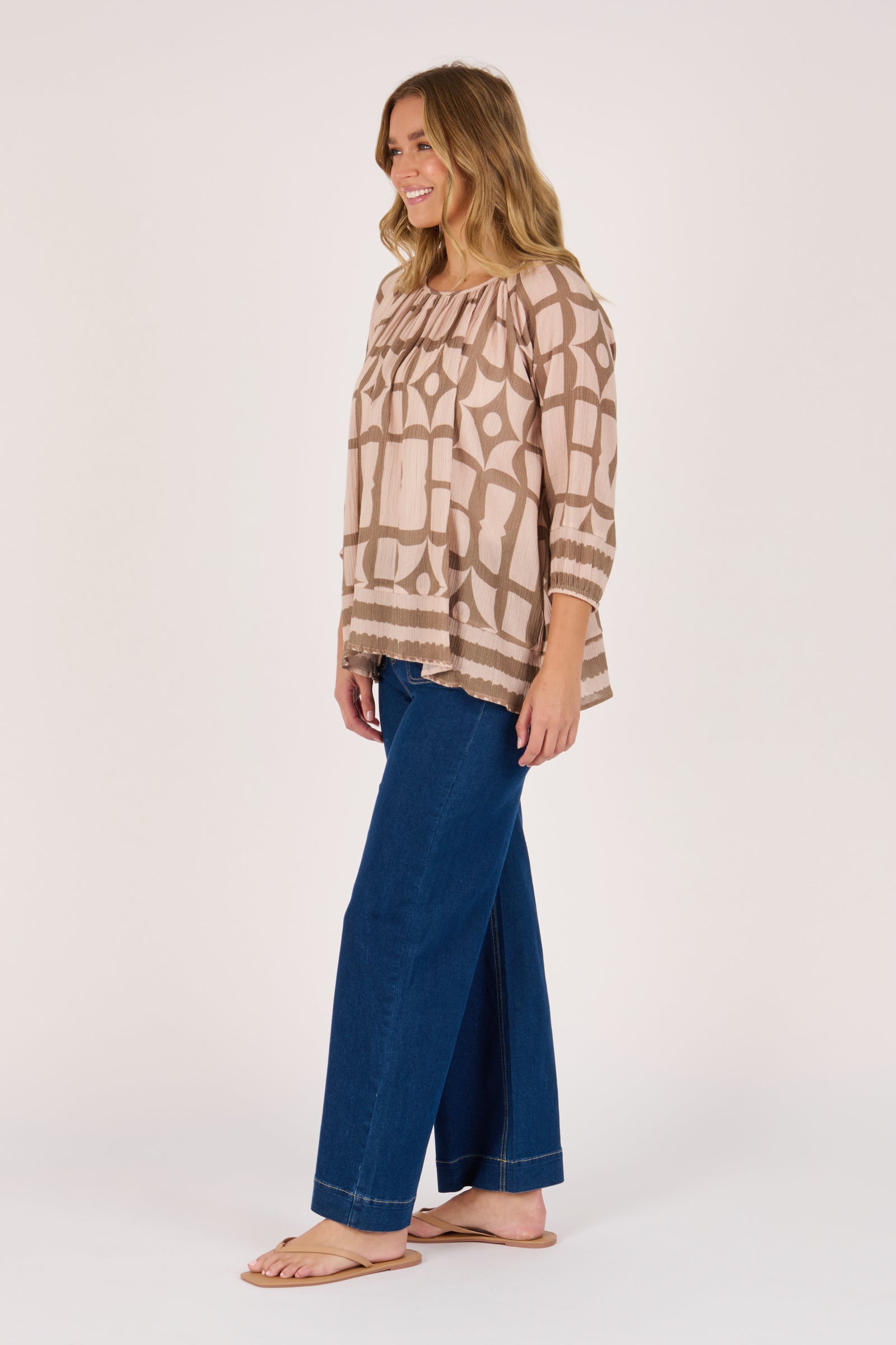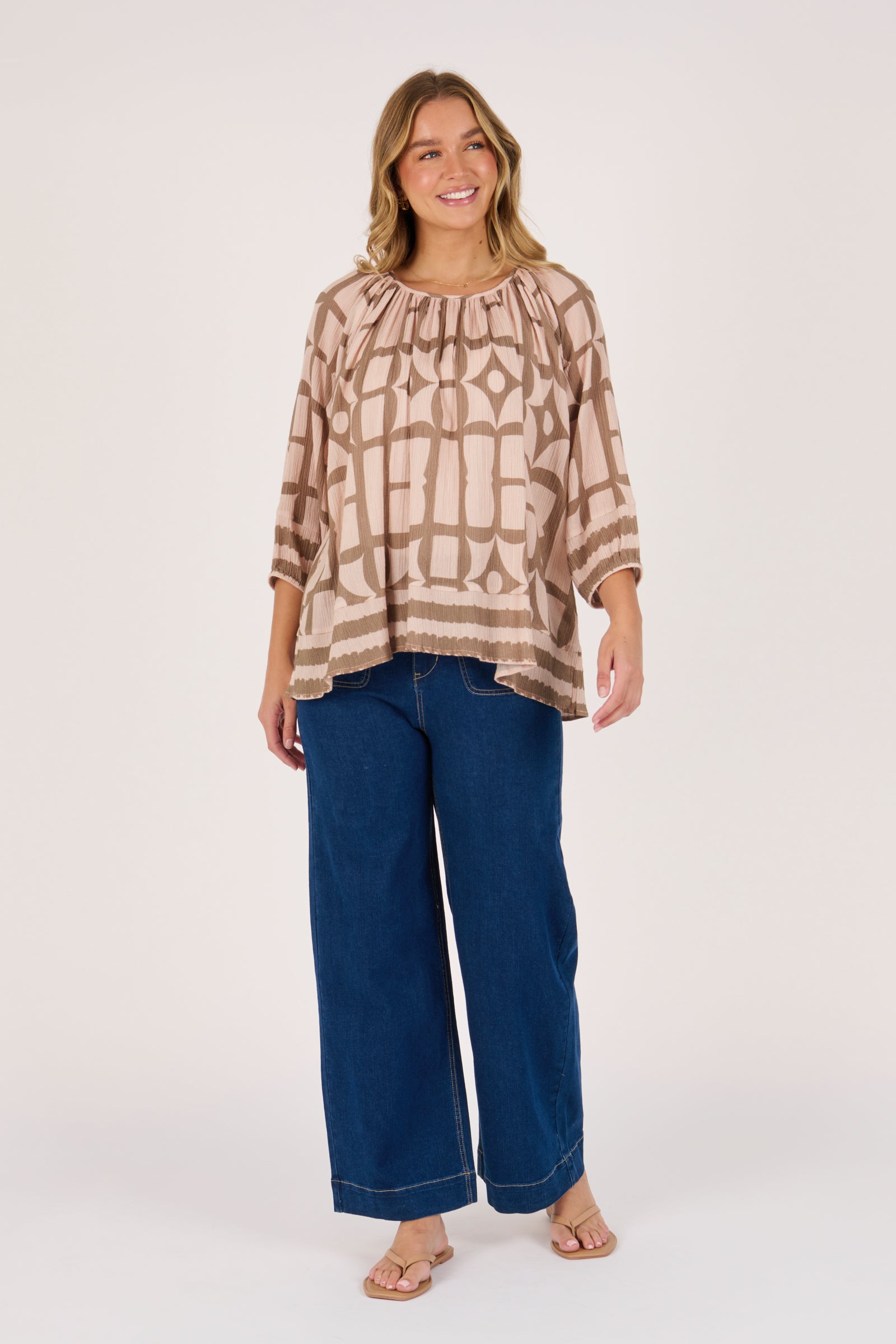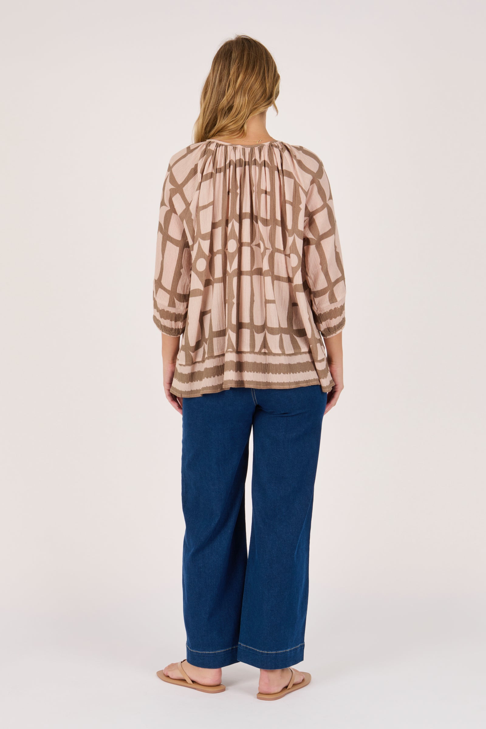 The Gathered Neck Blouse is designed with a relaxed silhouette and soft gathers around the neckline for effortless elegance. Crafted in 100% cotton, this blouse drapes beautifully and features a geometric print that makes it a standout piece for day-to-night dressing.