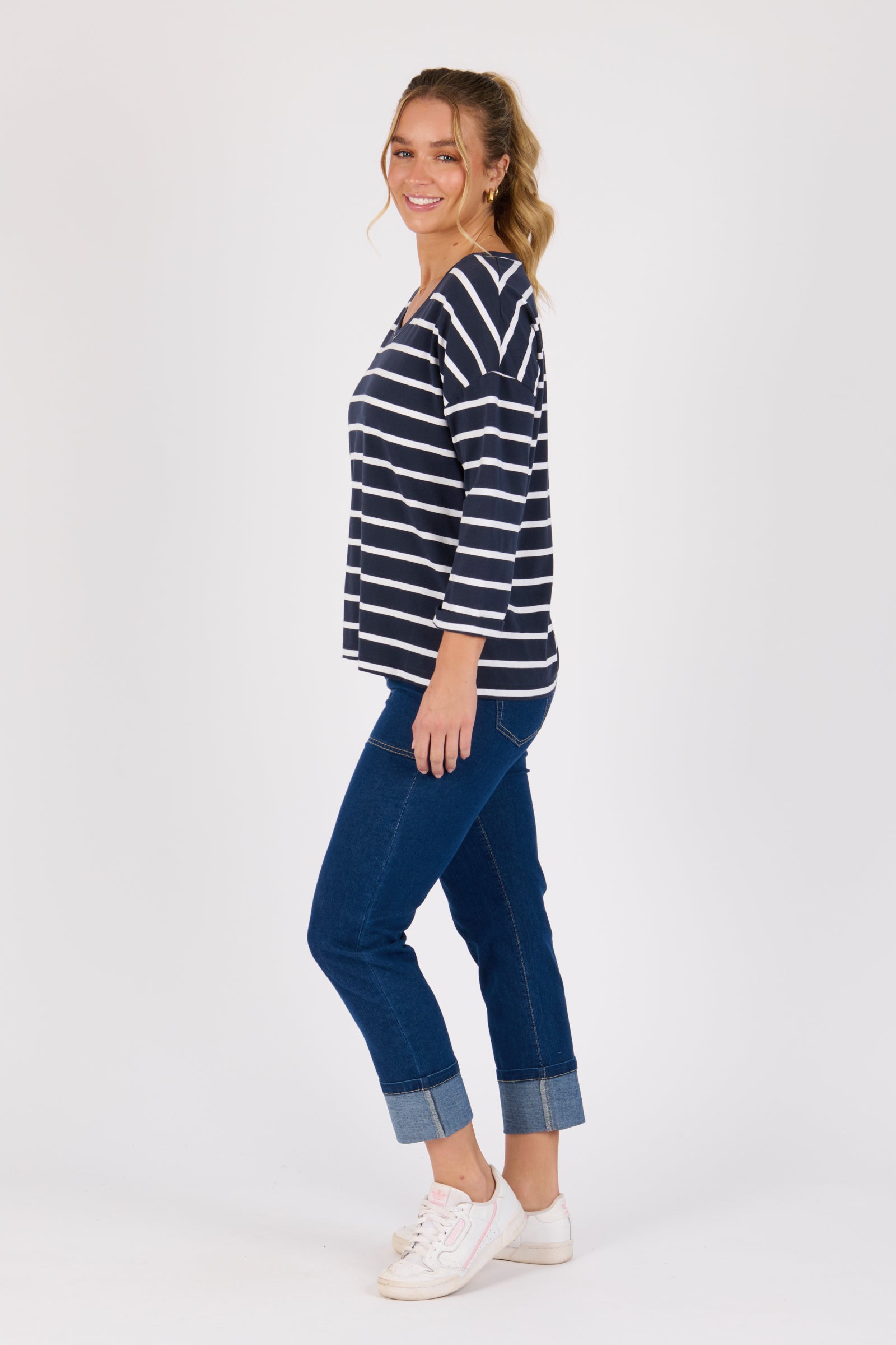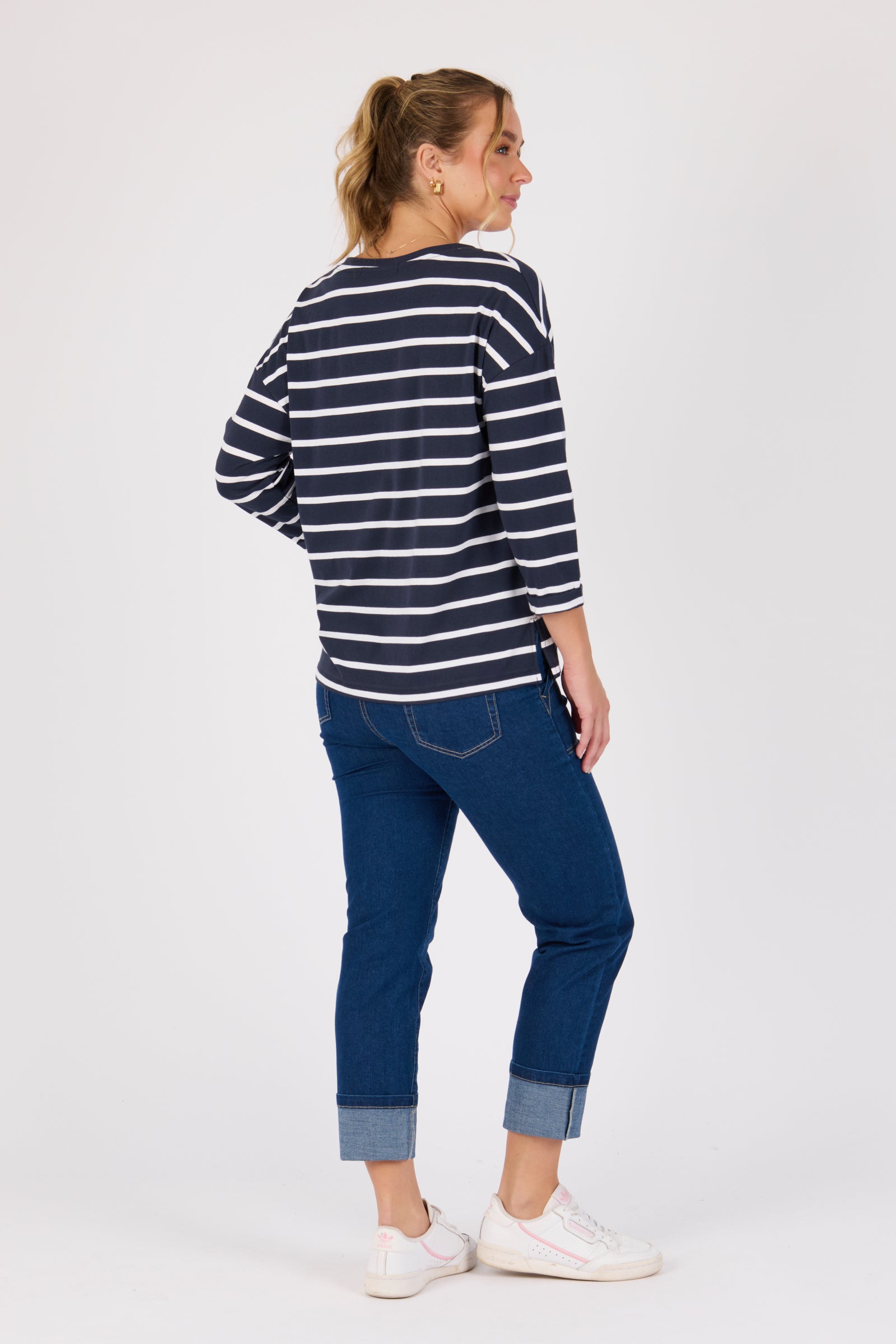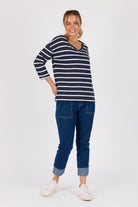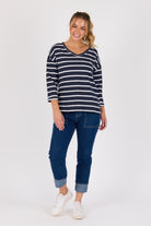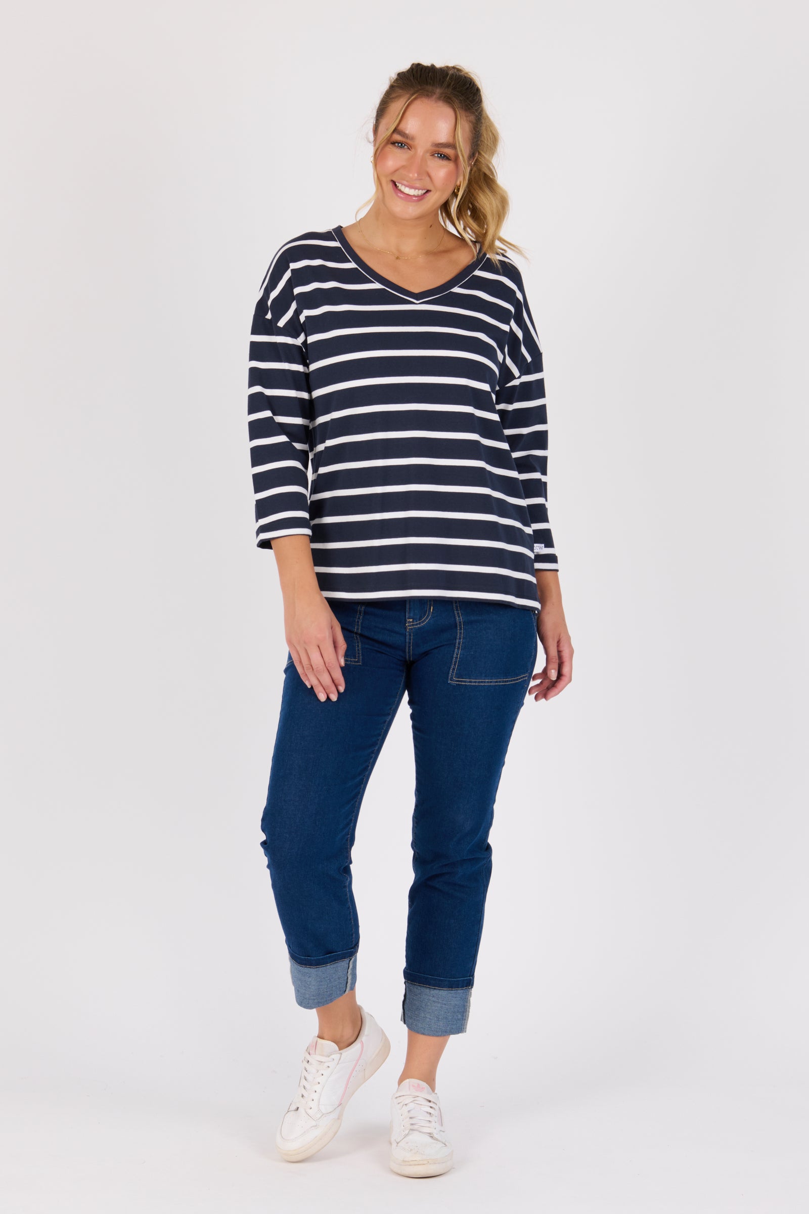 V-Neck 3/4 Sleeve Top - Navy/White Stripe