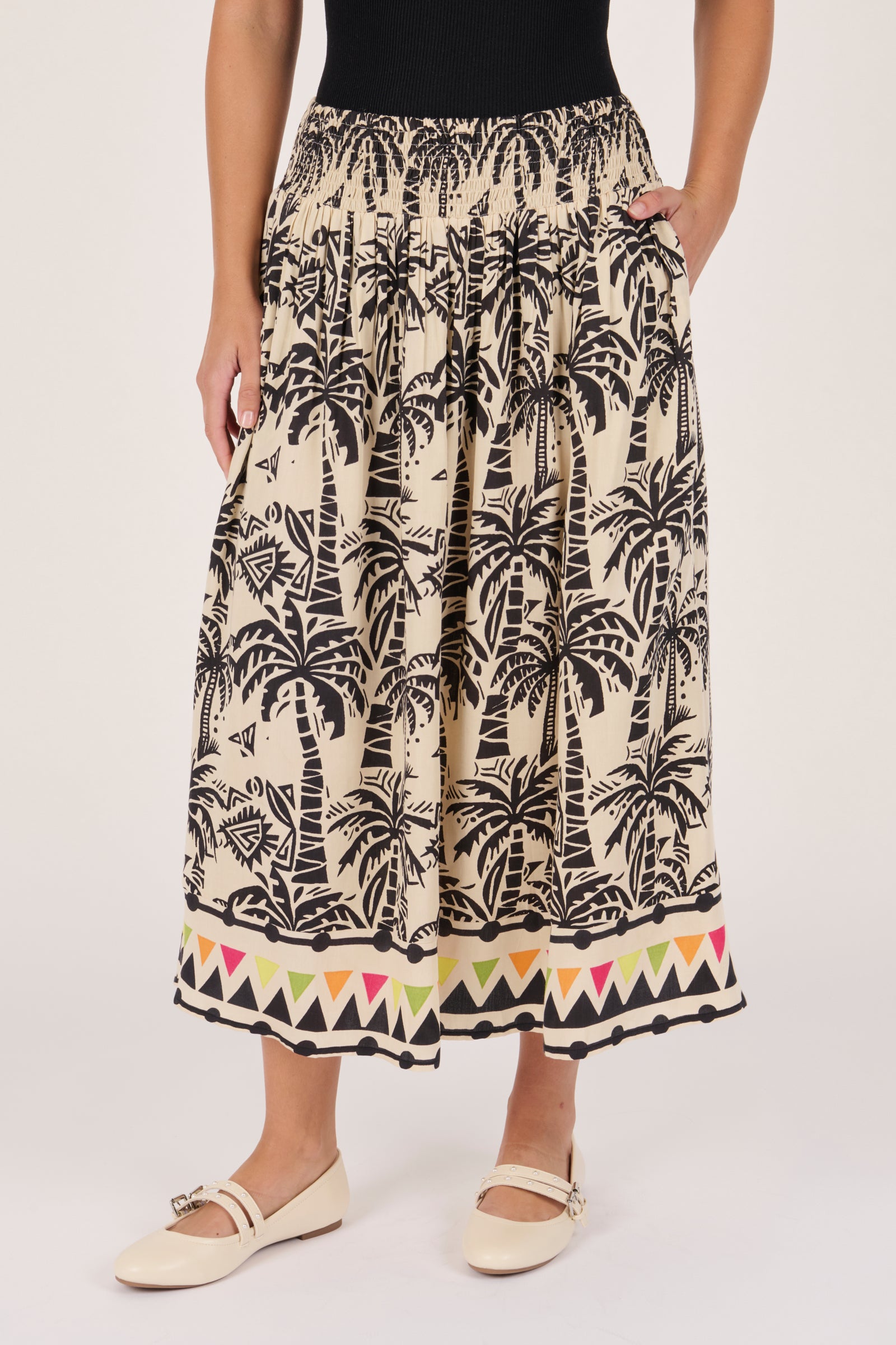 Shirred Waist Skirt - Black Palm Print