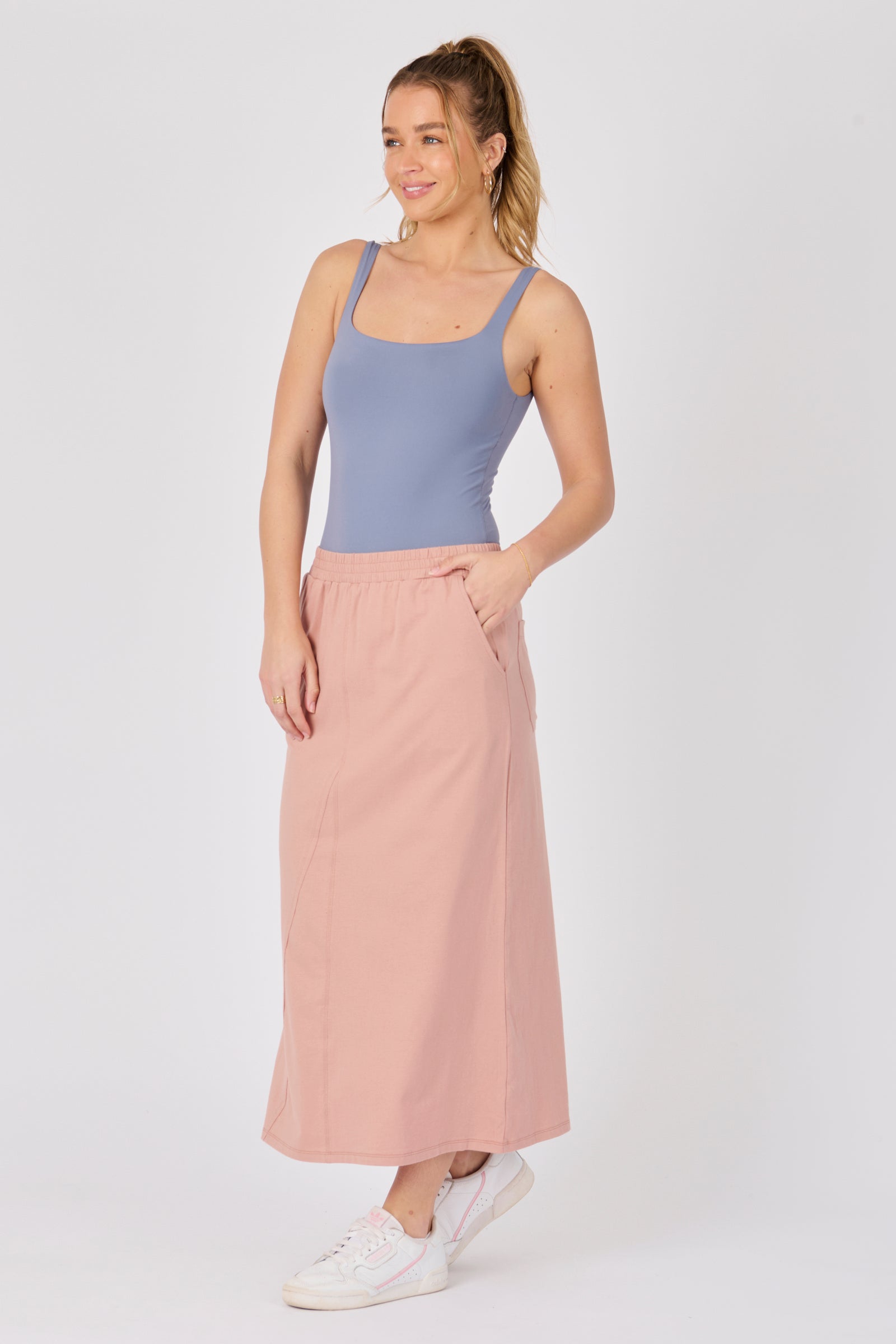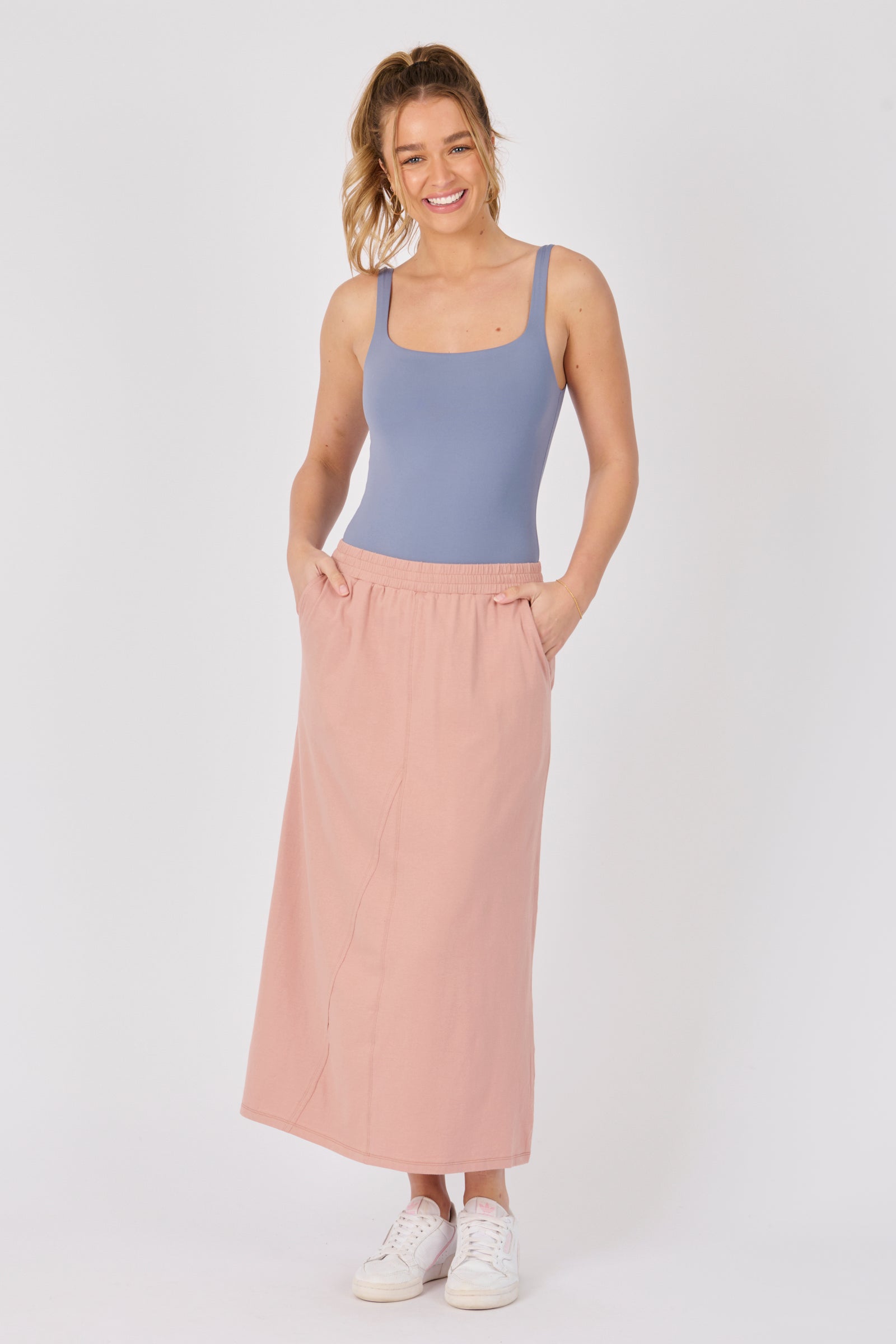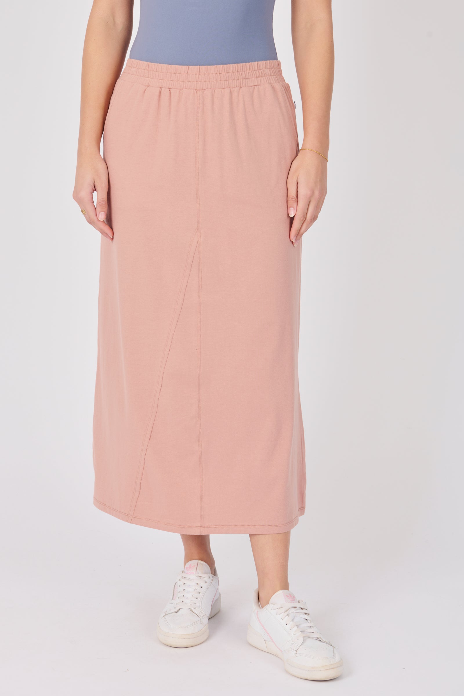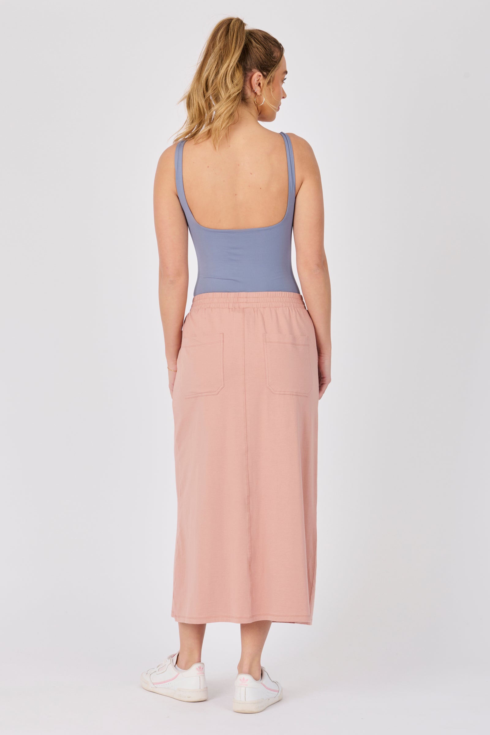 The midi length provides a flattering, versatile silhouette that falls gracefully below the knee, making it suitable for both casual and dressier occasions. The elastic waistband ensures a secure, comfortable fit that adapts to your body, while the addition of side seam pockets brings a functional and stylish touch, perfect for keeping your essentials close at hand.