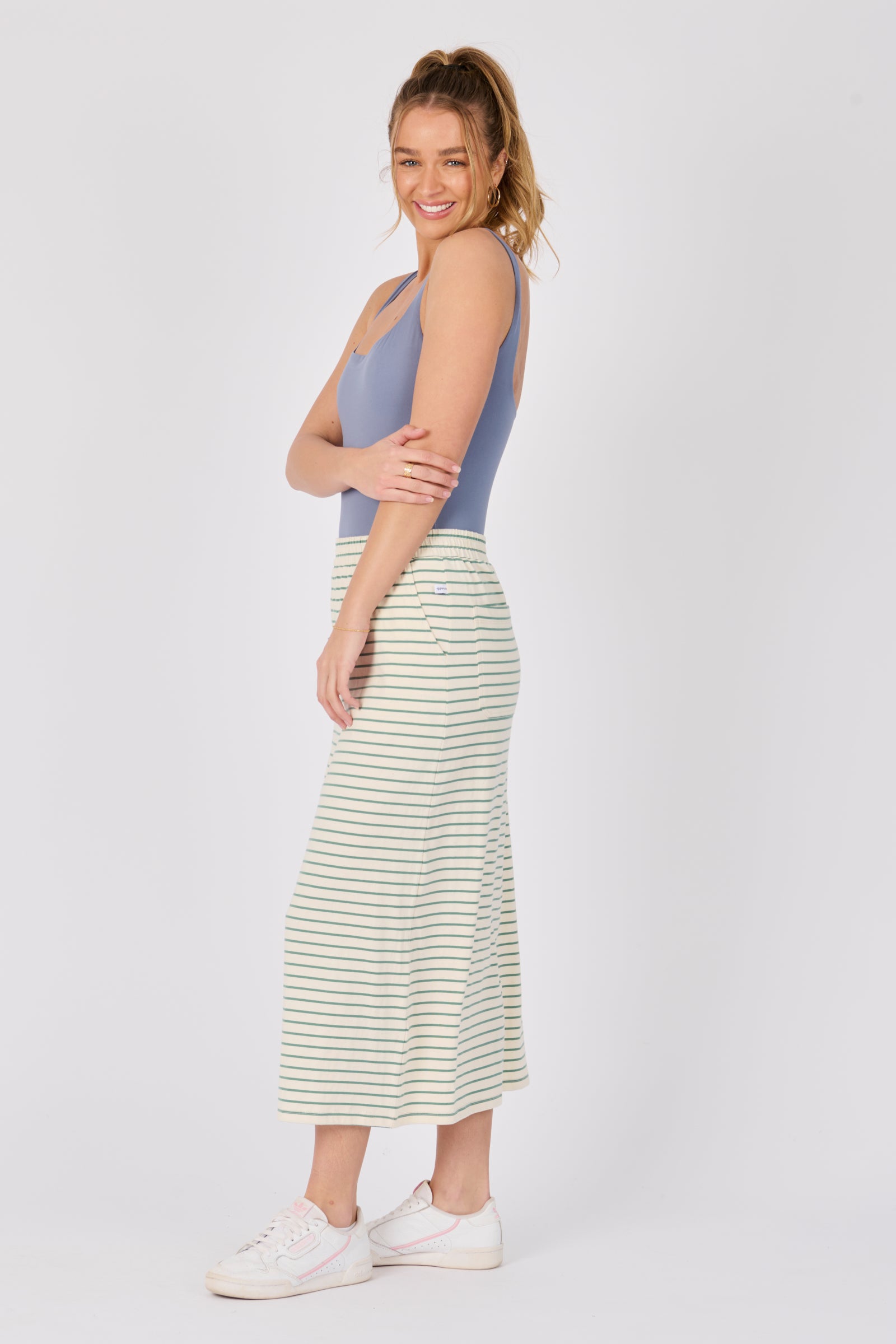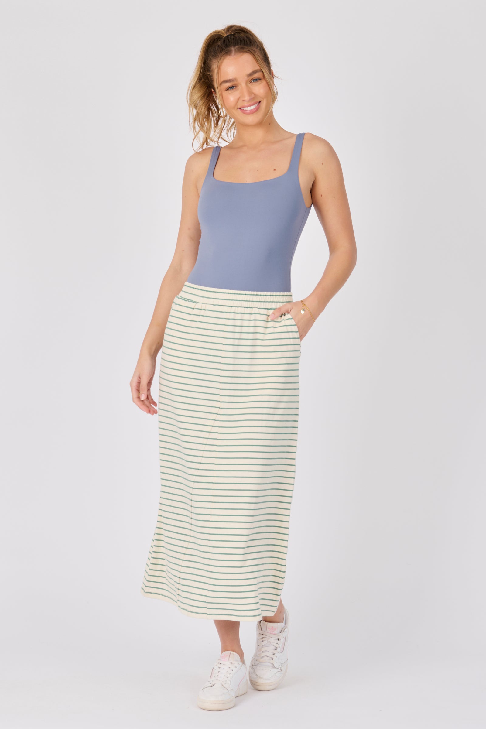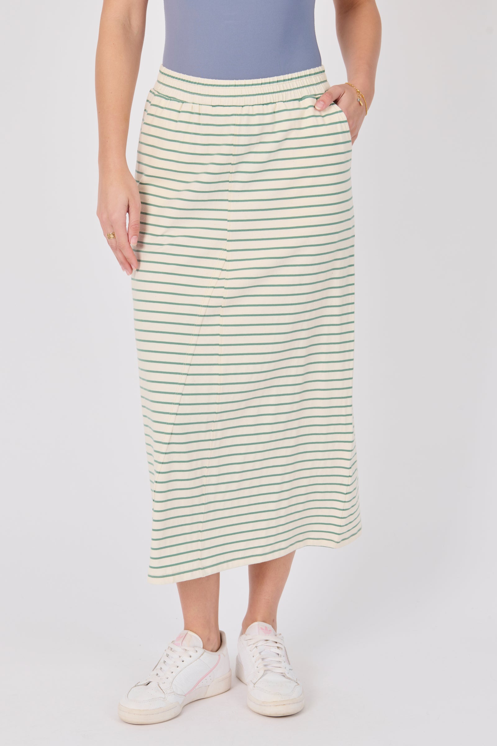The midi length provides a flattering, versatile silhouette that falls gracefully below the knee, making it suitable for both casual and dressier occasions. The elastic waistband ensures a secure, comfortable fit that adapts to your body, while the addition of side seam pockets brings a functional and stylish touch, perfect for keeping your essentials close at hand.