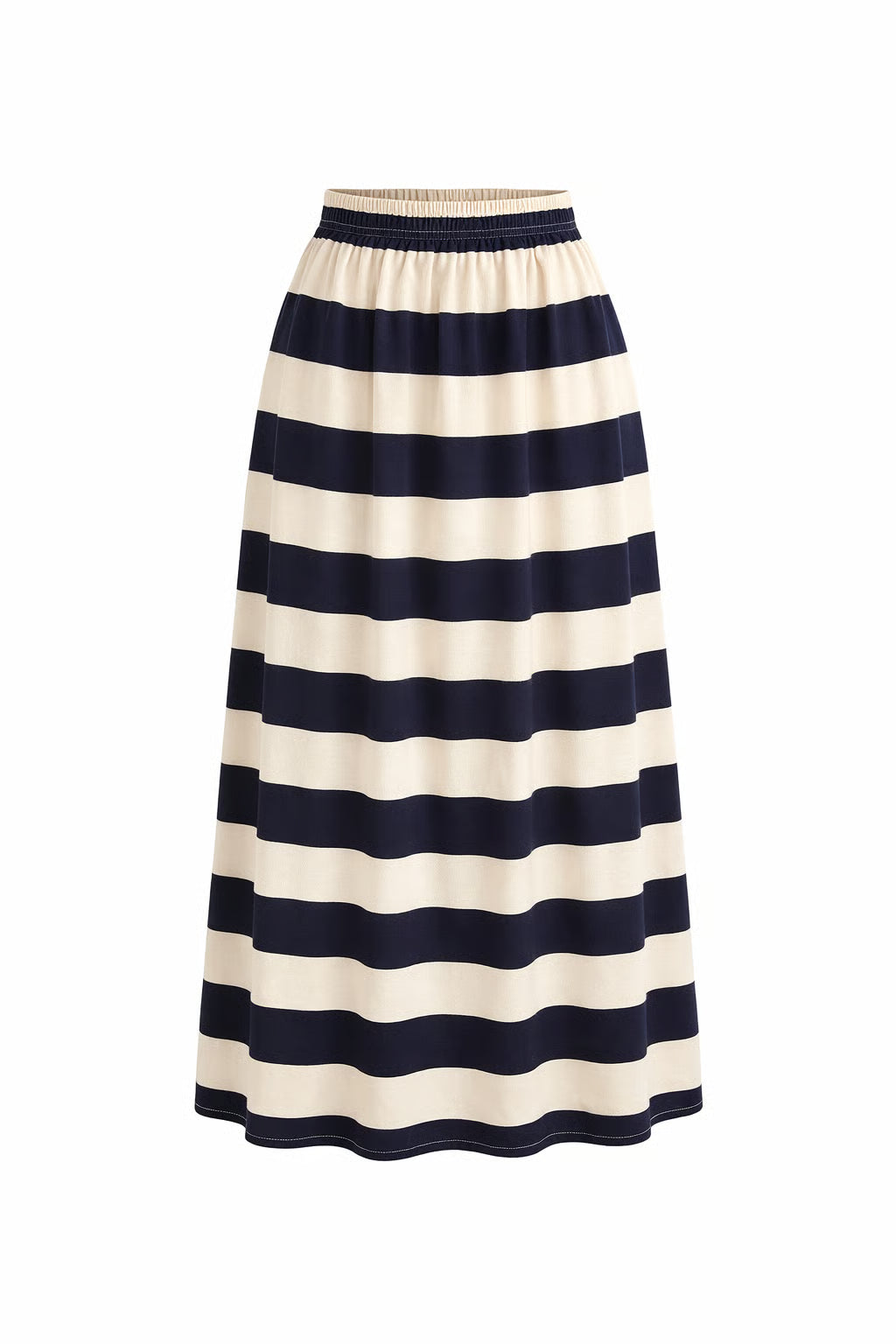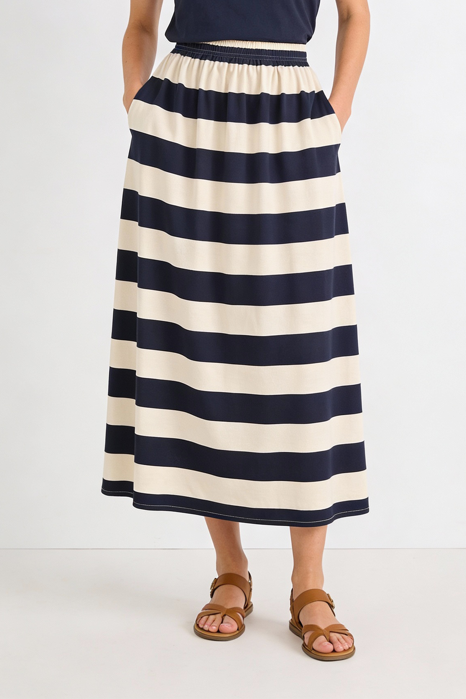 The Shirred Waist Maxi Skirt in Navy Stripe is an effortless wardrobe staple designed for comfort and easy everyday wear. Featuring a soft, shirred waistband and a flowing maxi length, this skirt offers a flattering silhouette with relaxed movement. Crafted from a lightweight viscose blend with added stretch, it drapes beautifully while remaining comfortable all day long. The classic navy stripe adds a timeless finish, making it easy to dress up or down.