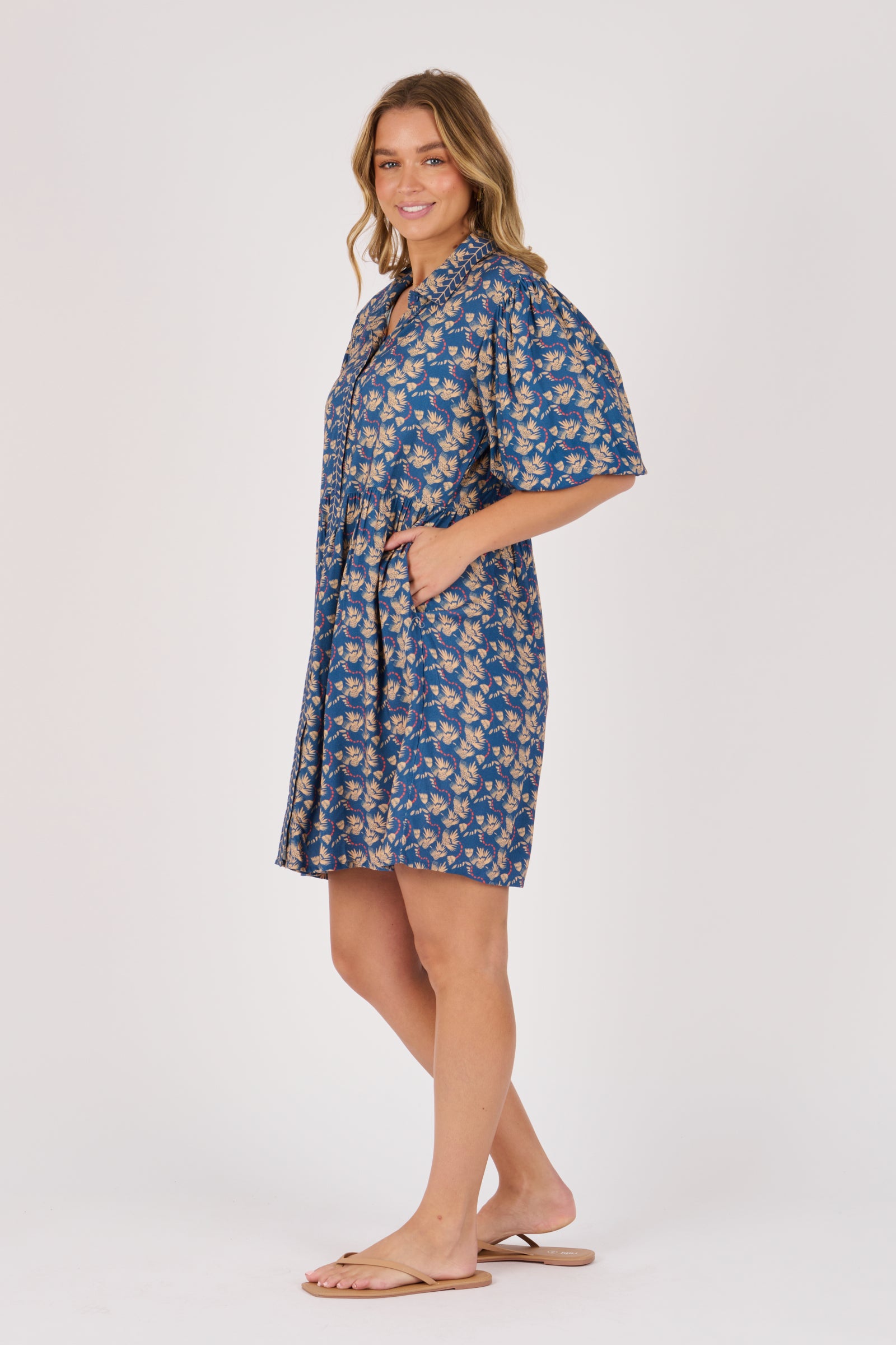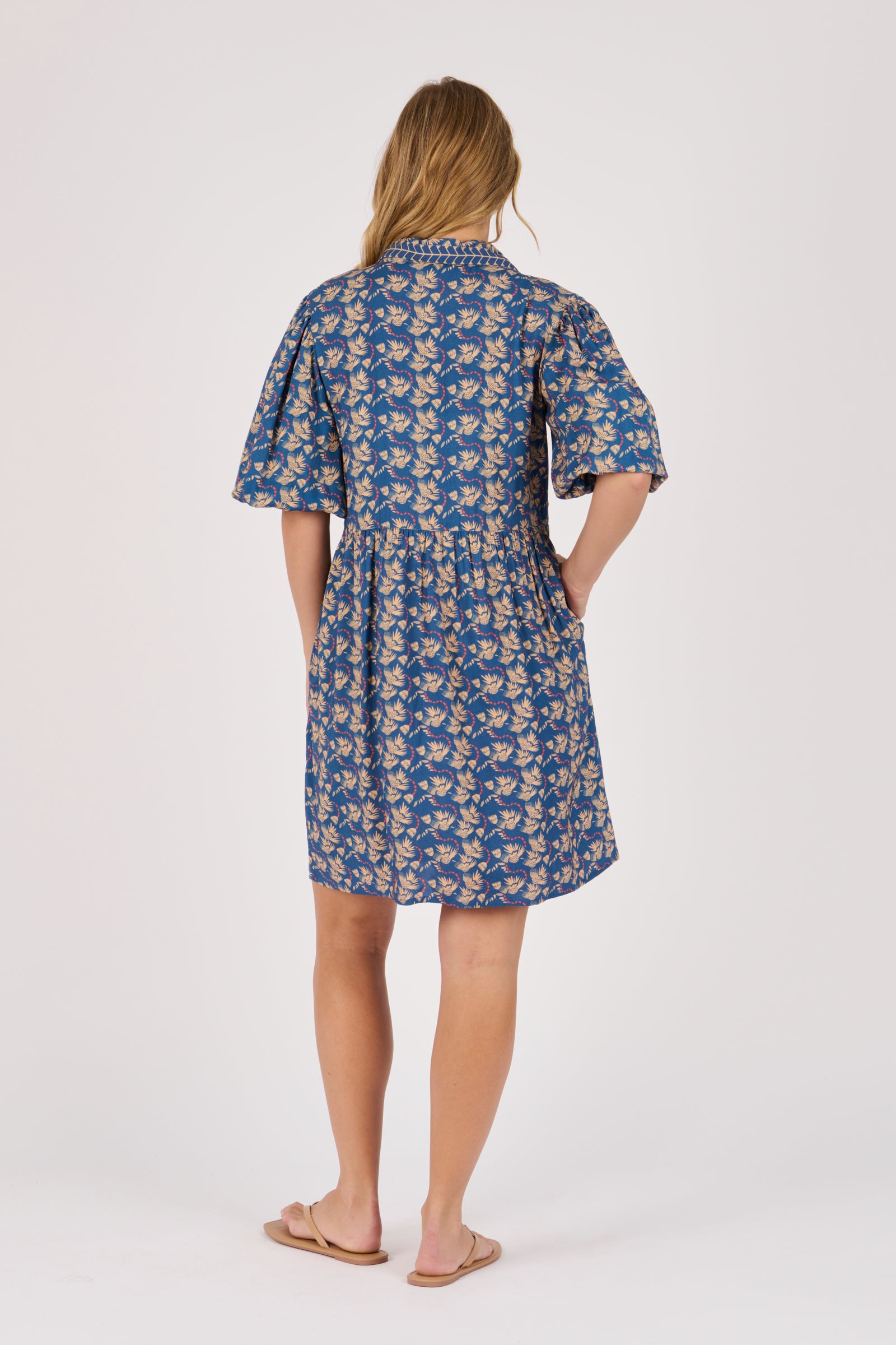 The Bubble Sleeve Dress in Navy Floral is crafted from lightweight 100% Viscose for a soft, breathable feel. Designed with a button-through front, gathered waist seam, and statement bubble sleeves, this dress offers easy, everyday style with a feminine touch. The navy floral print brings timeless charm, perfect for pairing with sandals or slides for relaxed summer days.