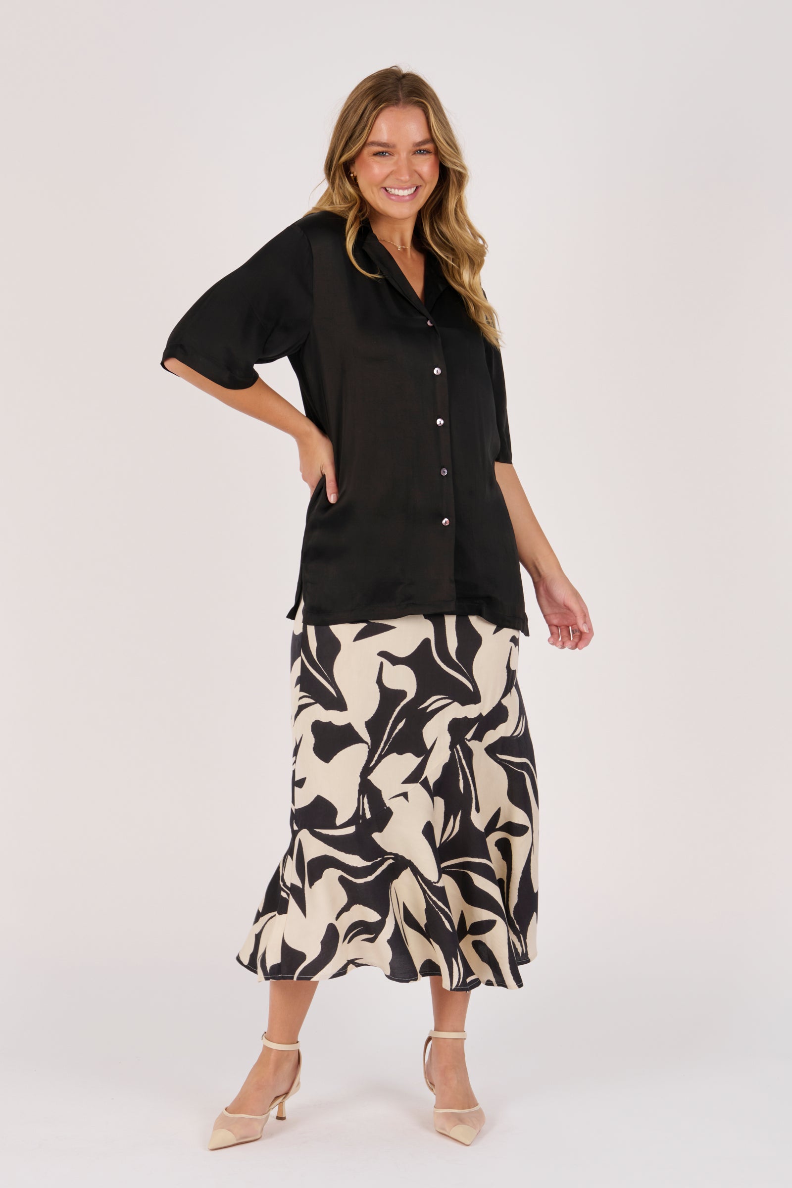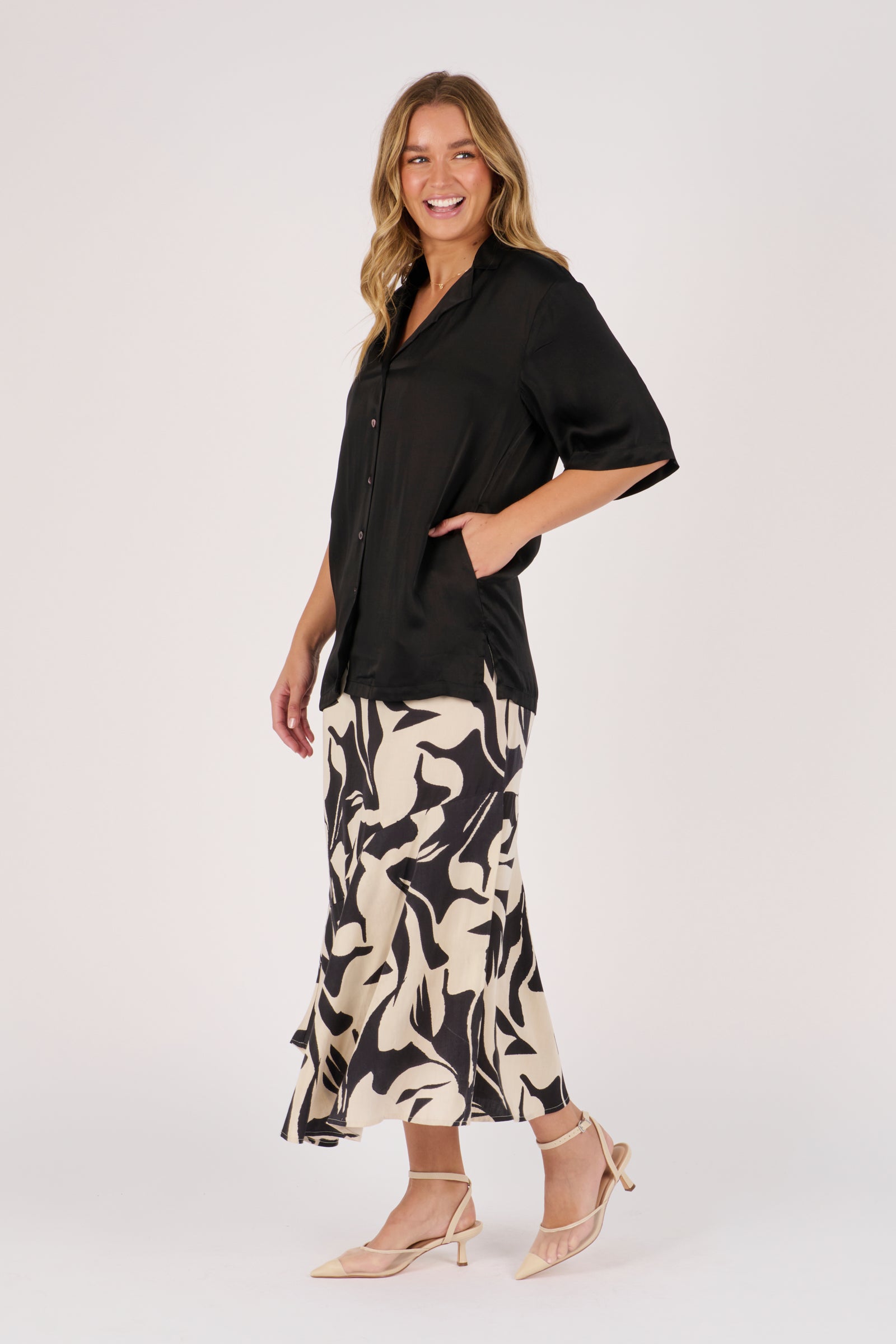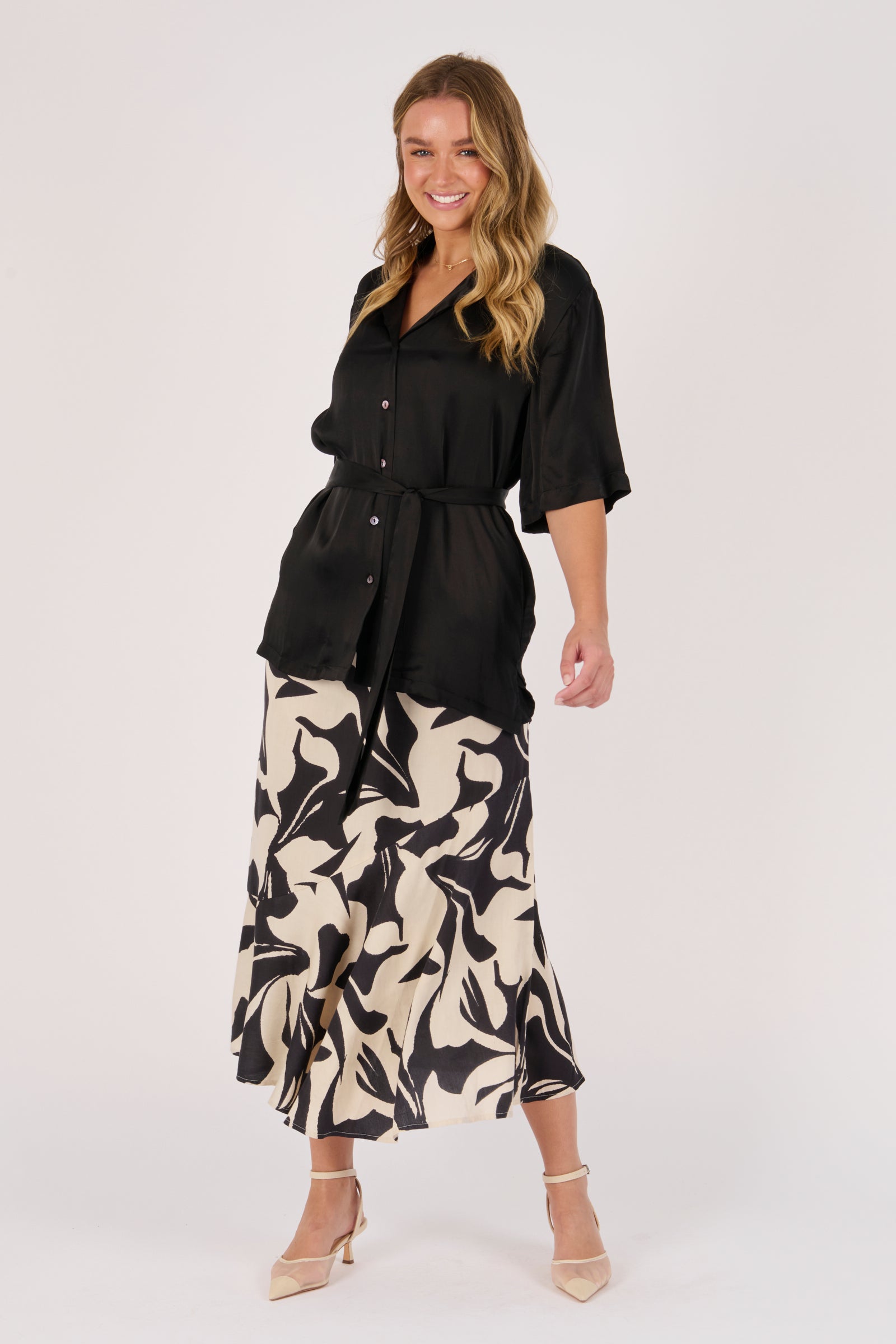 The Belted Shirt in Black brings a modern edge to a classic silhouette. Crafted from 100% viscose bambra satin, it features a bold abstract print, button-through front, and waist tie belt for versatile styling.