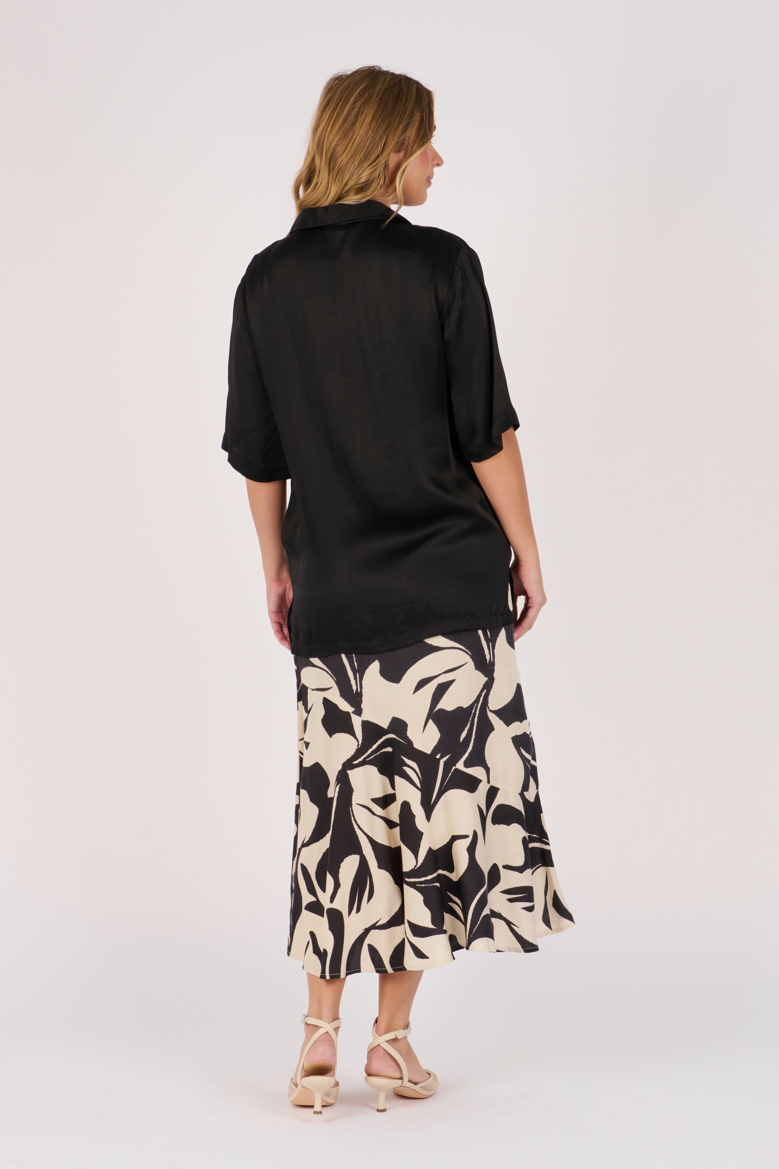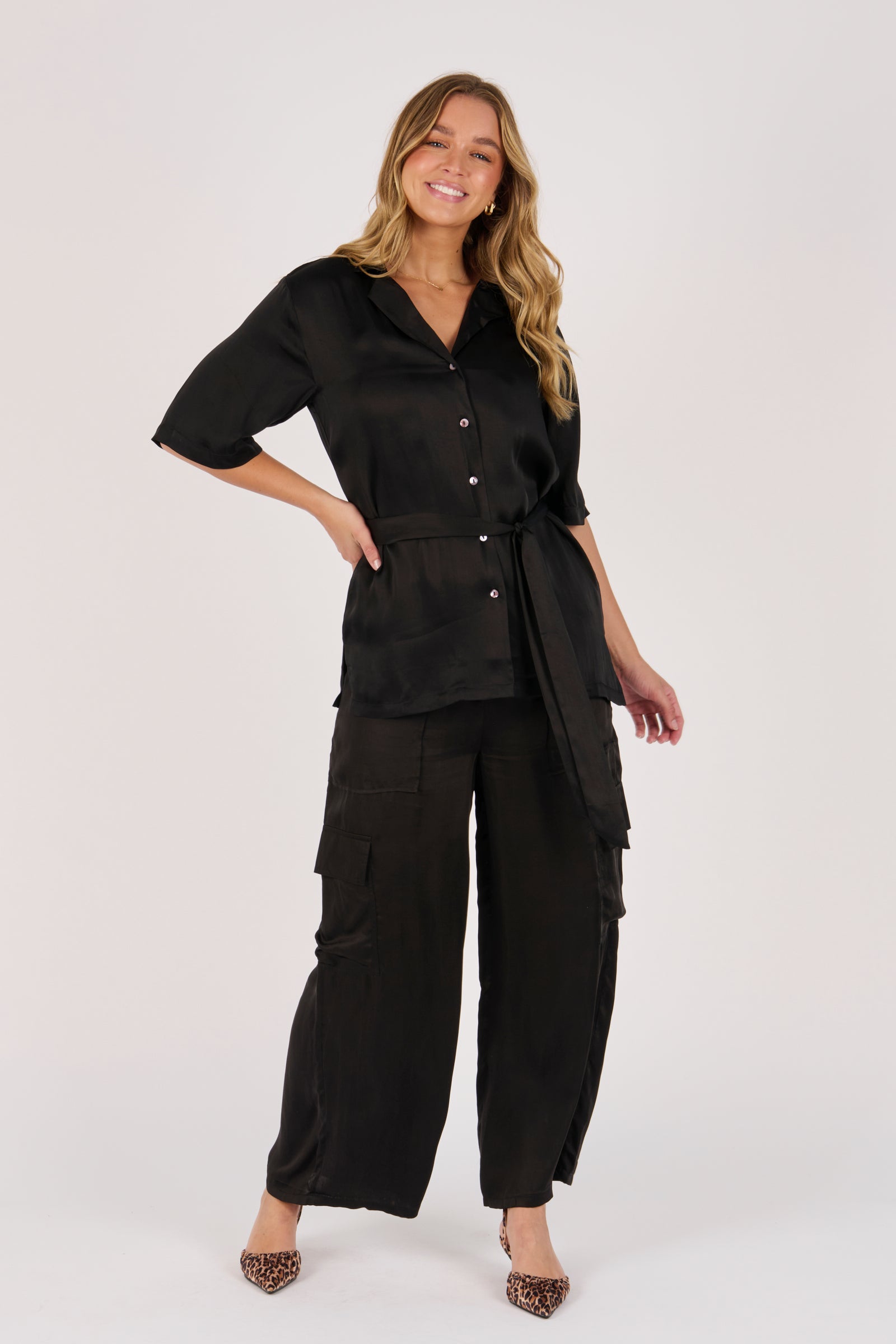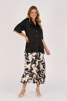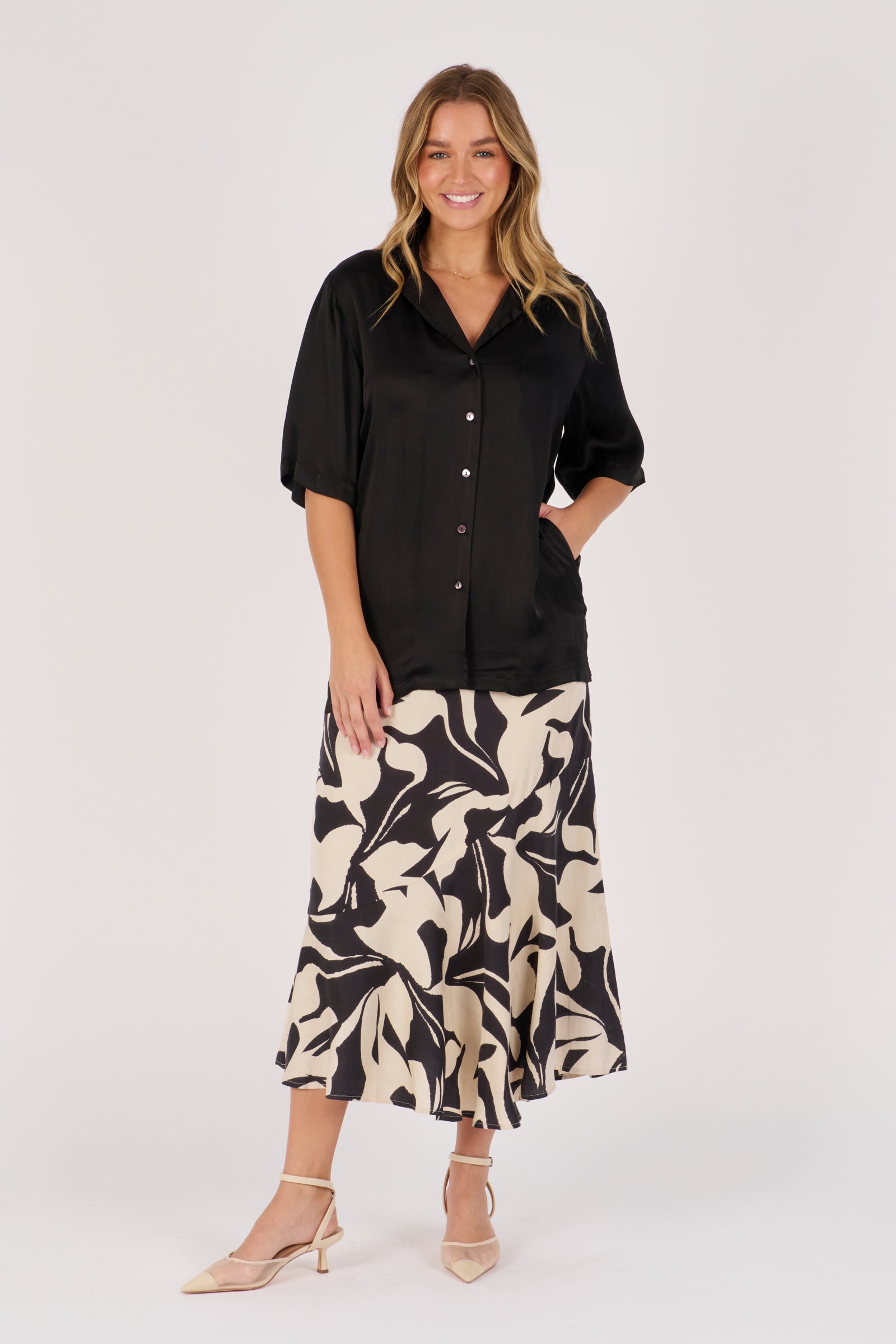 The Belted Shirt in Black brings a modern edge to a classic silhouette. Crafted from 100% viscose bambra satin, it features a bold abstract print, button-through front, and waist tie belt for versatile styling.