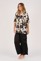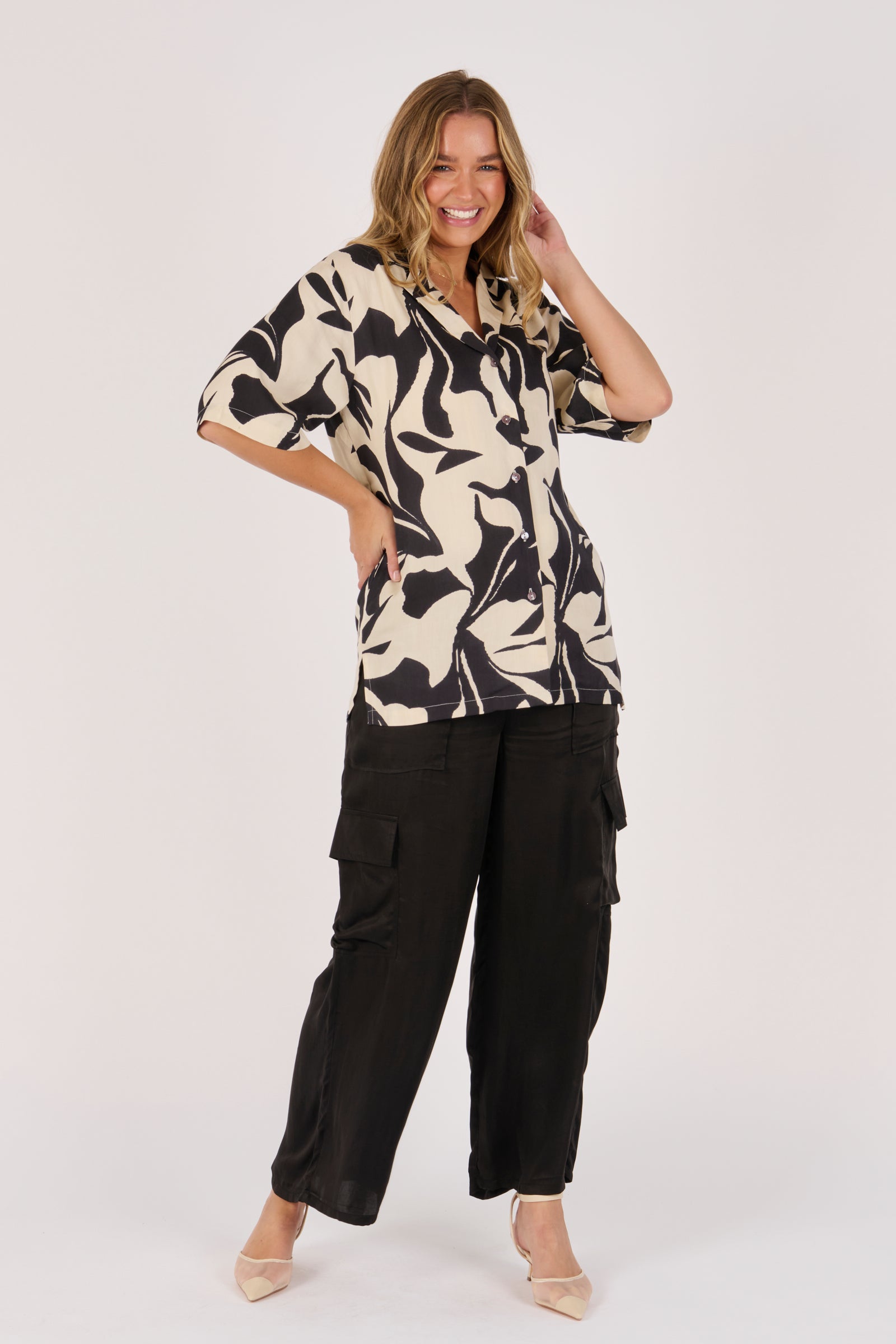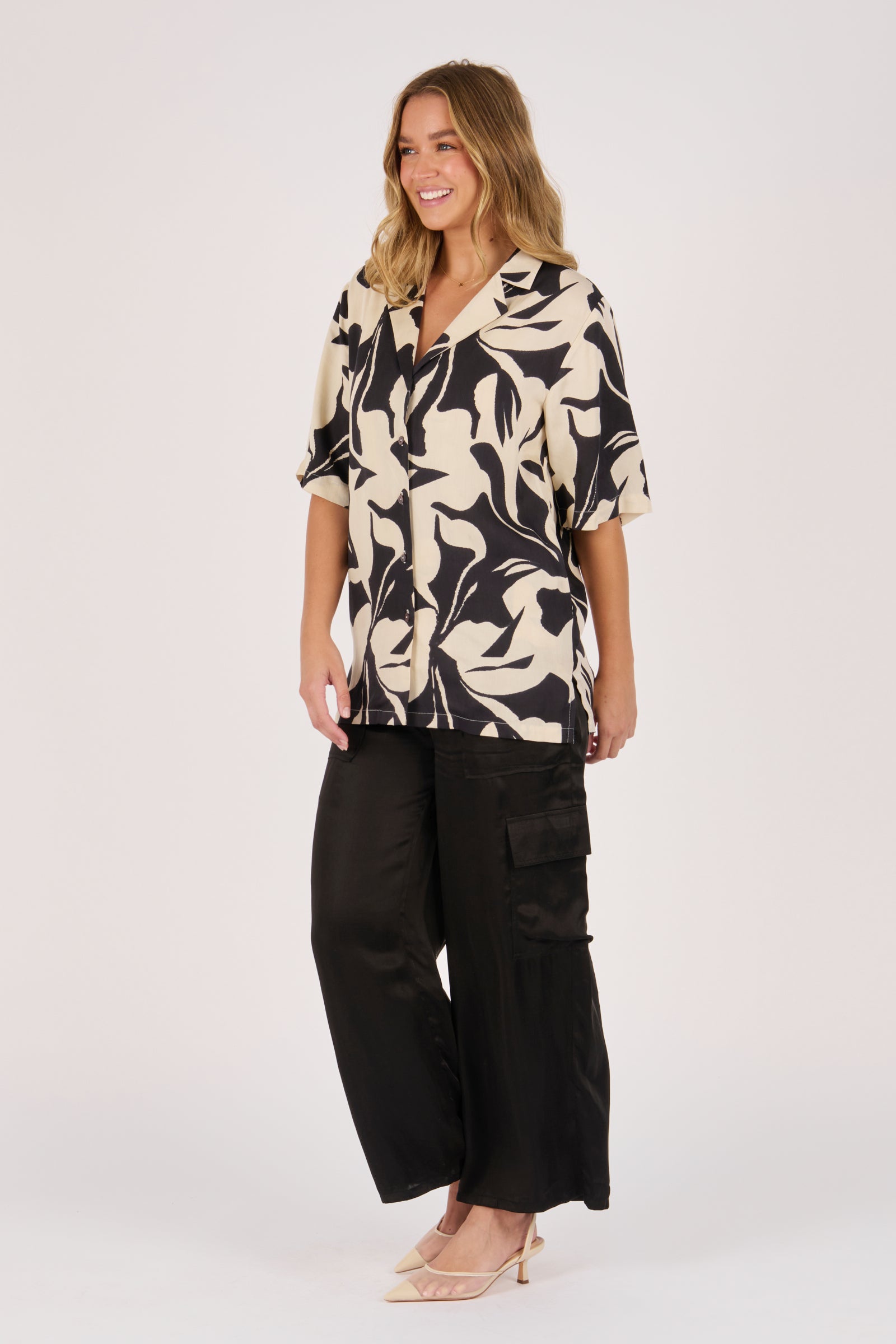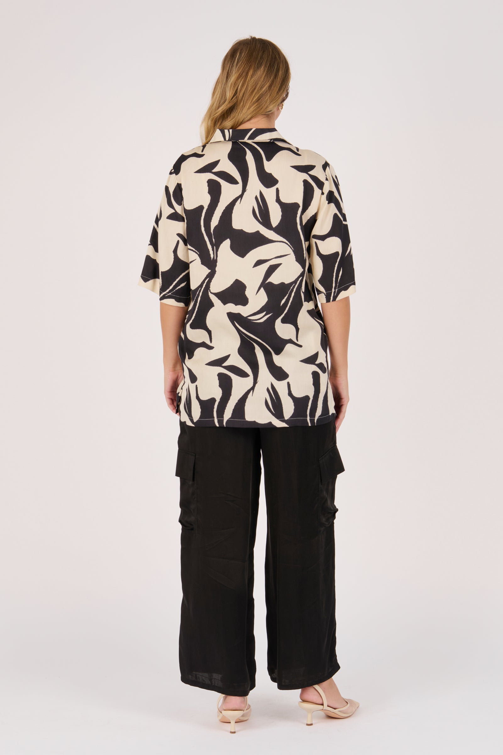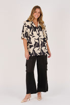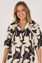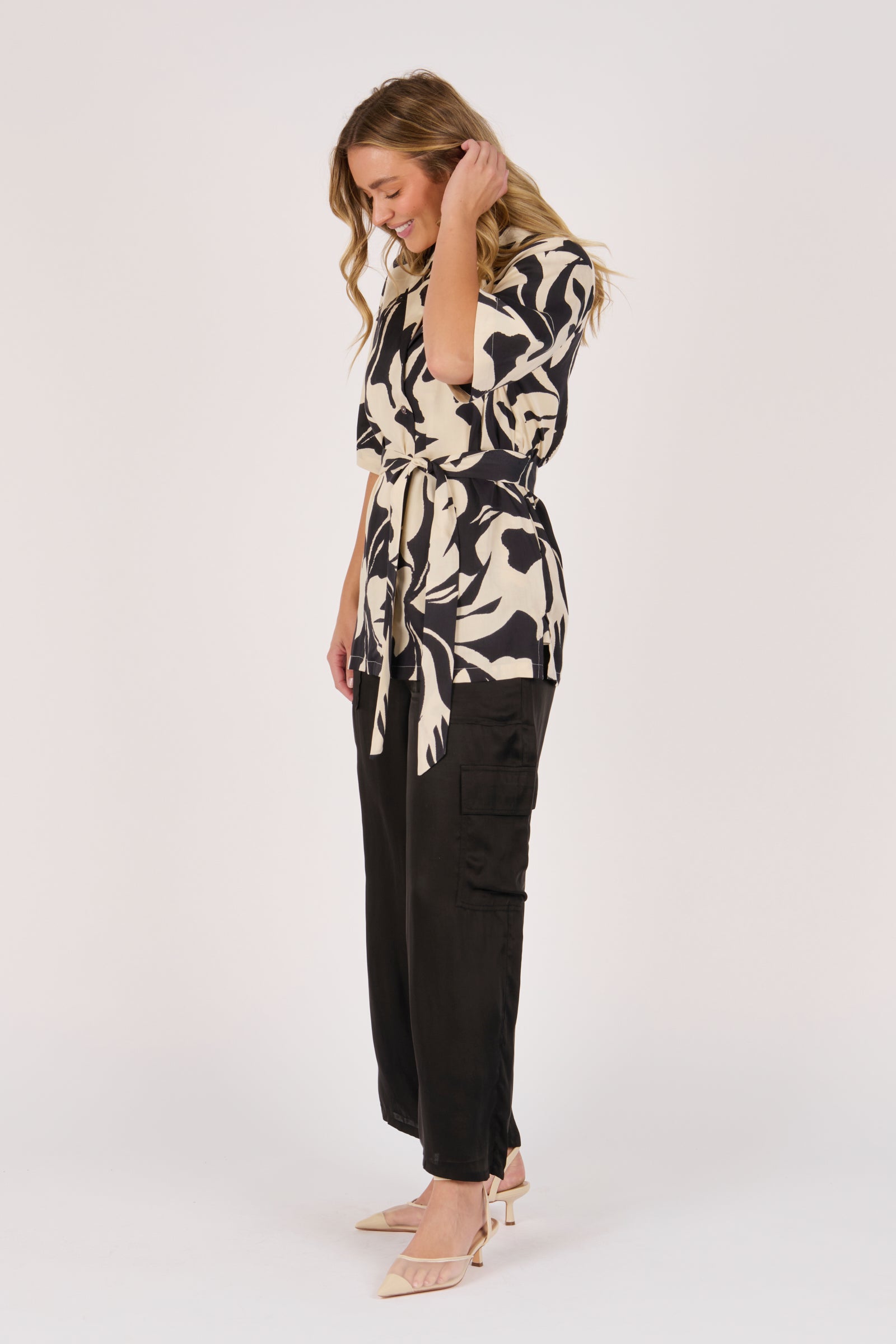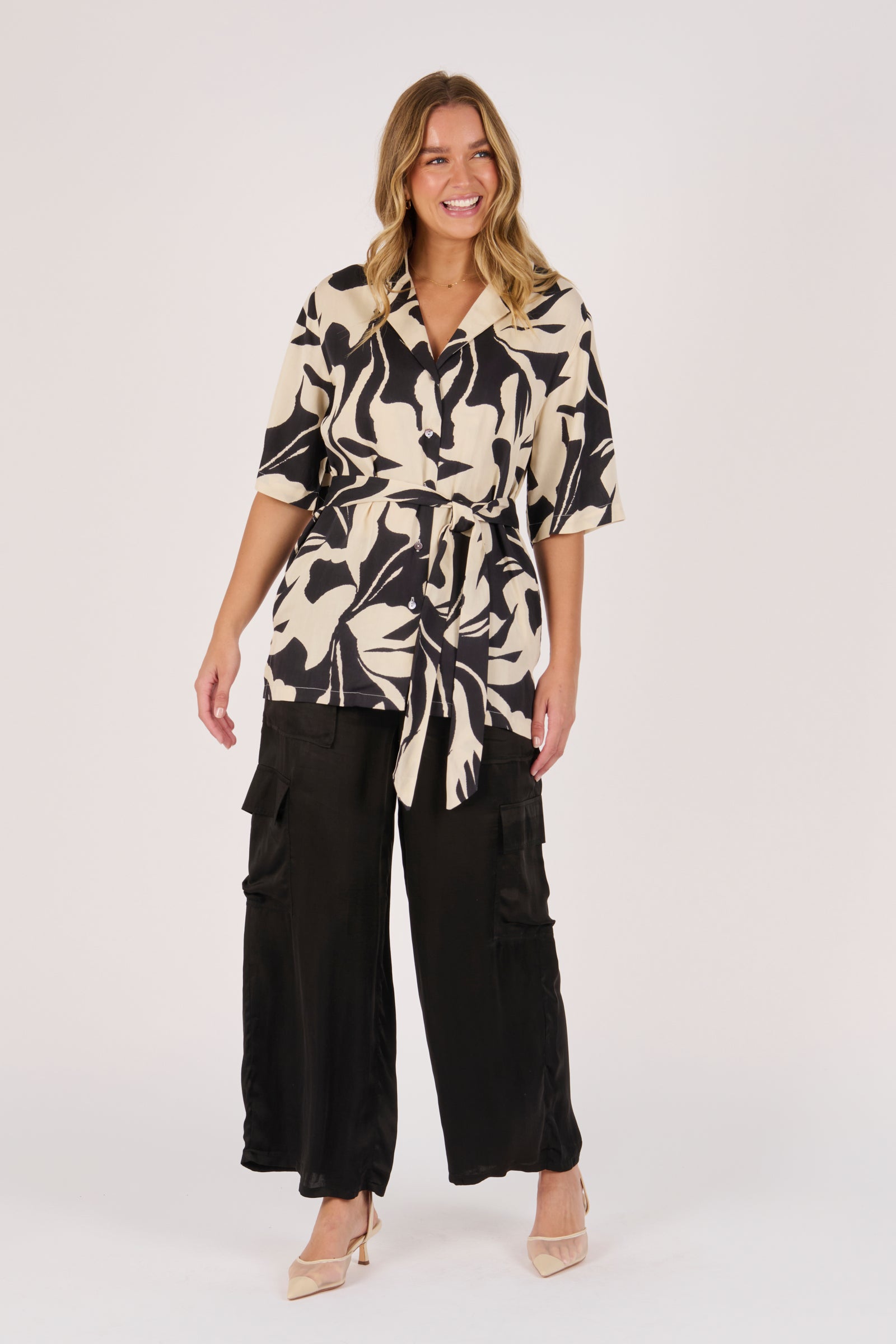 The Belted Shirt in Ecru and Black Swirl brings a modern edge to a classic silhouette. Crafted from 100% viscose satin twill, it features a bold abstract print, button-through front, and waist tie belt for versatile styling.