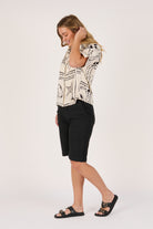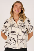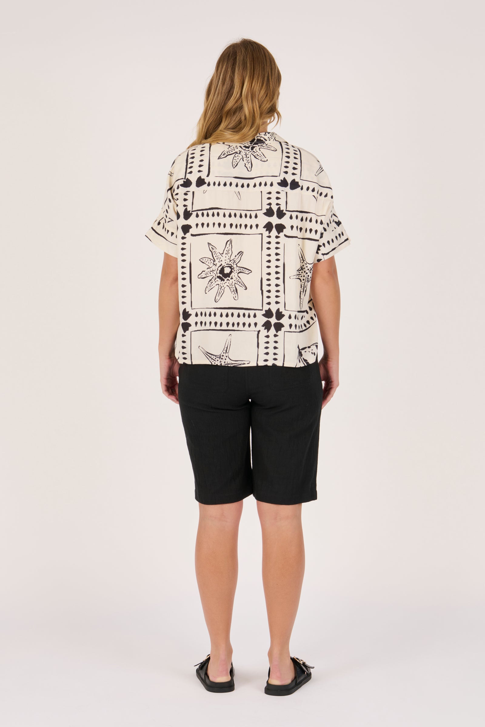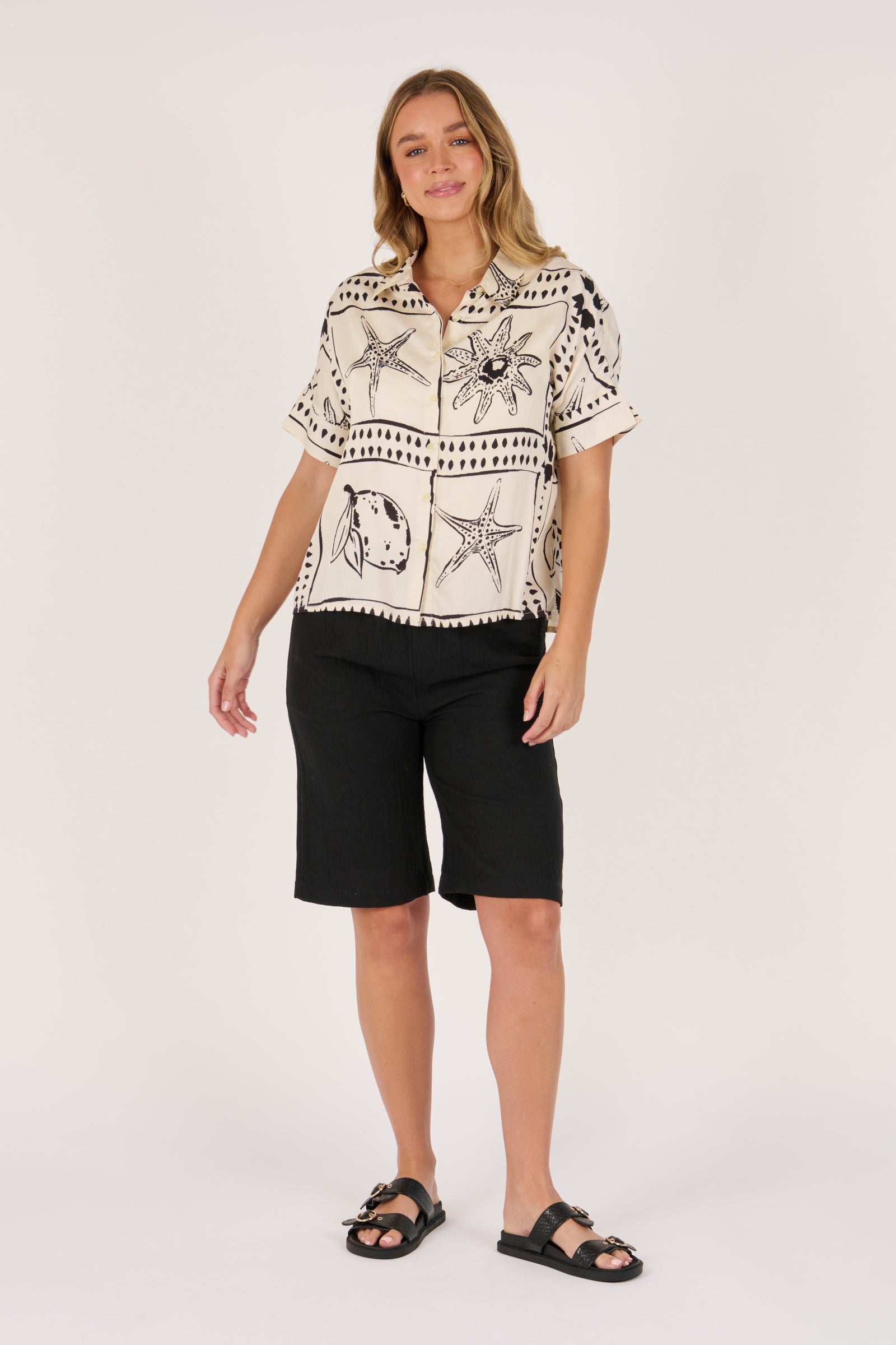 Relaxed and versatile, the Boxy Shirt in Sand Shell is crafted from 100% viscose satin twill for a soft, fluid drape with a subtle sheen. Featuring a statement shell-inspired print, collared neckline, and short sleeves, it’s the perfect throw-on shirt for effortless summer styling.