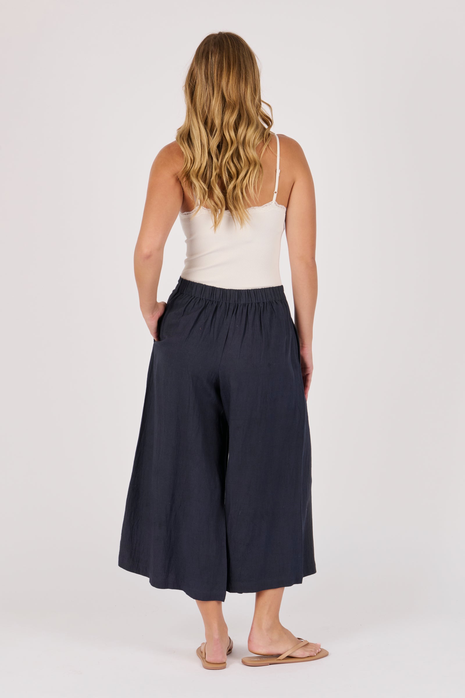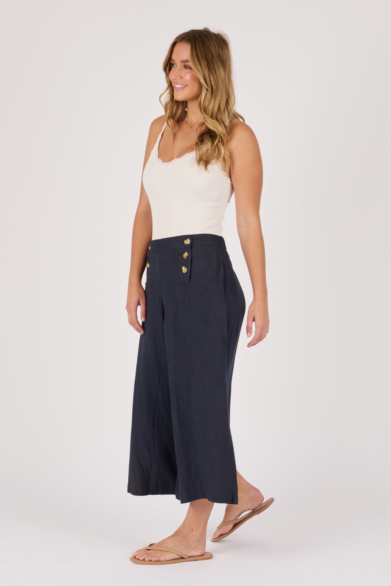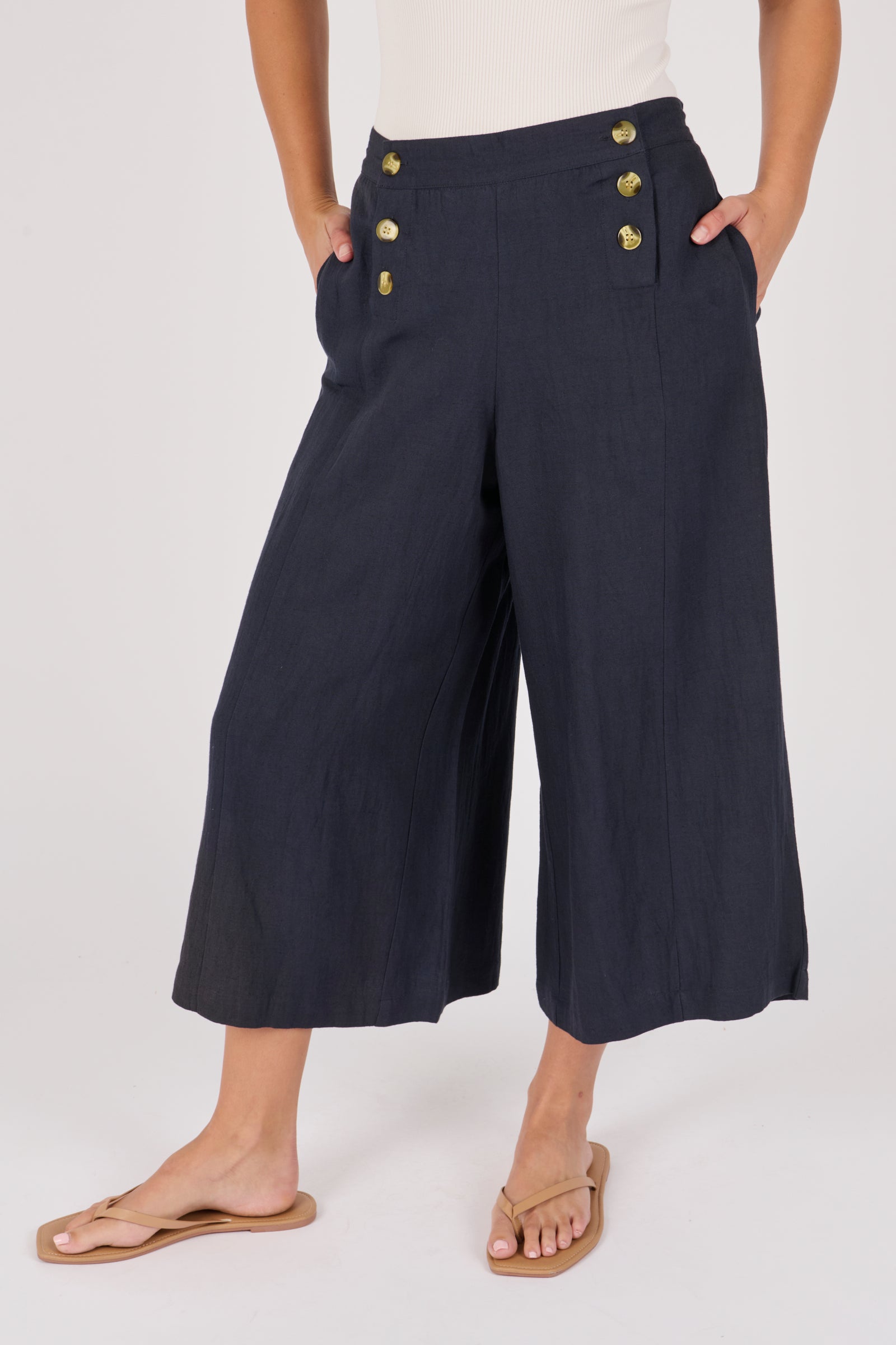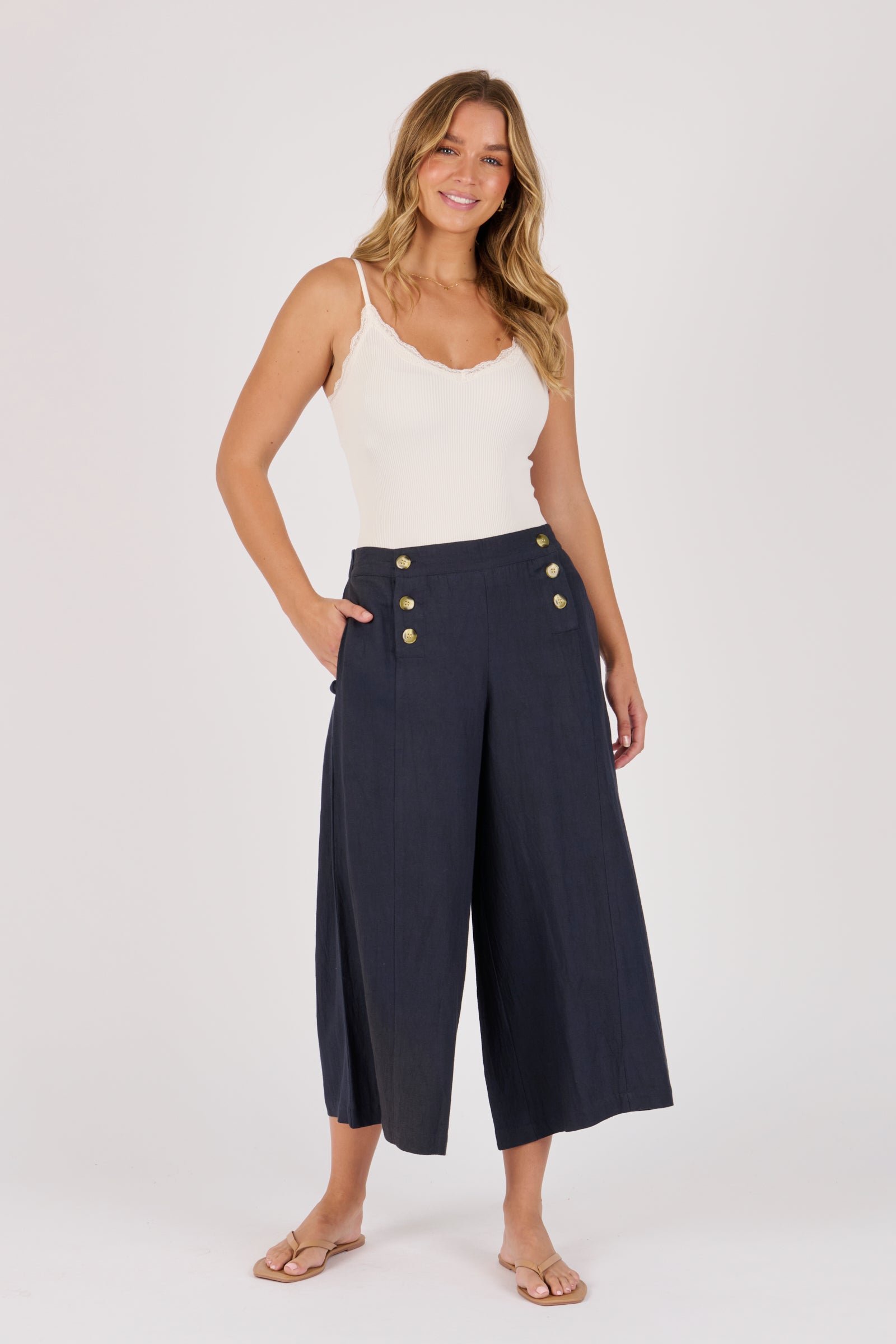 The Button Detail Pant in Blue is crafted from a soft blend of 85% Viscose and 15% Flax for lightweight comfort and breathability. Featuring a flattering wide-leg silhouette, cropped length, and statement button detailing, these pants blend everyday ease with elevated style. Perfect for pairing with fitted tops or relaxed blouses for a polished summer look.