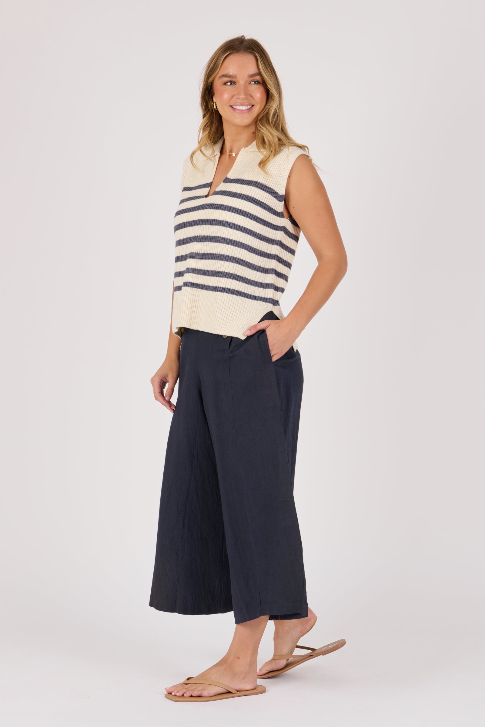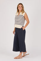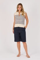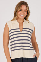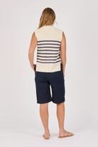 is crafted from 100% Acrylic for a soft, lightweight knit feel. Designed with a classic stripe pattern, open V-neckline, and a relaxed fit through the body, this vest is the perfect layering piece for trans-seasonal styling. Effortlessly chic when worn over a crisp shirt or on its own with wide-leg pants for a modern coastal look.