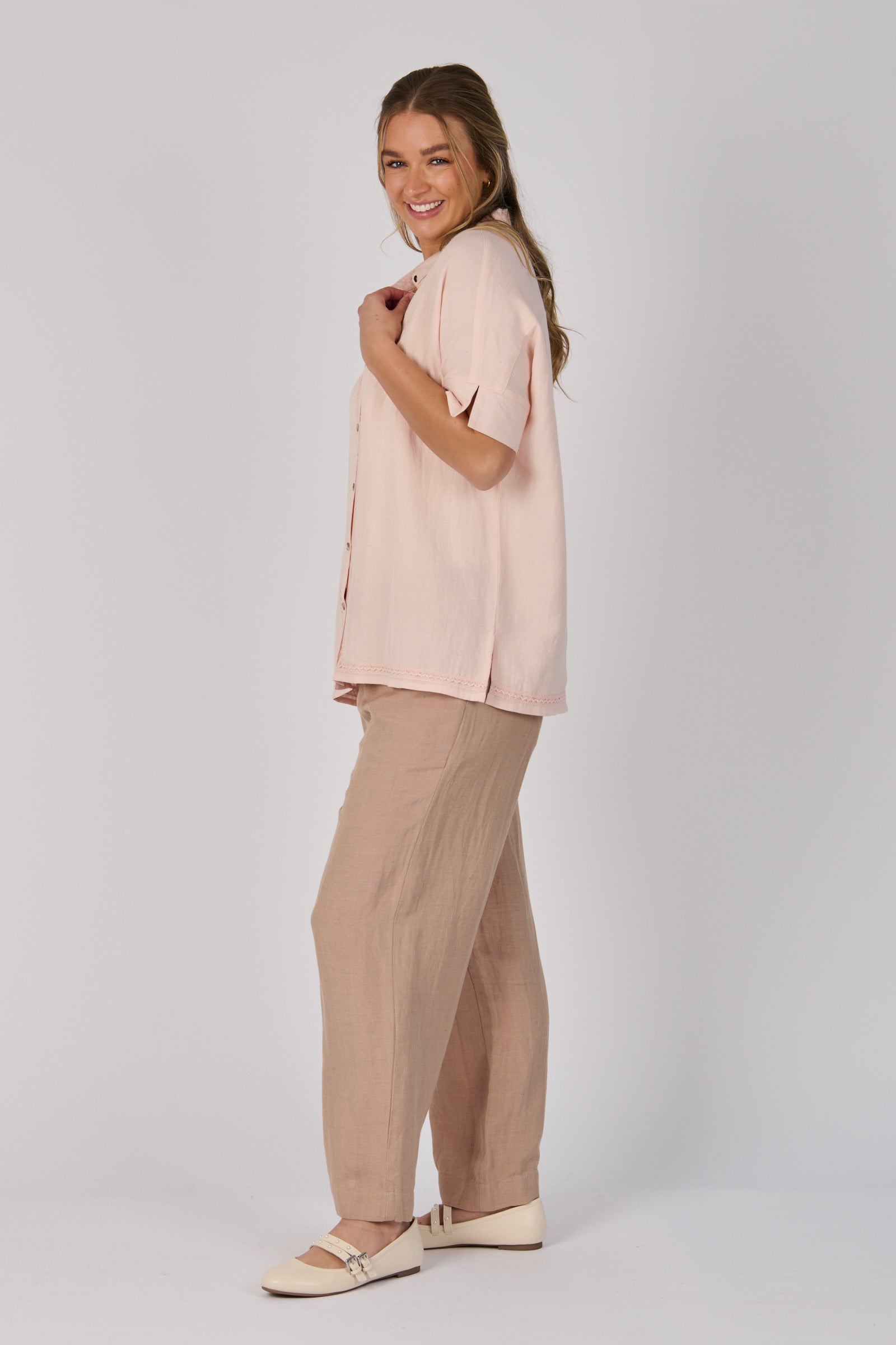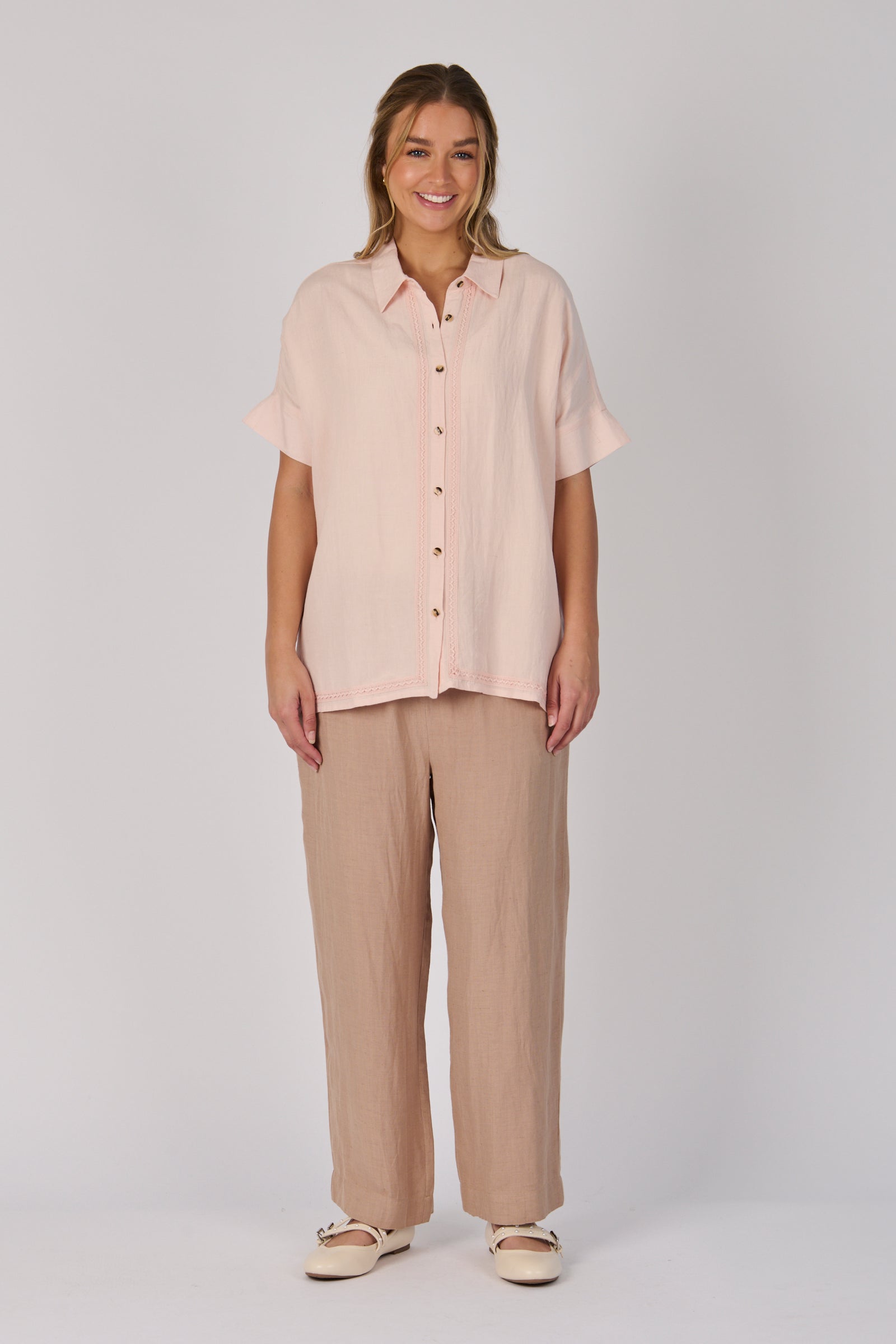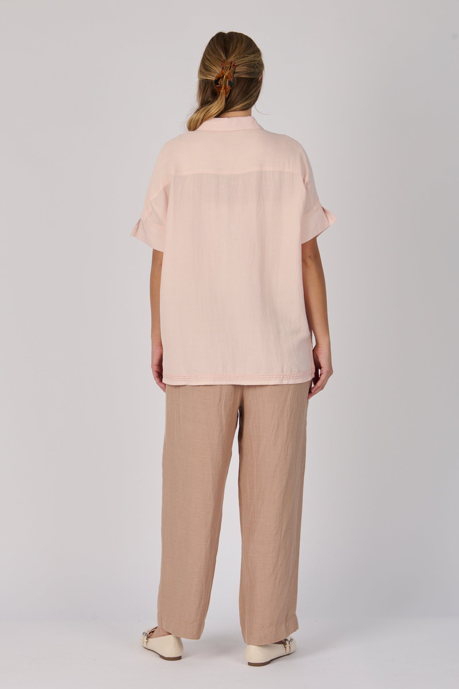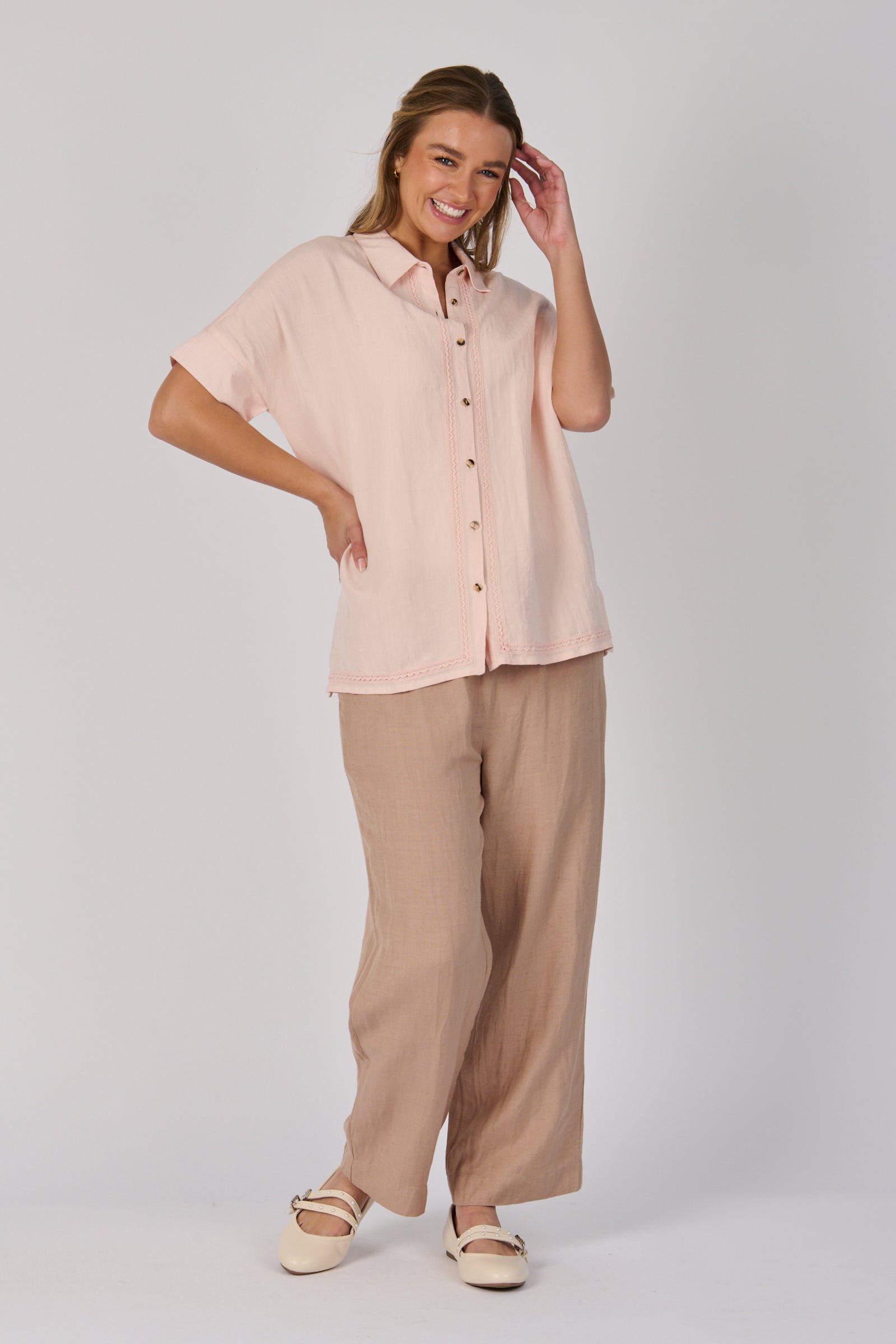 Softly tailored and effortlessly feminine, this collared relaxed shirt in Blush is a timeless wardrobe essential. Crafted from a breathable linen–lyocell blend, it drapes beautifully and feels light against the skin. Featuring a button-through front, short cuffed sleeves, and ladder-lace trim detailing, it blends casual comfort with understated sophistication. Pair it with linen pants or denim for an easy summer look.