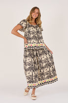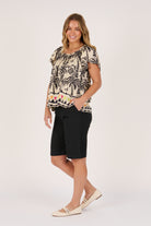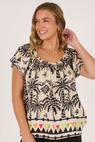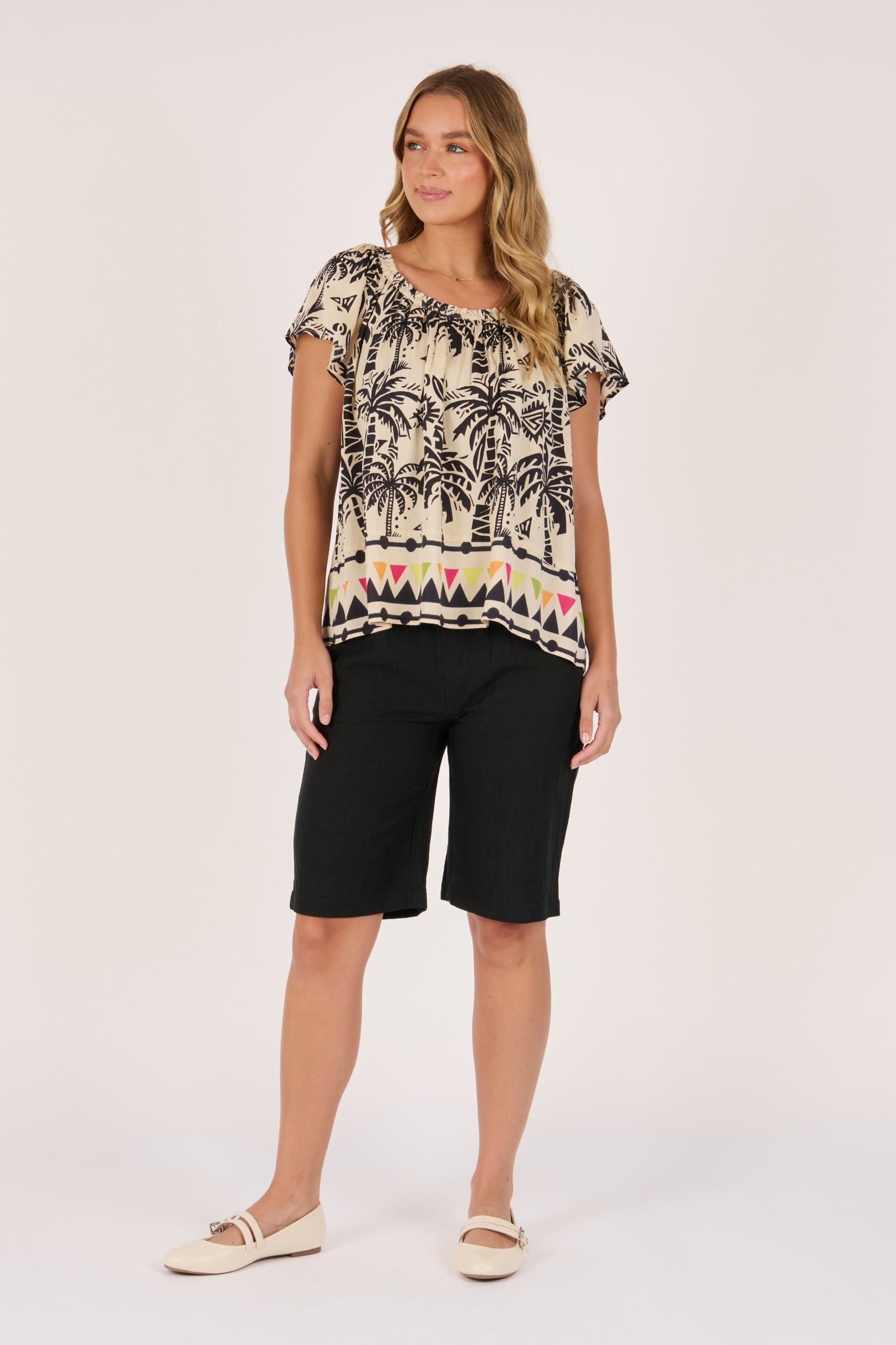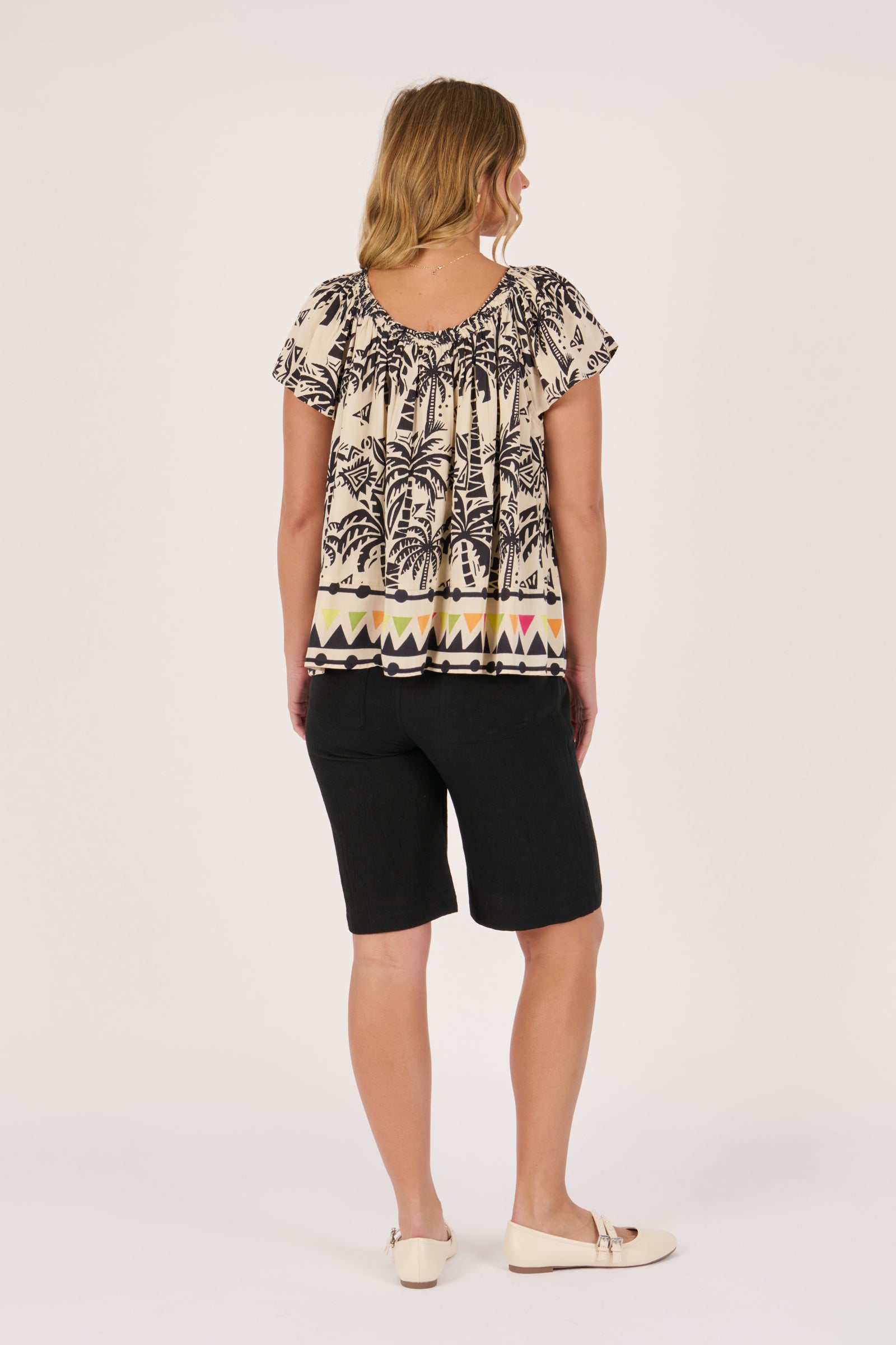 The Elastic Scoop Neck Blouse in Black Palm Print is crafted from lightweight viscose and designed with a flattering scoop neckline and soft elastic detail. Featuring short flutter sleeves and a relaxed silhouette, this blouse brings a touch of tropical charm to your everyday wardrobe.