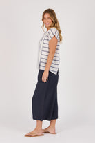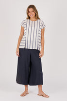 The Panel Detail Blouse in Blue Stripe is crafted from breathable 100% Cotton for a soft, natural feel. Designed with vertical and horizontal stripe panelling, this blouse adds a modern twist to a timeless summer classic. Featuring short sleeves, a round neckline, and side splits for ease of movement, it pairs effortlessly with wide-leg pants or denim for a fresh, coastal-inspired look.