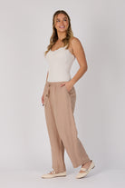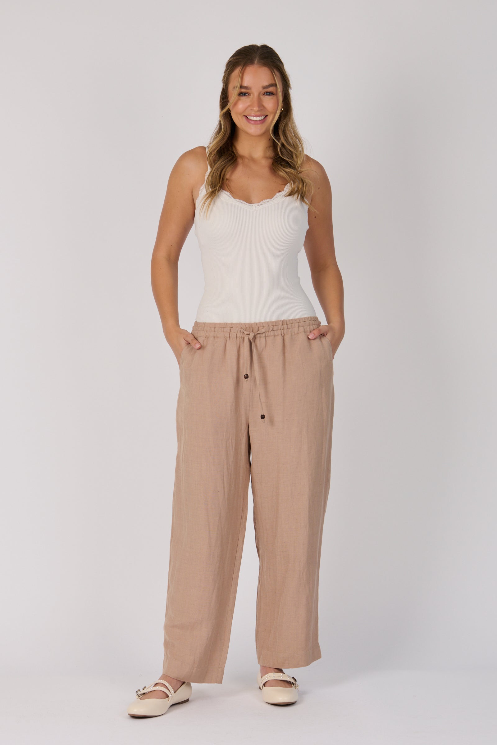 Relaxed sophistication meets all-day comfort in these taupe drawcord pants, crafted from a soft linen–lyocell blend. Designed with an elastic waistband and adjustable drawstring for the perfect fit, they feature a straight-leg silhouette that drapes beautifully for a flattering, effortless look. The neutral taupe tone pairs perfectly with crisp whites, soft blushes, and natural linens for a refined summer palette.