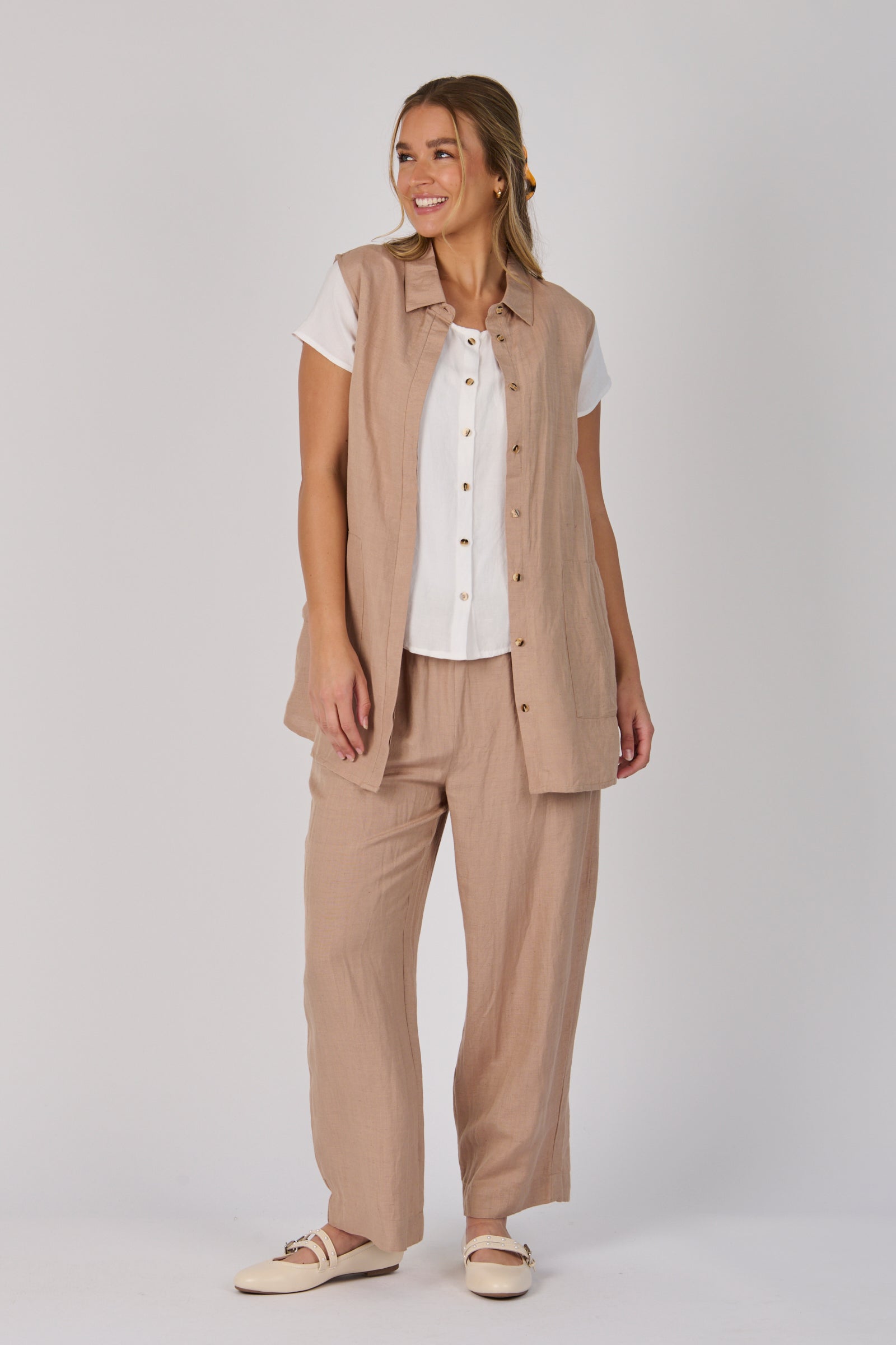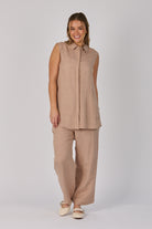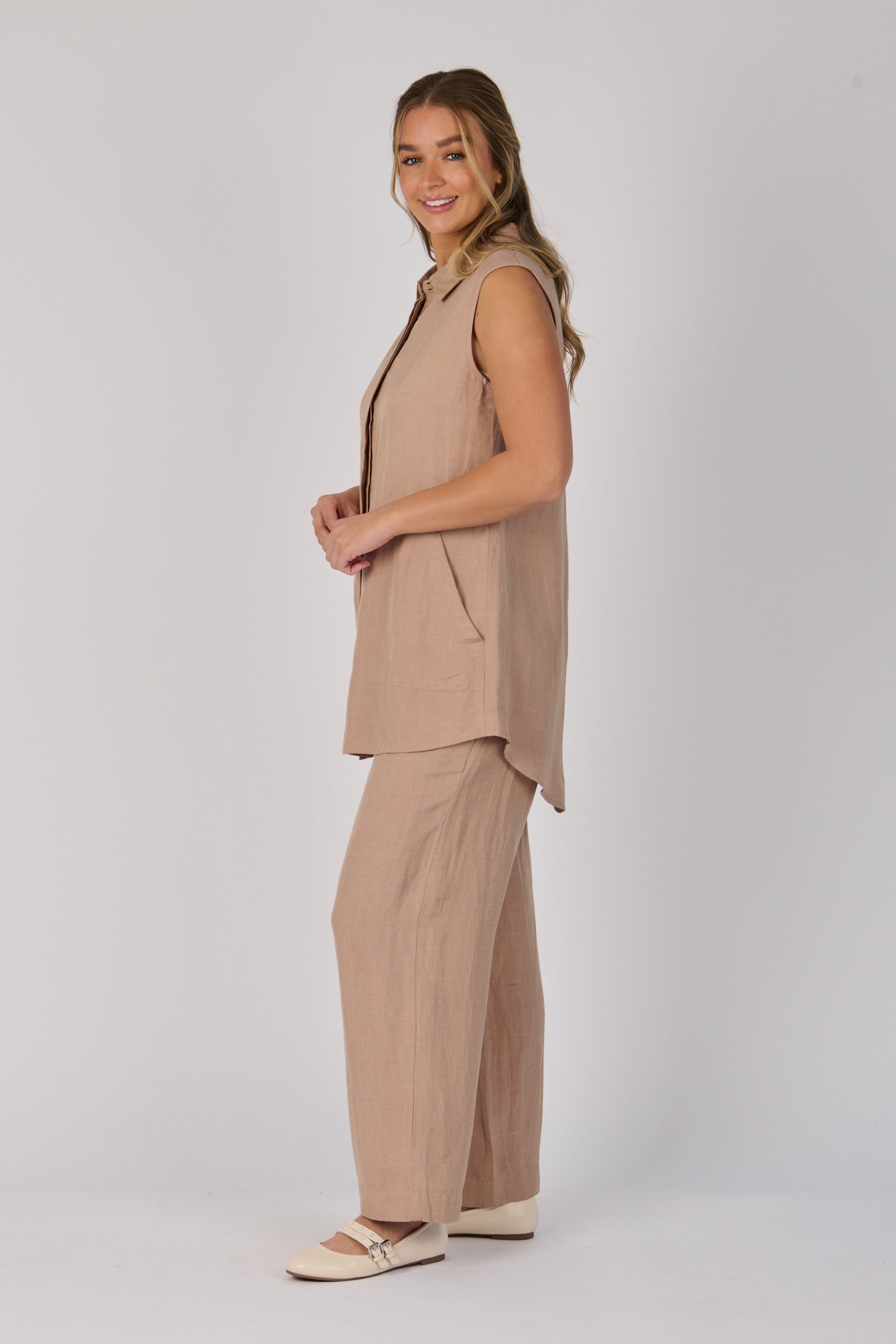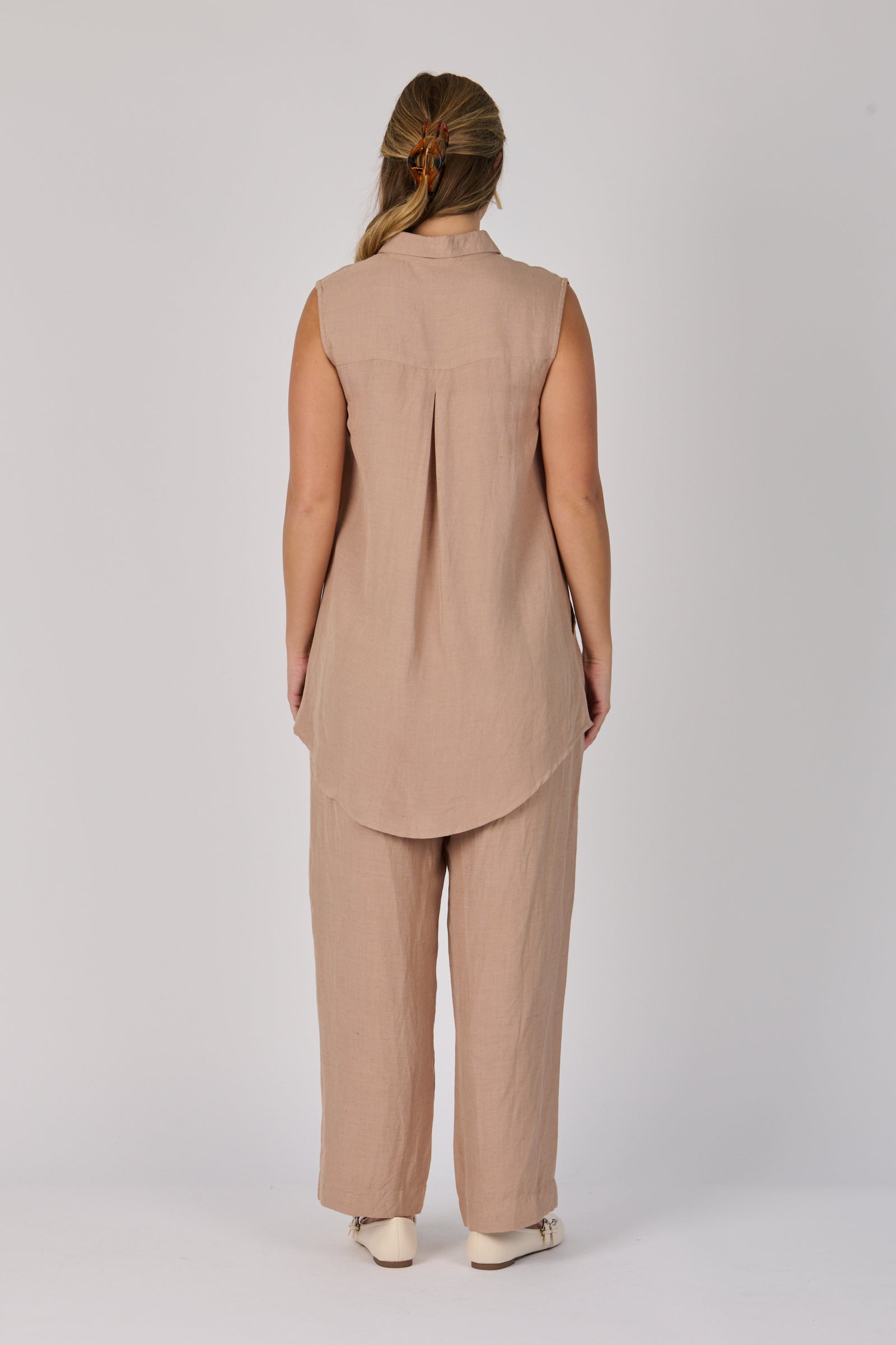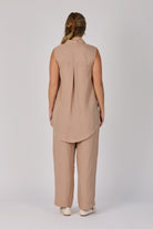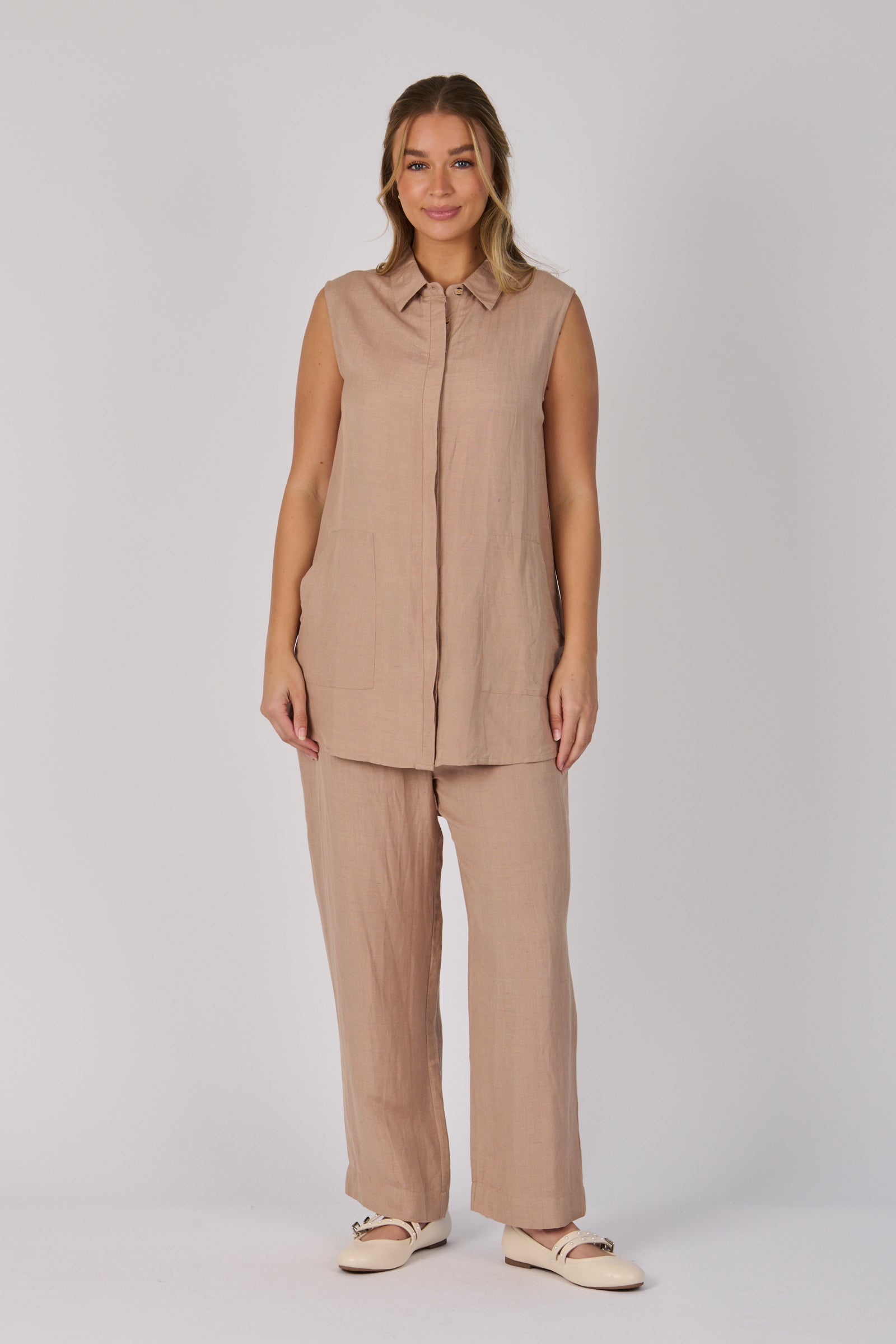 Effortless and refined, this sleeveless taupe top is a timeless wardrobe staple. Crafted from a soft linen–lyocell blend, it features a clean button-through front with a concealed placket for a polished finish. The structured collar and front pockets add subtle detailing, while the relaxed silhouette ensures comfort and versatility. Perfectly pairs with matching linen pants or denim for a chic, everyday look.