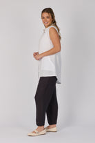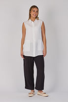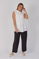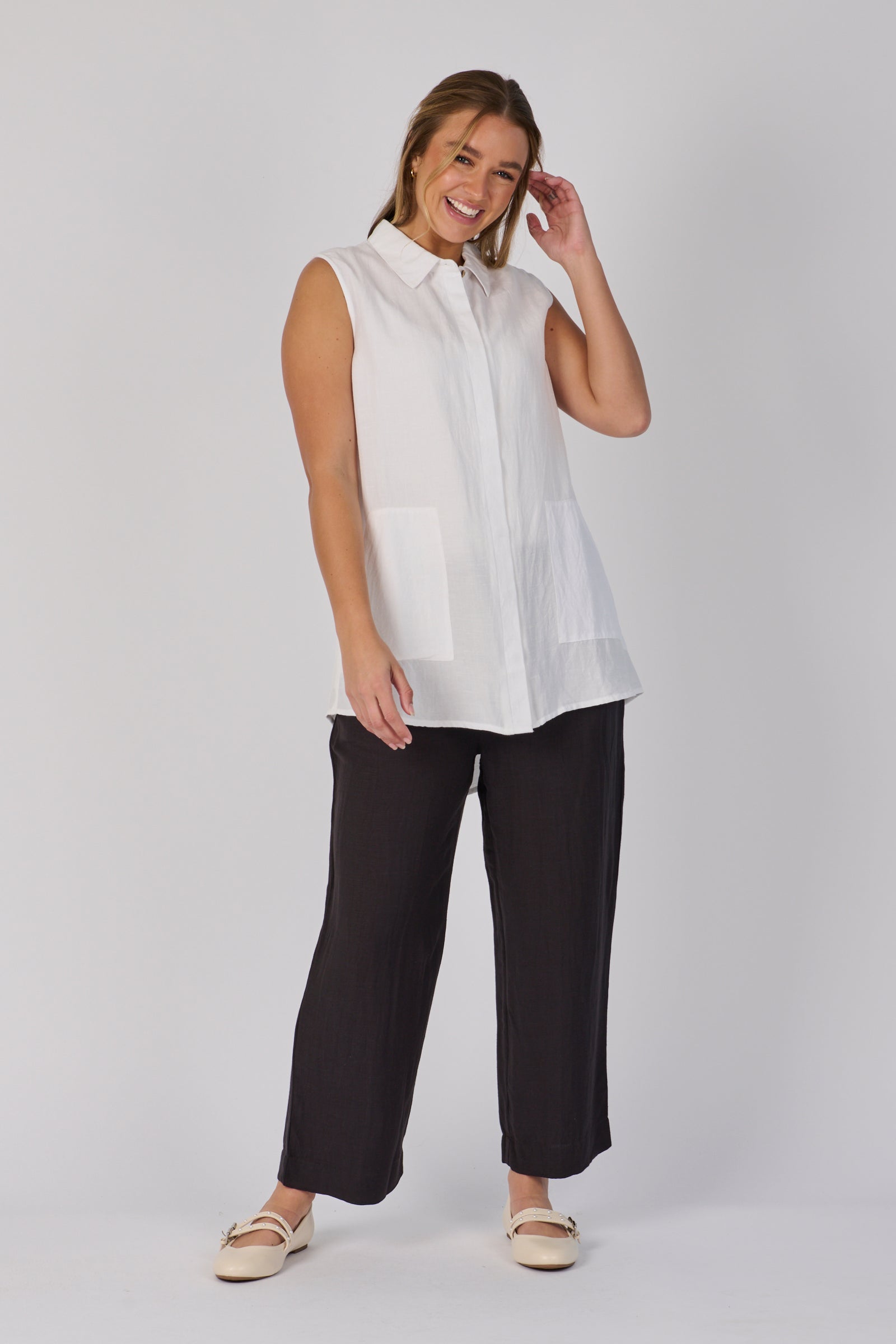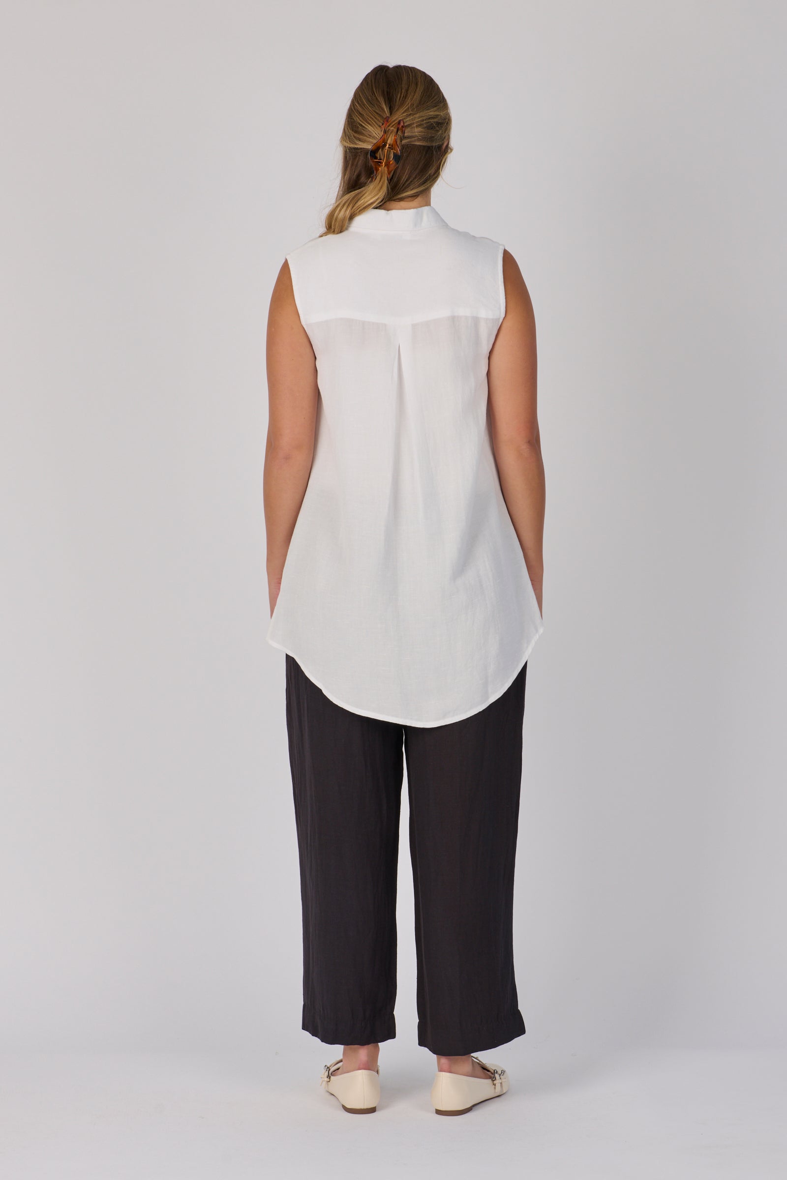 Crisp, modern, and effortlessly polished — this sleeveless white top is a true wardrobe staple. Crafted from a soft linen–lyocell blend, it offers natural breathability with a smooth, refined finish. The button-through front features a concealed placket for a clean, minimal look, while the structured collar and relaxed fit make it ideal for both casual and workwear styling. Pair it with tailored pants or relaxed linen shorts for easy summer dressing.