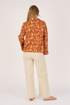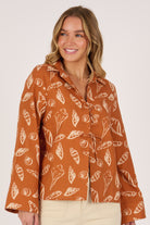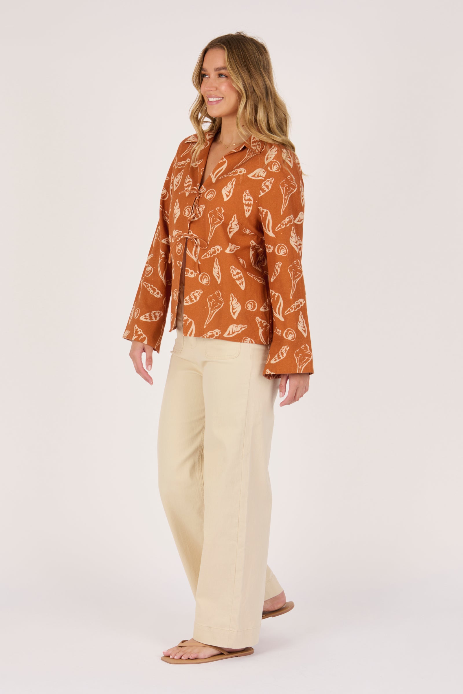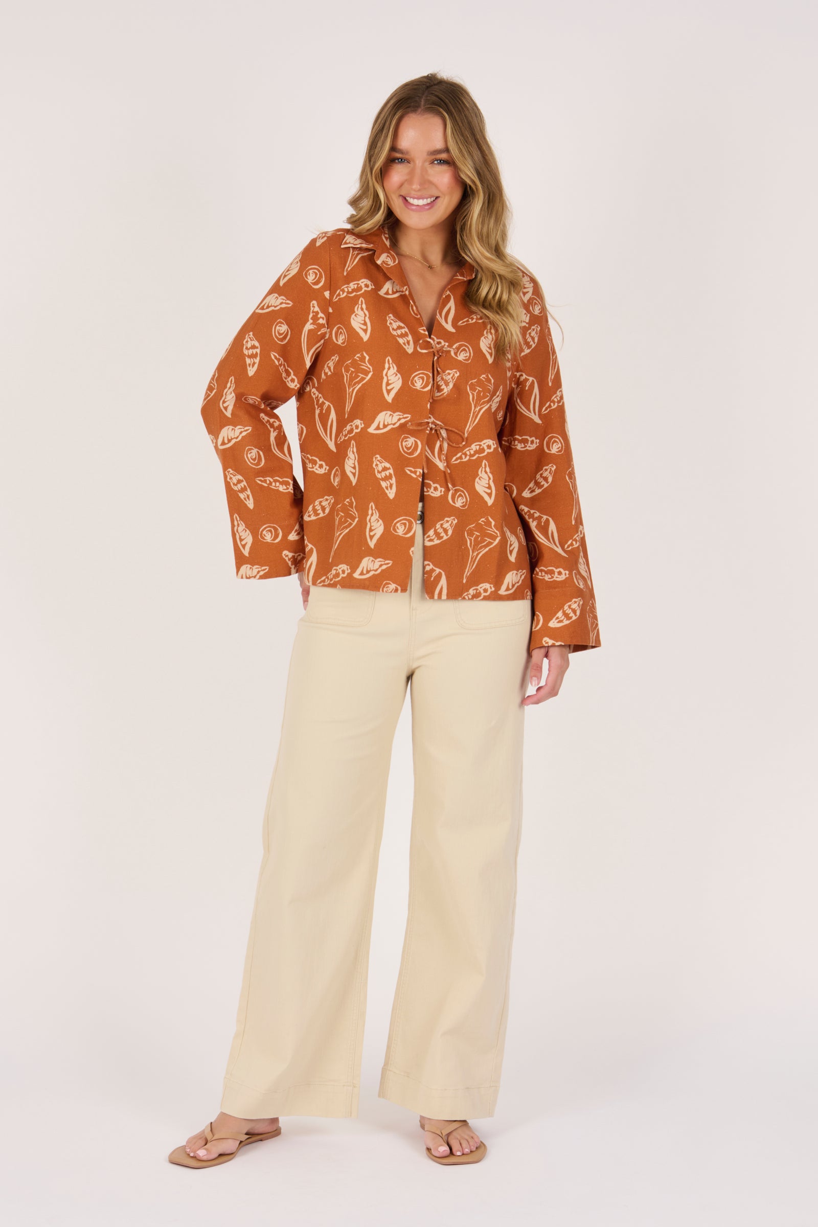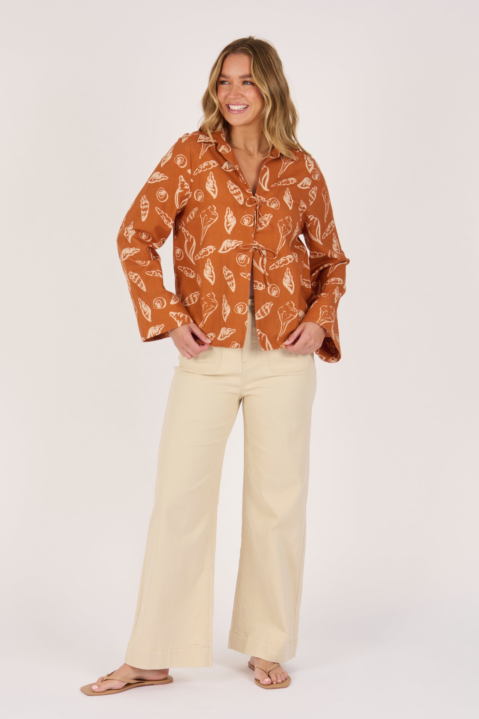 The Tie Front Pop Over in Amber Shell is a standout piece designed in a warm amber tone with shell-inspired prints. Crafted from 100% cotton, it features a relaxed fit, collared neckline, and statement tie-front detailing for an elevated yet easy-to-wear style.