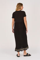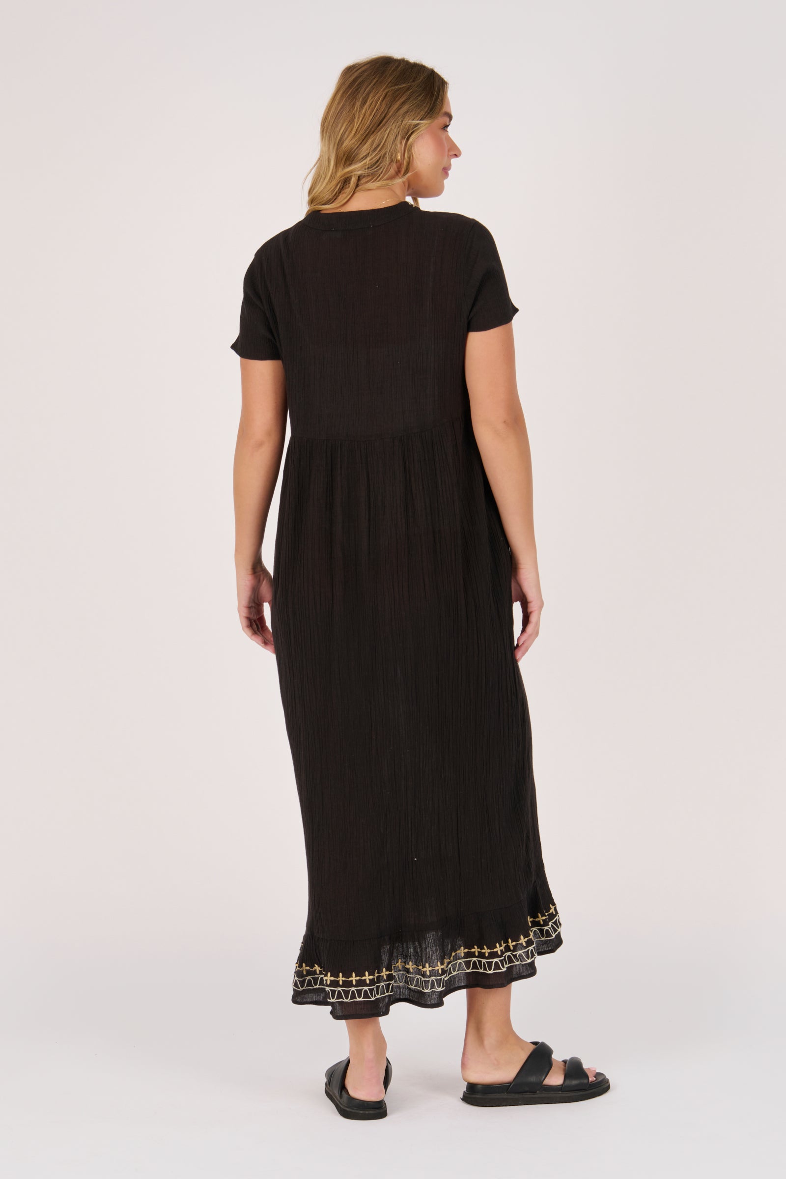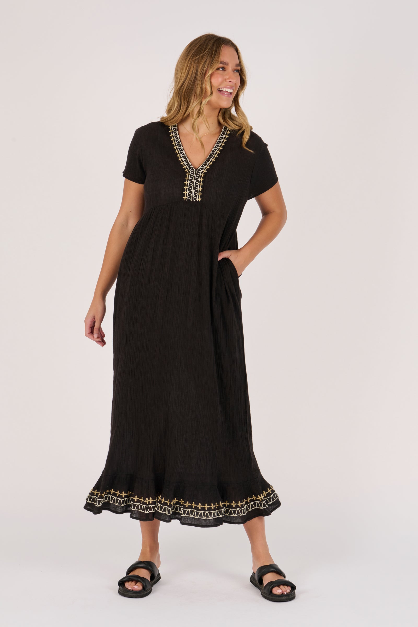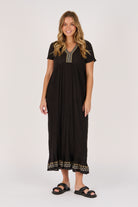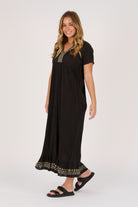 The V Neck Maxi Dress in Black is a timeless wardrobe staple crafted from breathable 100% cotton. Designed with short sleeves, embroidered detailing at the neckline and hem, and a flowing maxi silhouette, it’s perfect for effortless summer dressing.