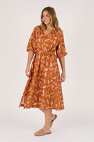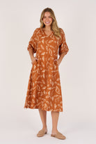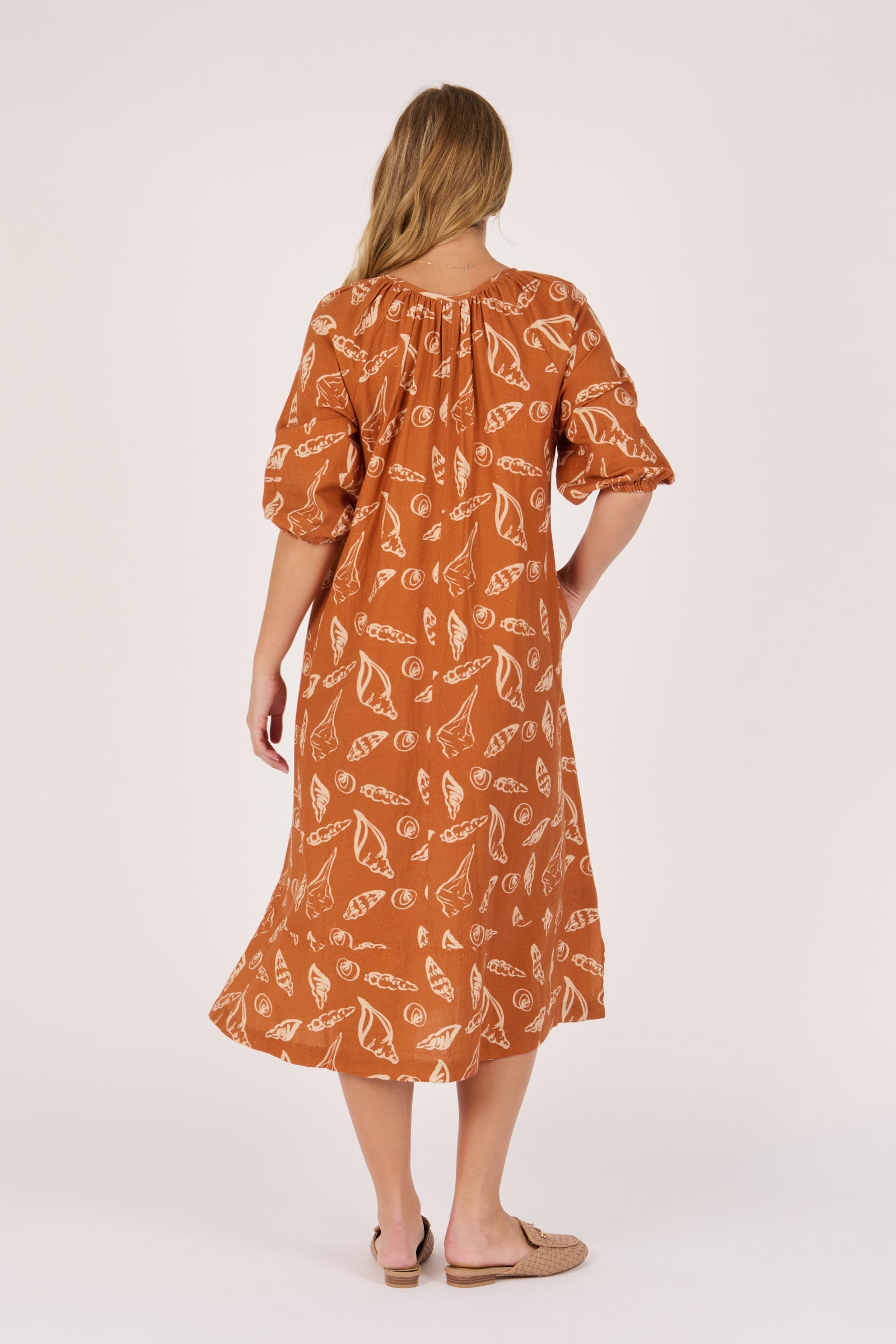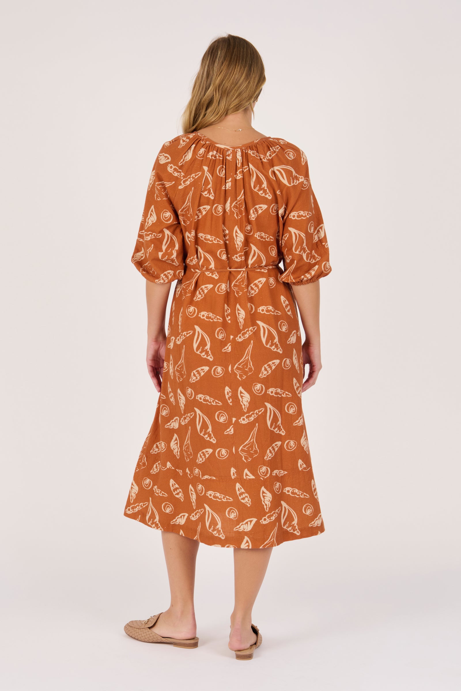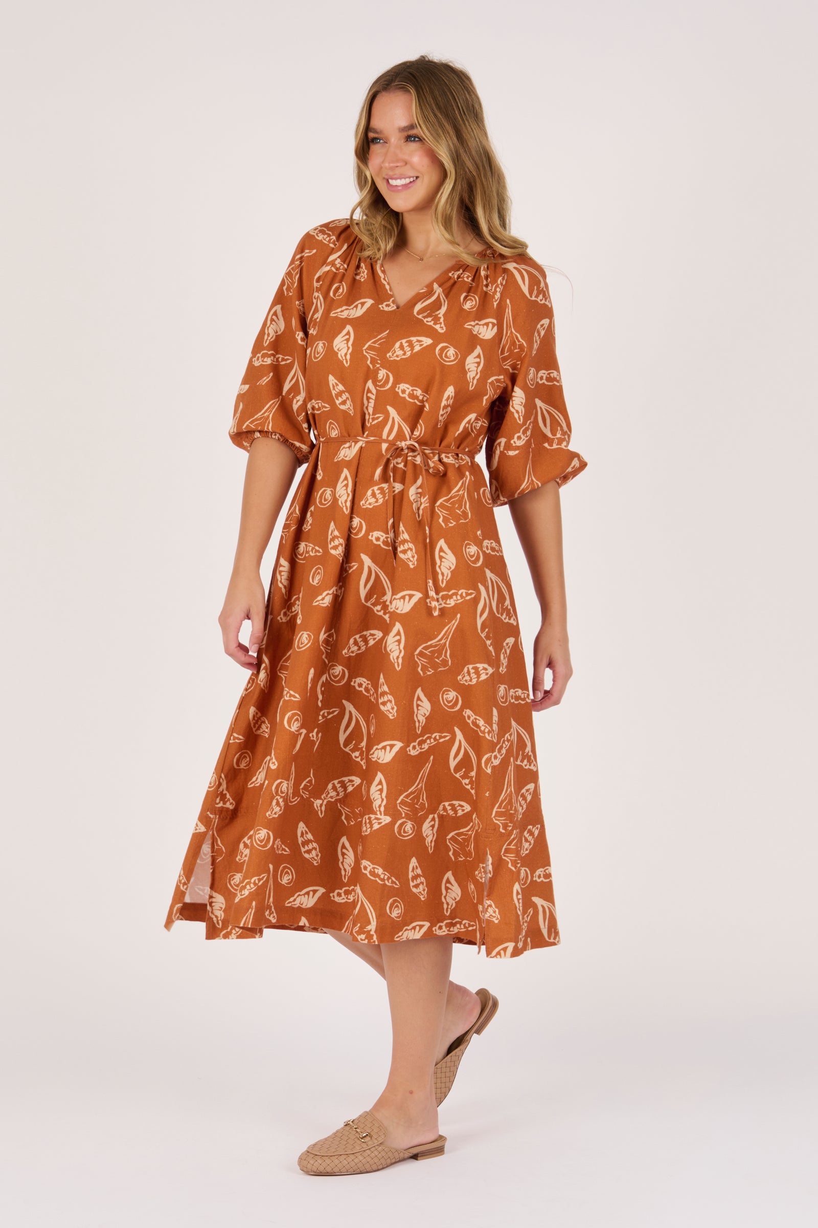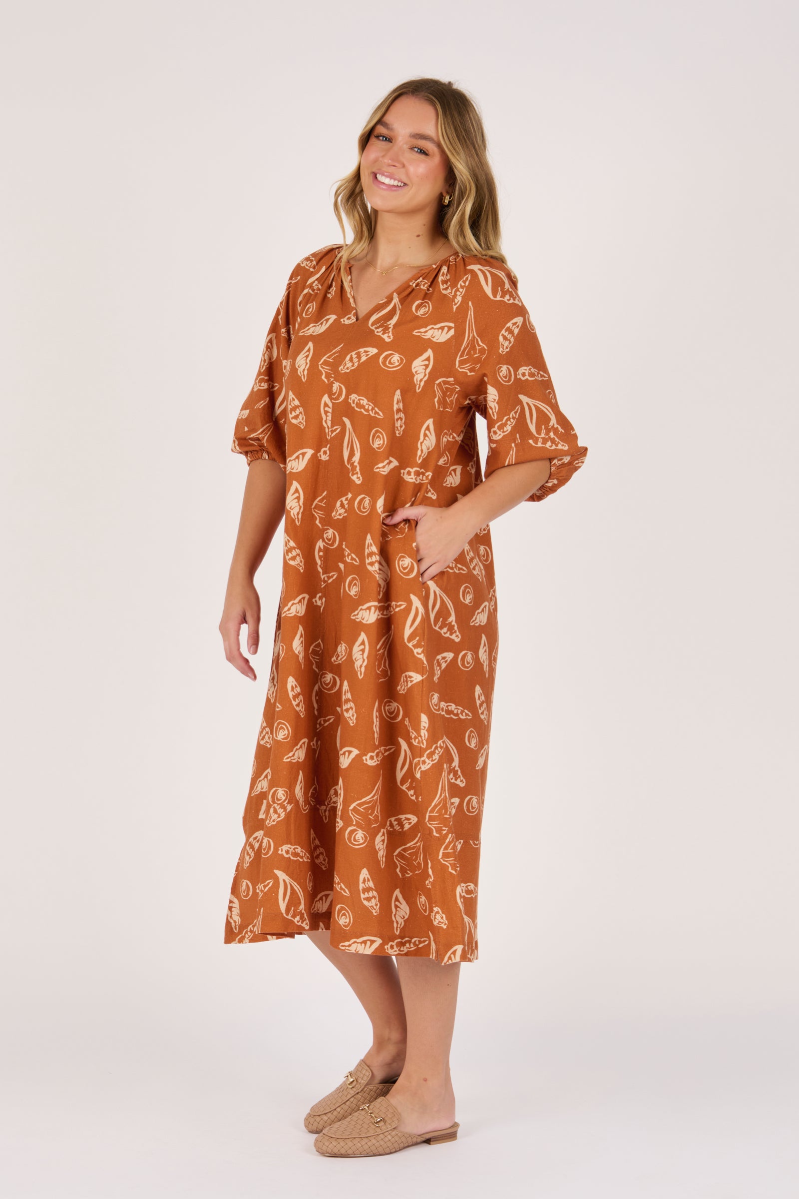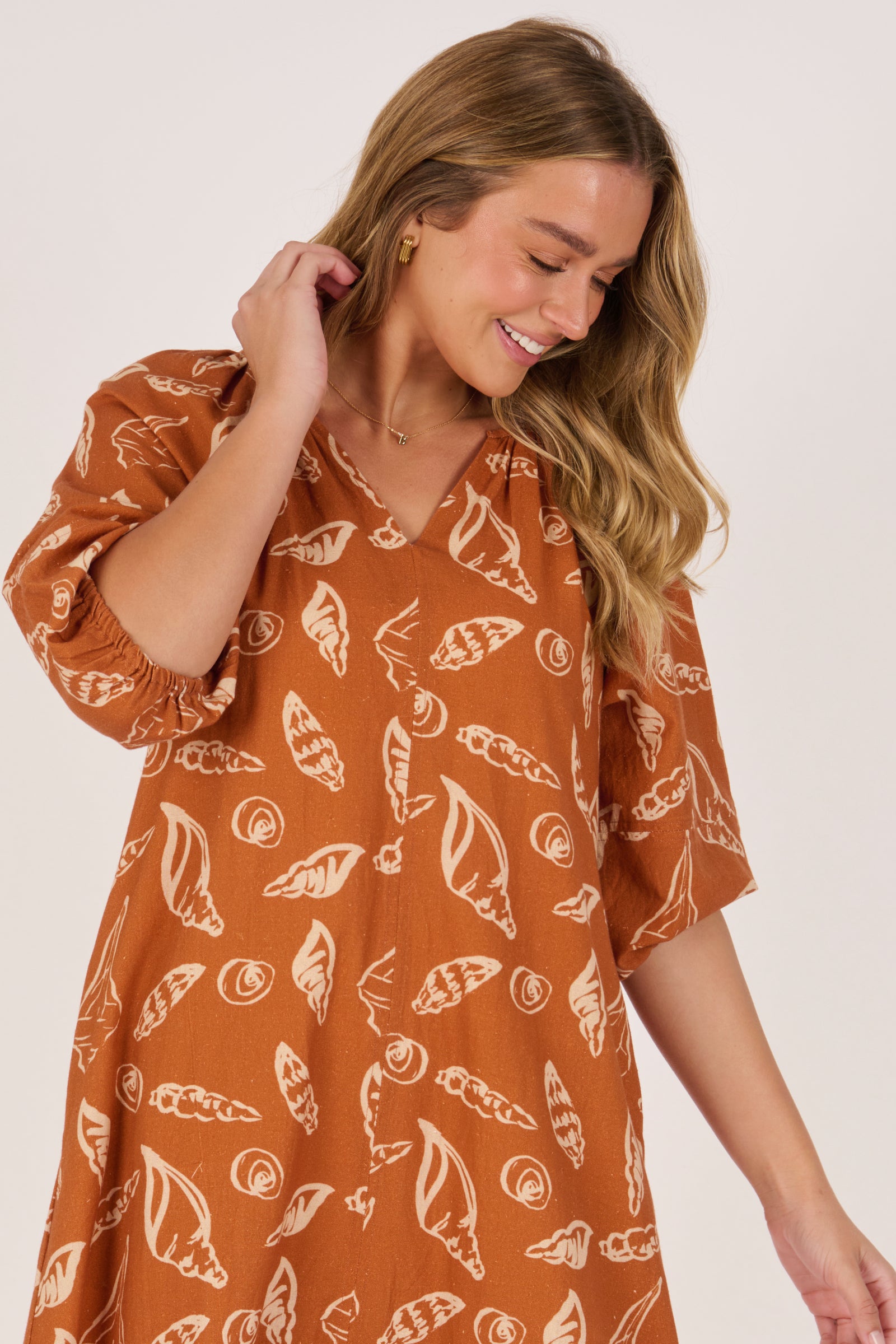 A throw-on favourite in 100% cotton, the V Neck Midi Dress features a flattering V-neckline, relaxed short sleeves and handy side pockets. The Amber Shell print adds a warm, coastal feel for everyday wear.