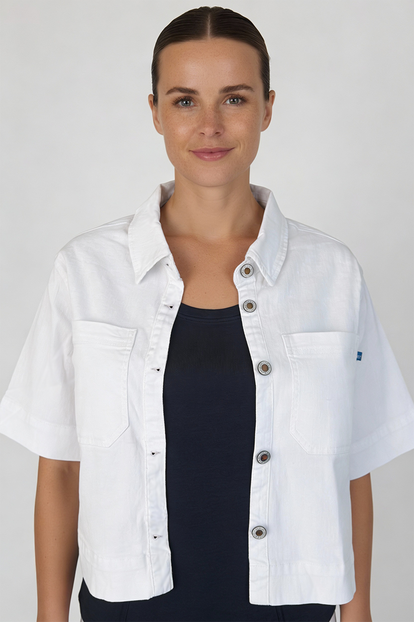 The Boxy Short Sleeve Shirt in White is a modern wardrobe staple, designed with a relaxed, boxy silhouette for effortless everyday wear. Crafted in a soft stretch cotton blend, this shirt offers structure with comfort, making it perfect for easy styling through the warmer months. Featuring a classic collar, short sleeves and chest pockets, it’s an elevated take on casual dressing. Wear it buttoned up with tailored pants or open over a tank for a relaxed, layered look.