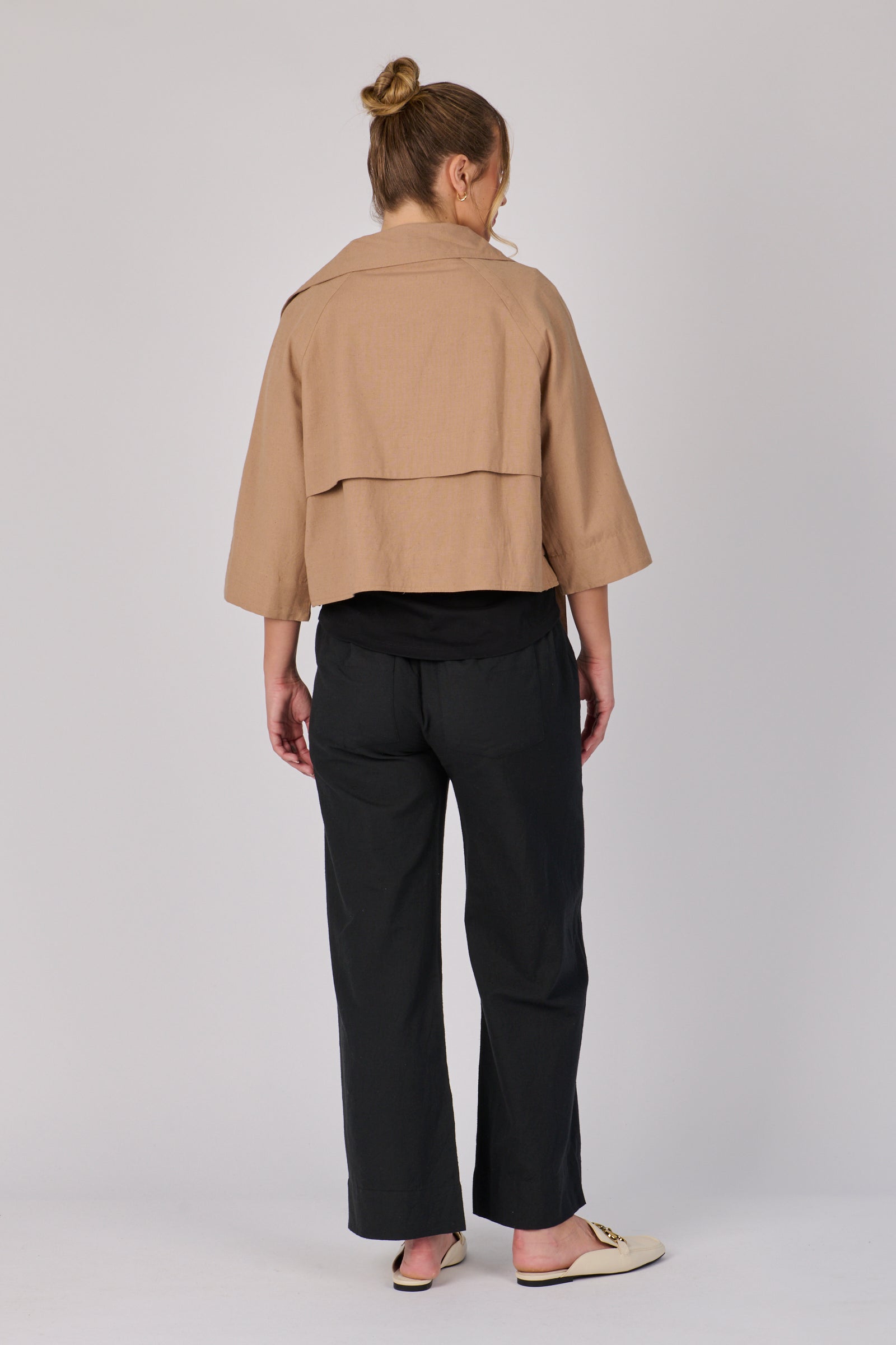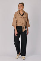 The Short Trench Jacket in Mocha is crafted from a breathable cotton-blend fabric for comfort and structure. Designed with a cropped silhouette, wide lapel collar, and adjustable waist tie, this jacket is the perfect lightweight layer for trans-seasonal dressing. Pair it effortlessly with tailored pants or denim for an elevated everyday look.