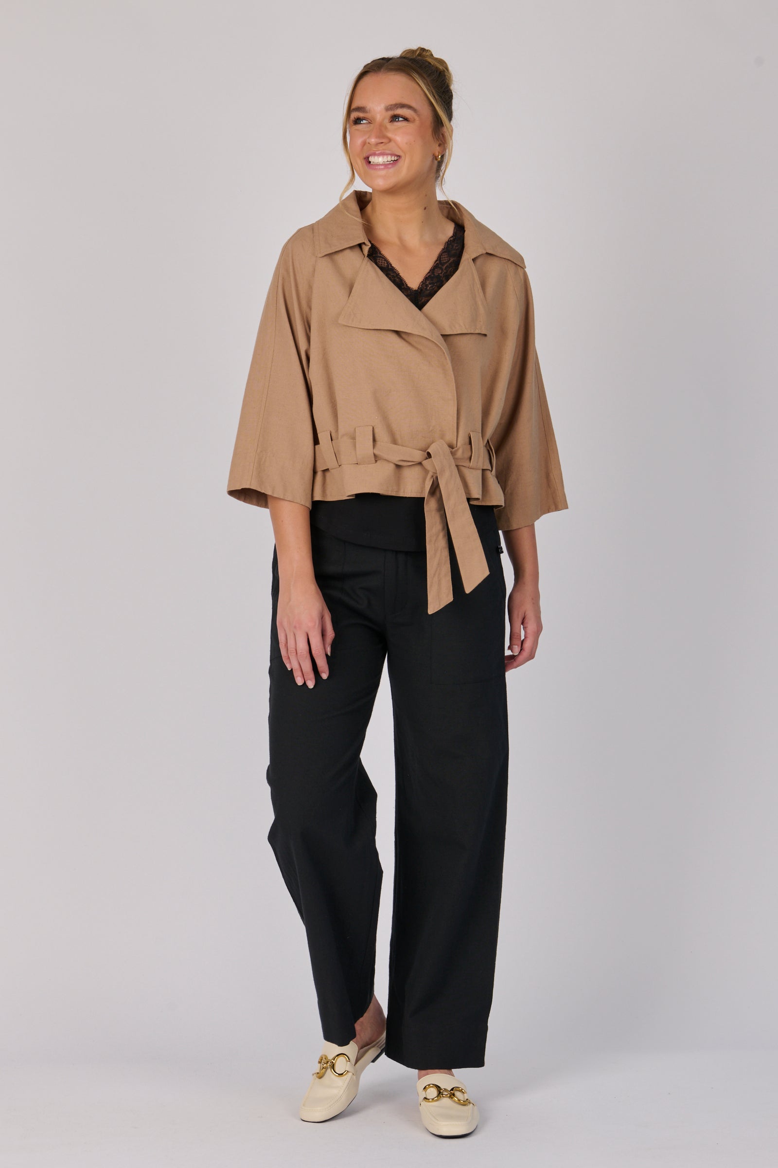 Design: Cropped trench silhouette with wide lapels and soft tailoring