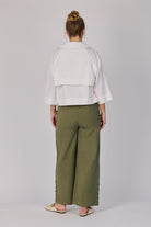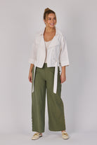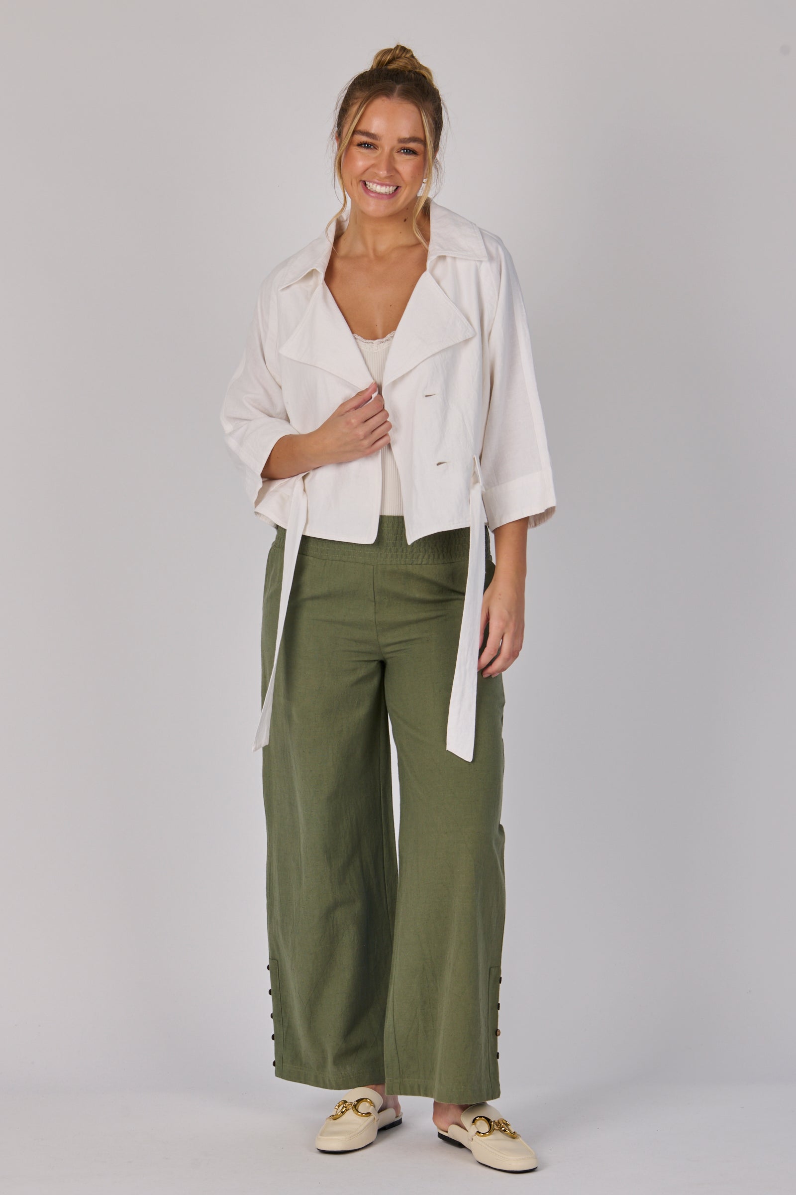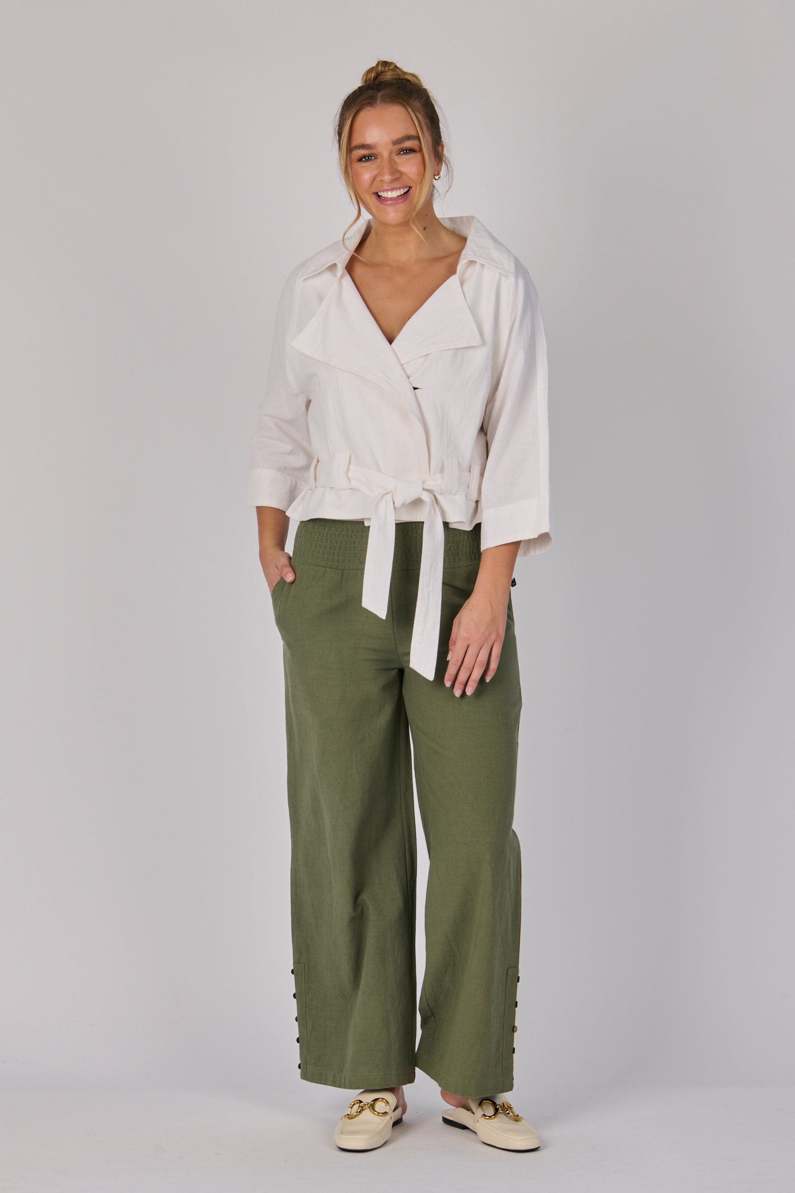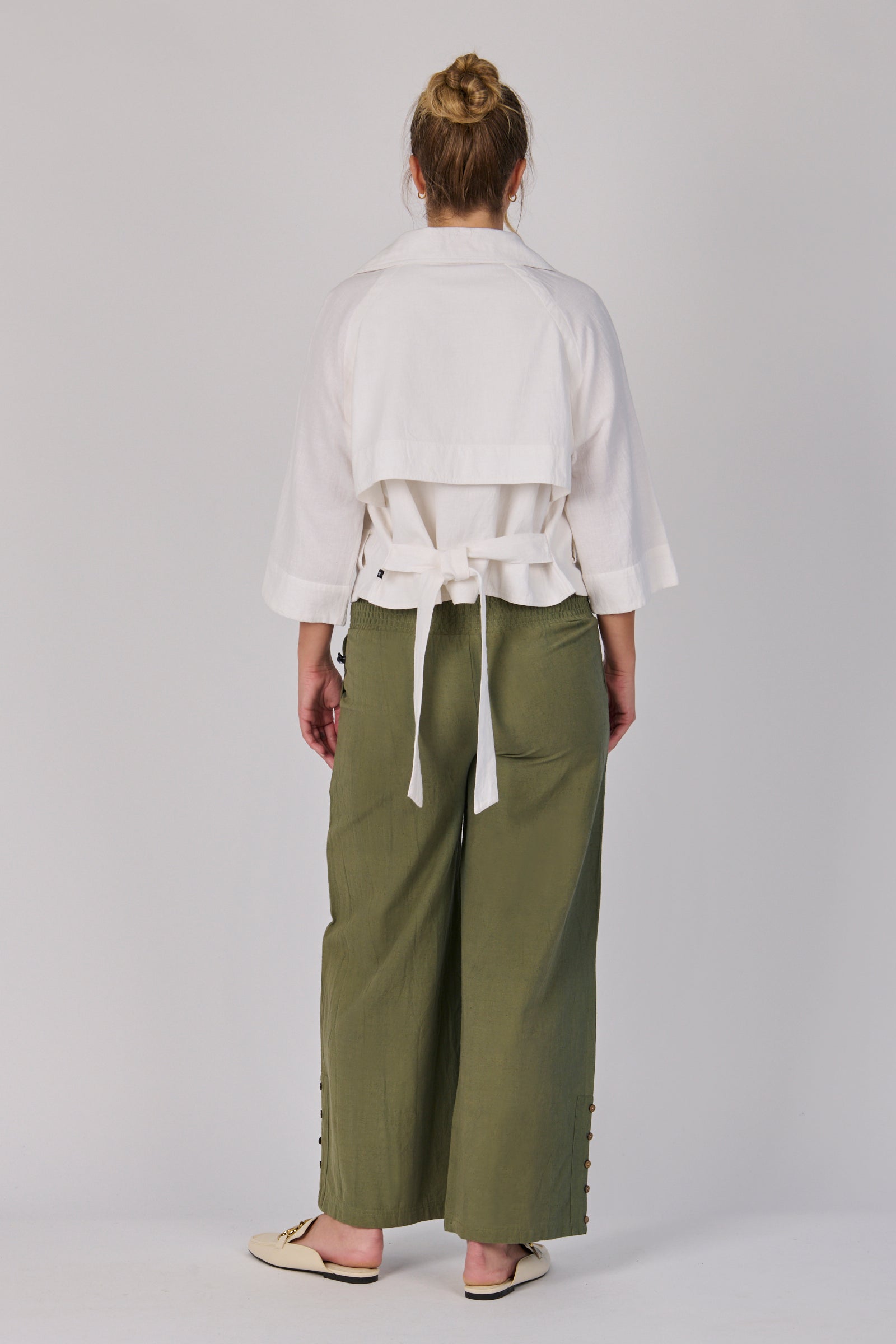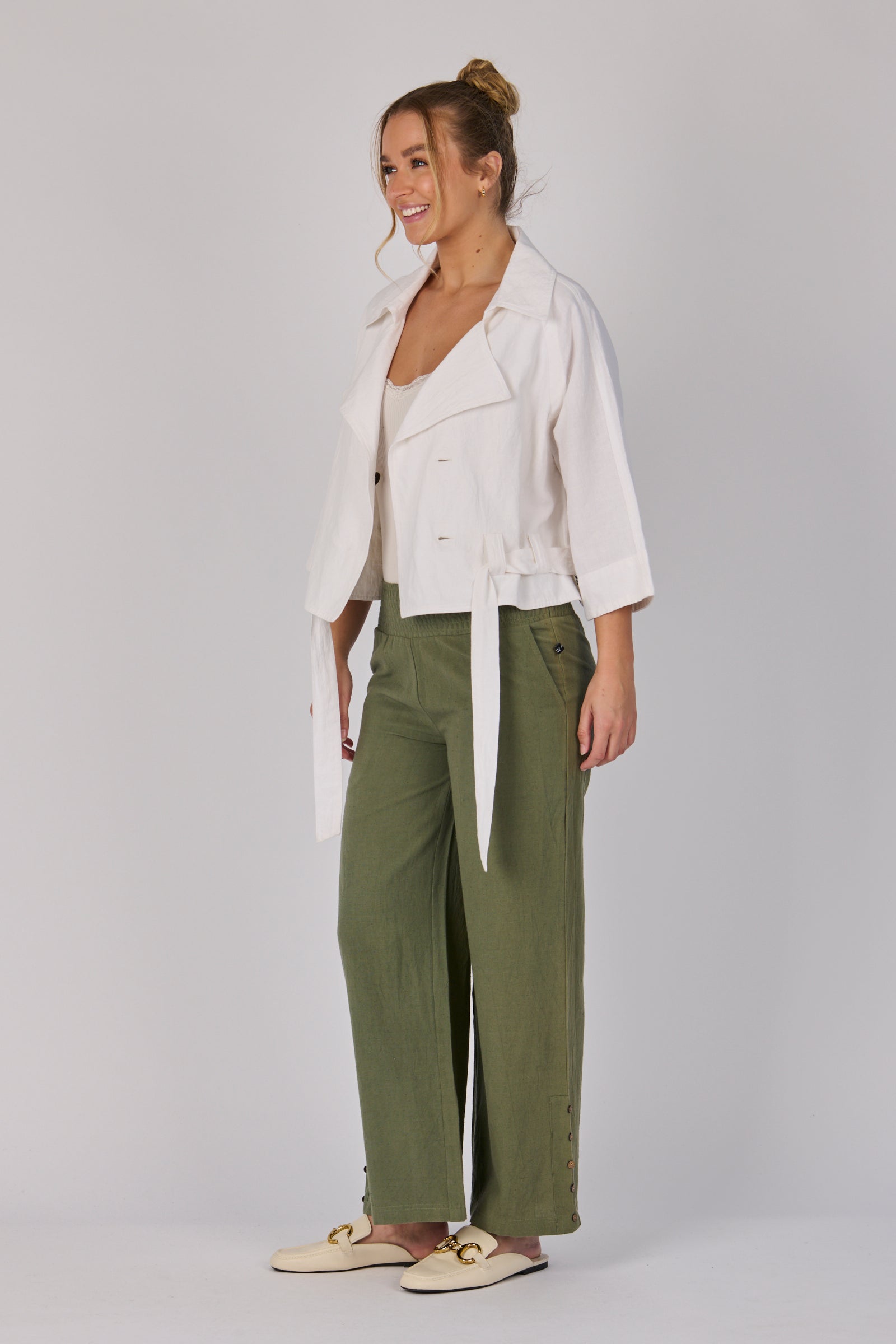 The Short Trench Jacket in White is crafted from a breathable cotton-blend fabric for comfort and structure. Designed with a cropped silhouette, wide lapel collar, and adjustable waist tie, this jacket is the perfect lightweight layer for trans-seasonal dressing. Pair it effortlessly with tailored pants or denim for an elevated everyday look.