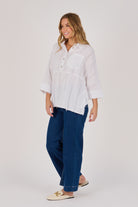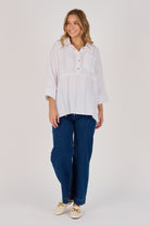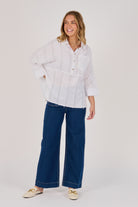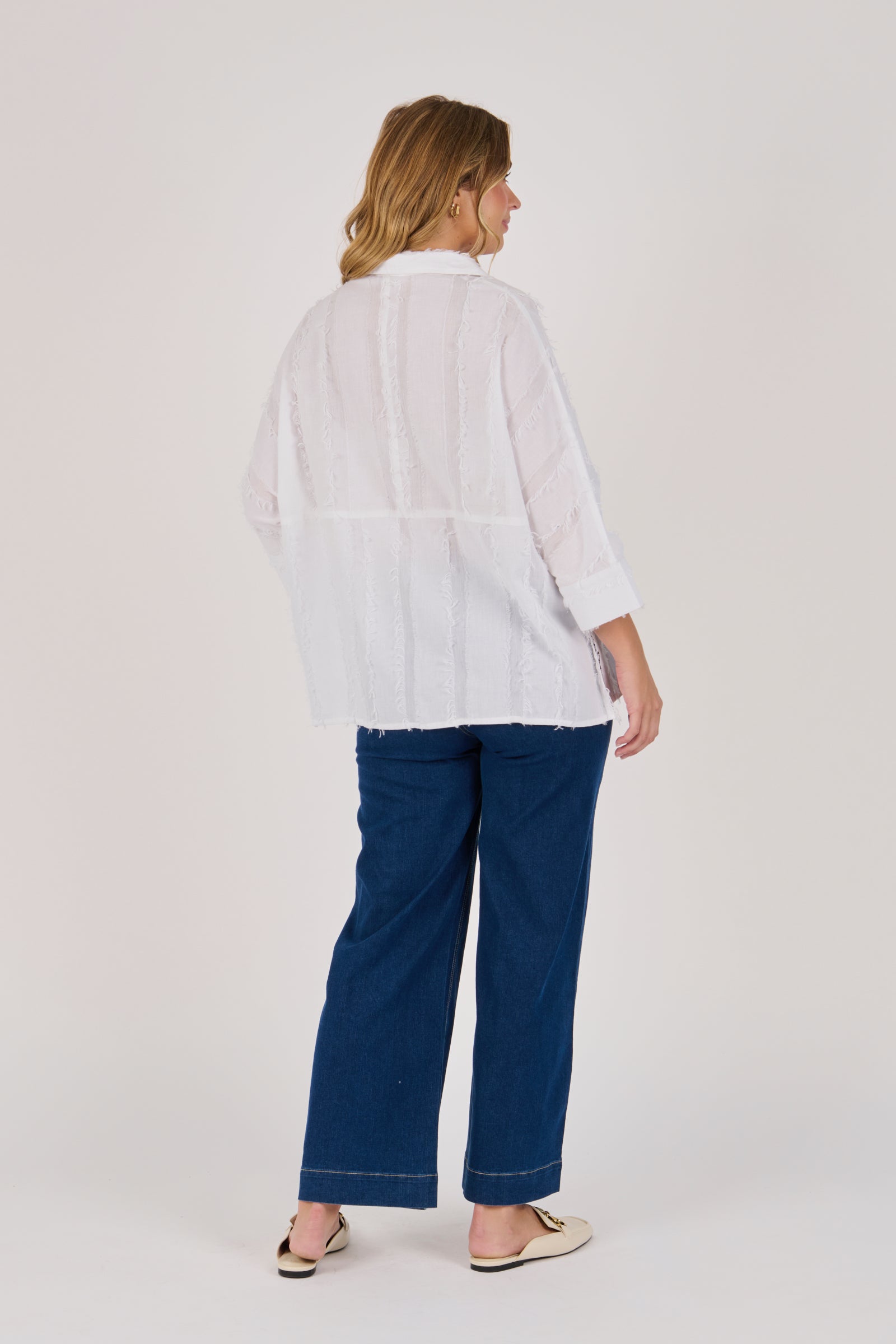 The Oversized Shirt in White is crafted from breathable 100% Cotton for comfort and ease. Featuring a relaxed oversized silhouette with raw textured stripe detail, a button-front placket, and a chest pocket, this shirt is perfect for layering or wearing on its own.