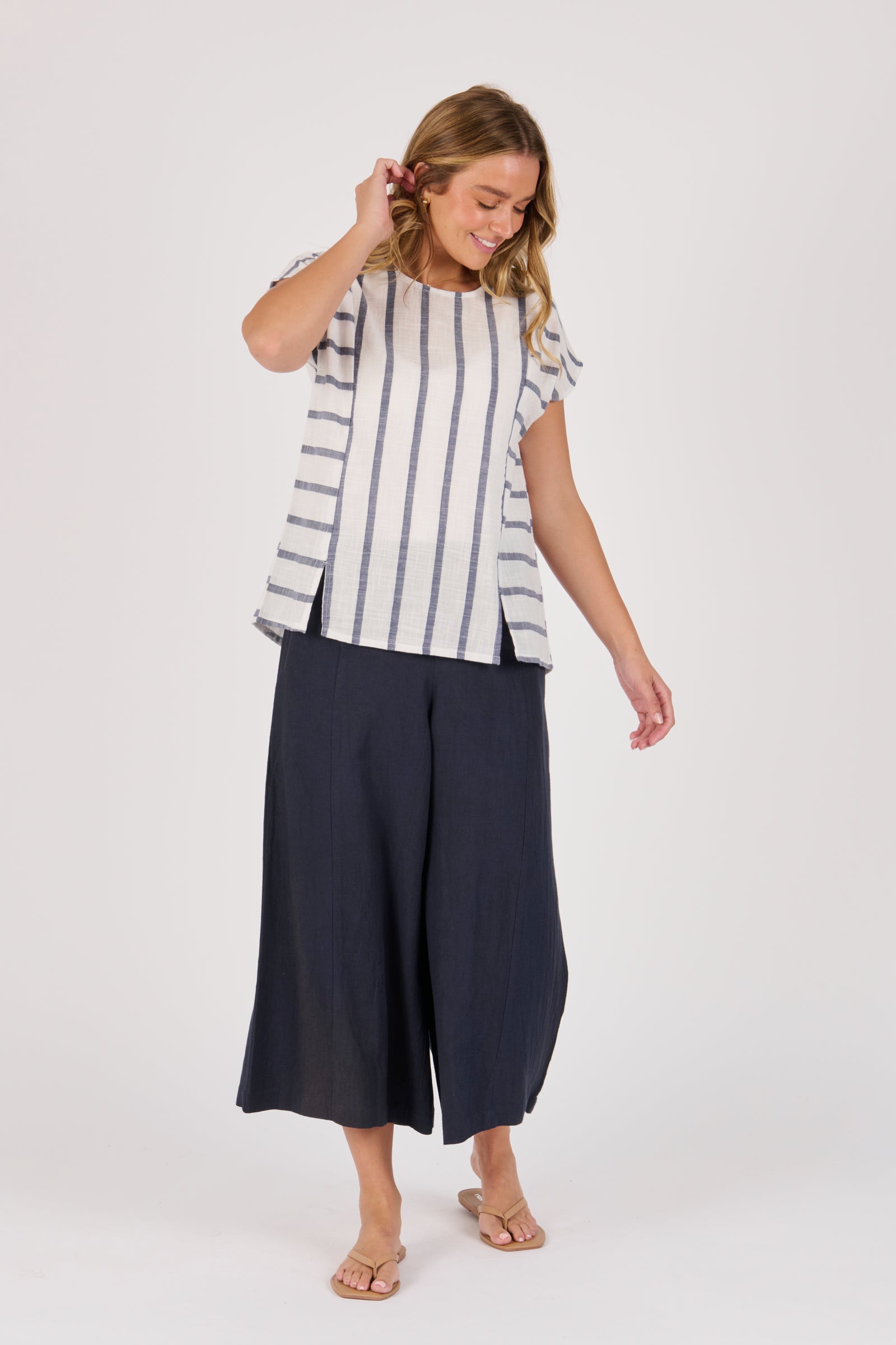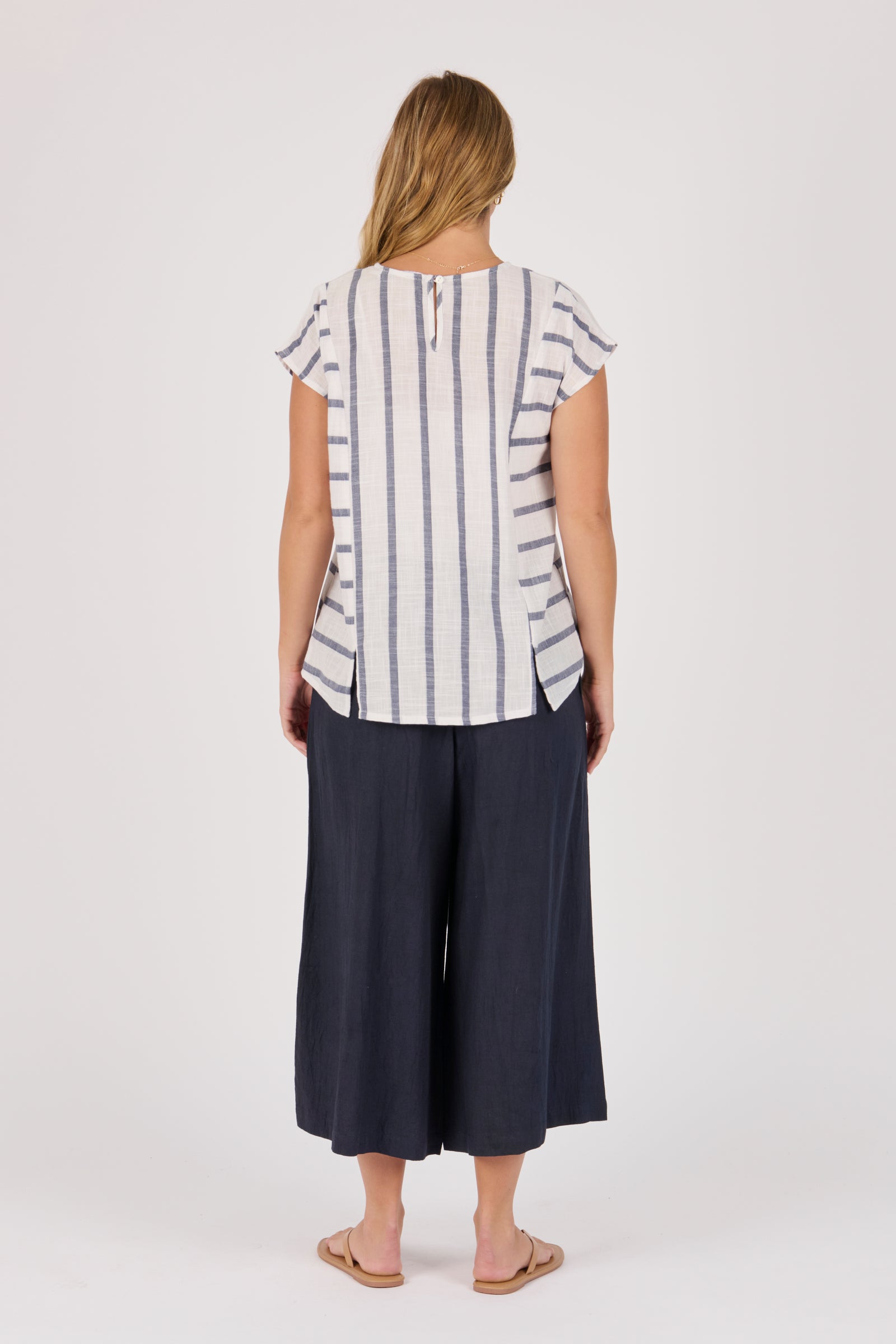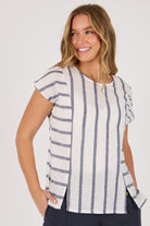 The Panel Detail Blouse in Blue Stripe is crafted from breathable 100% Cotton for a soft, natural feel. Designed with vertical and horizontal stripe panelling, this blouse adds a modern twist to a timeless summer classic. Featuring short sleeves, a round neckline, and side splits for ease of movement, it pairs effortlessly with wide-leg pants or denim for a fresh, coastal-inspired look.
