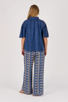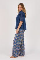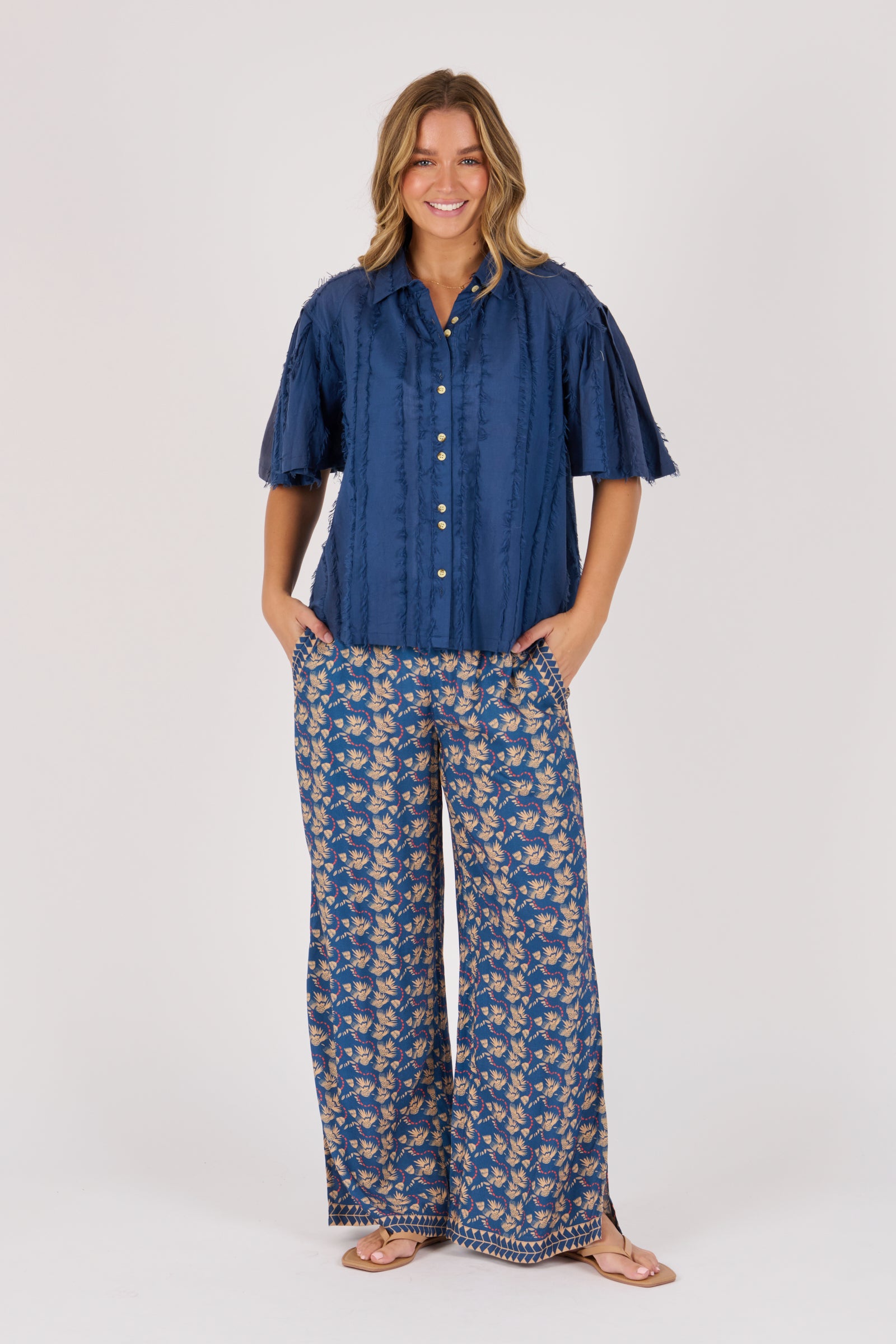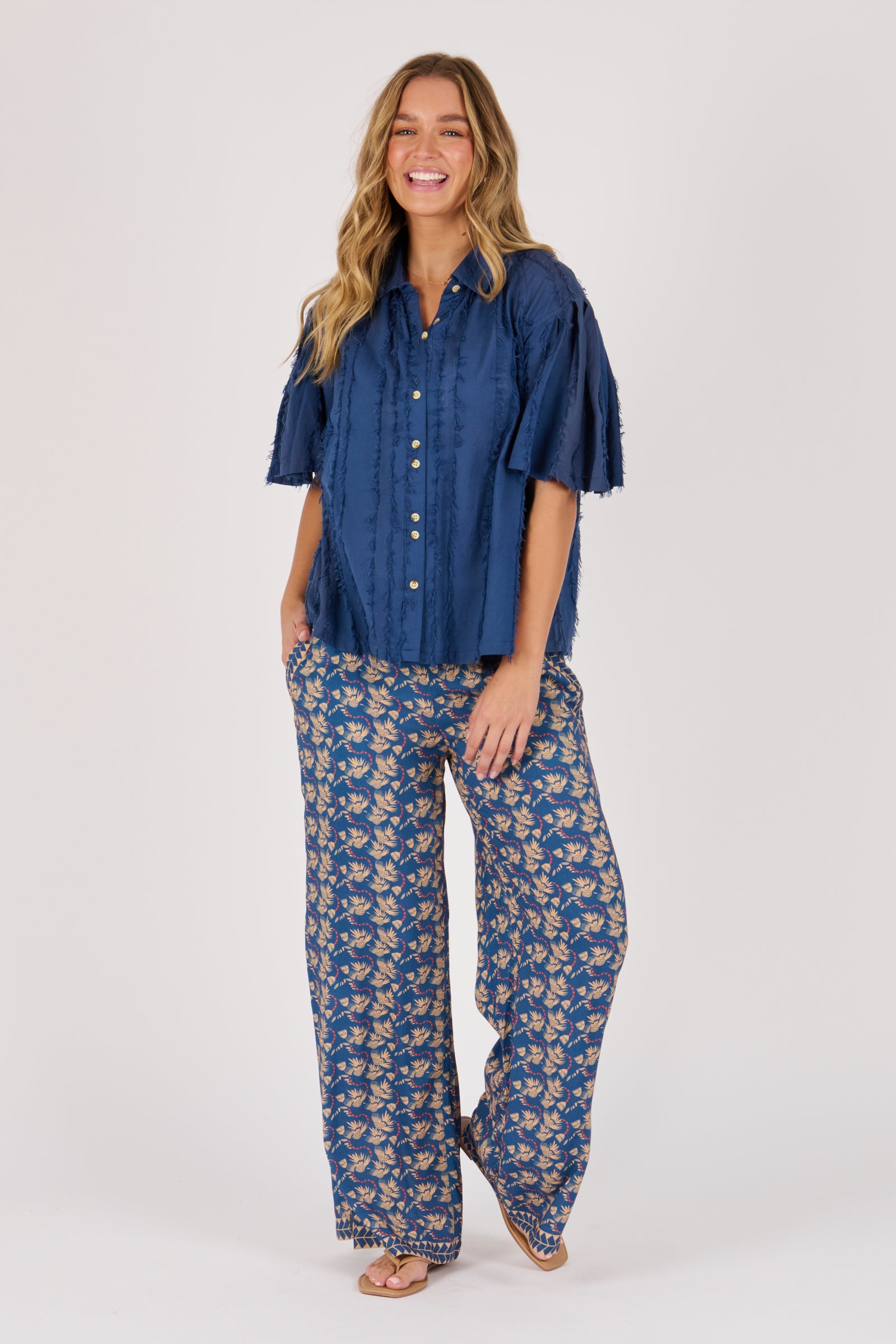 The Pleat Sleeve Button Through Blouse in Navy is crafted from 100% Cotton for a breathable, natural feel. Featuring soft pleated sleeves with raw-edge detailing, this blouse combines structure with movement for an effortlessly refined look. The button-through front and relaxed fit make it a versatile style — perfect for pairing with printed pants or denim for elevated everyday wear.