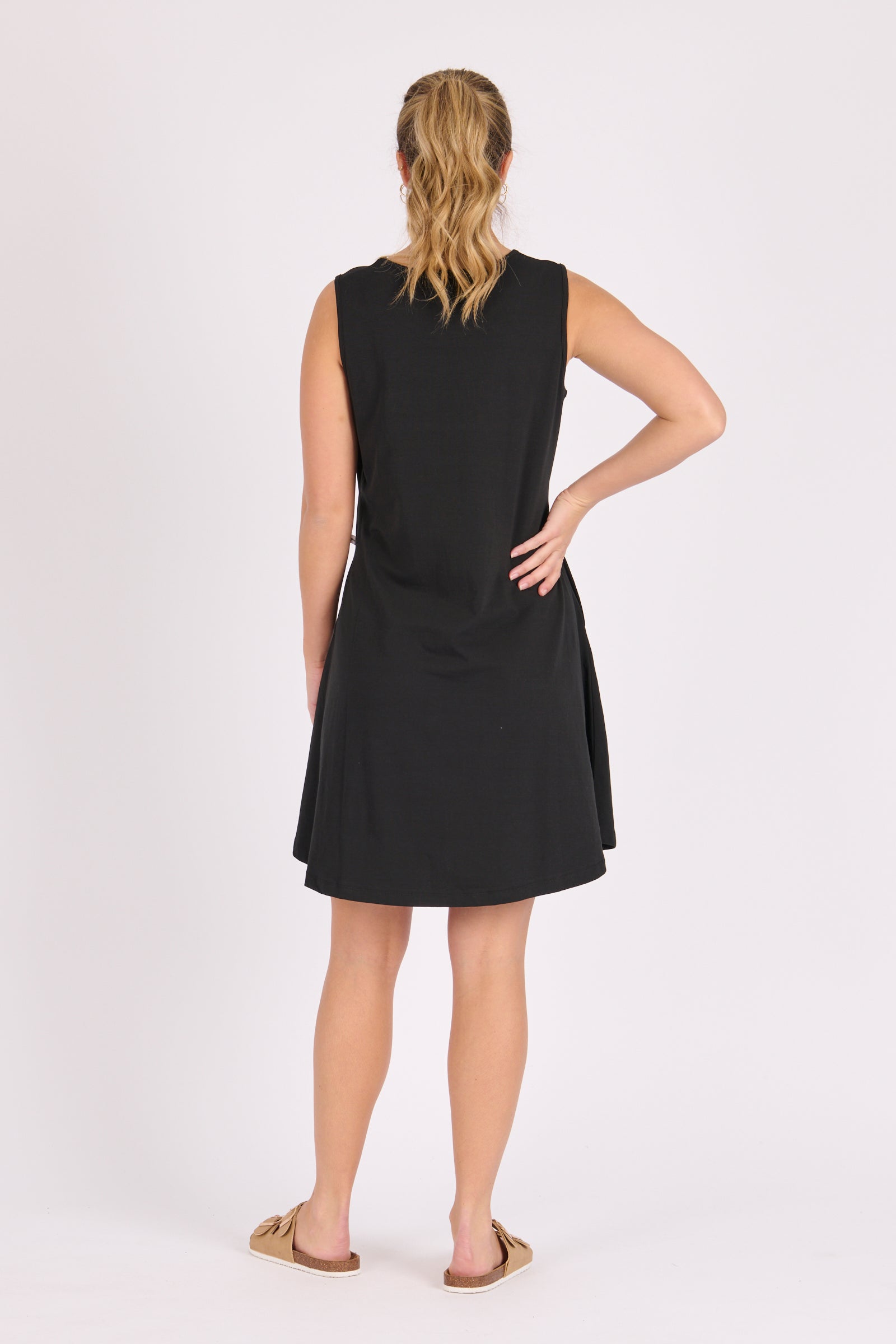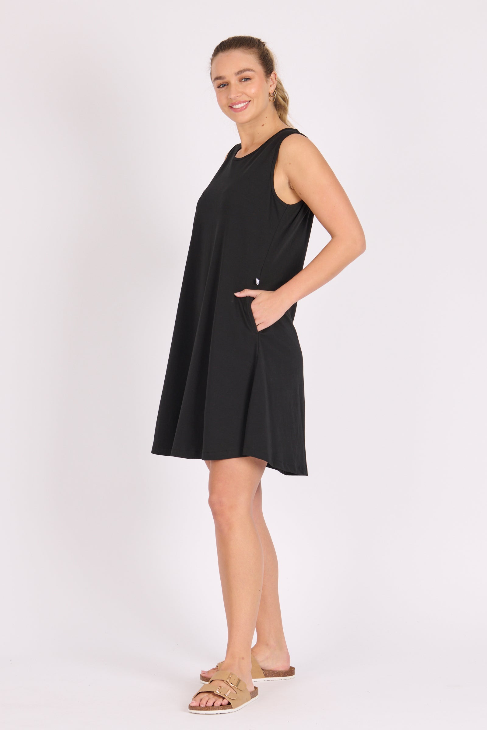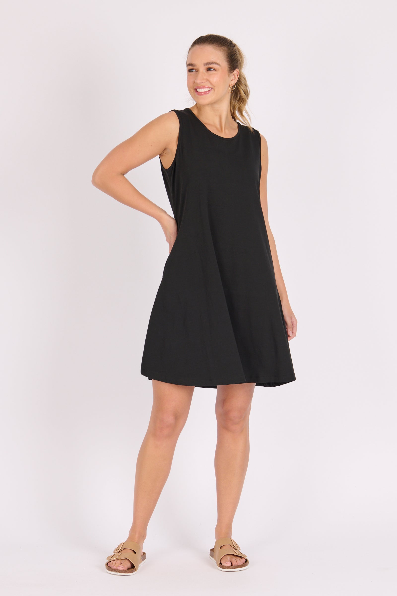 An effortless throw-on-and-go piece, the Swing Dress in Black is your everyday essential with a flattering, easy silhouette. Crafted from soft stretch cotton jersey, this sleeveless design skims the body through the top before falling into a gentle A-line shape. The knee-length cut and side pockets make it as practical as it is comfortable — perfect for warm days, travel, or layering under a jacket.