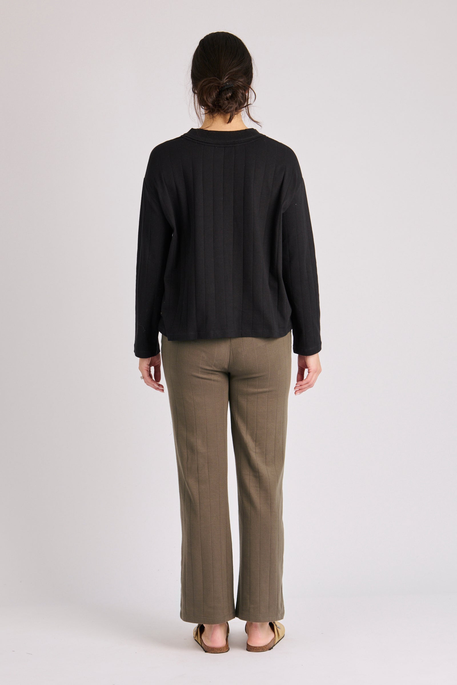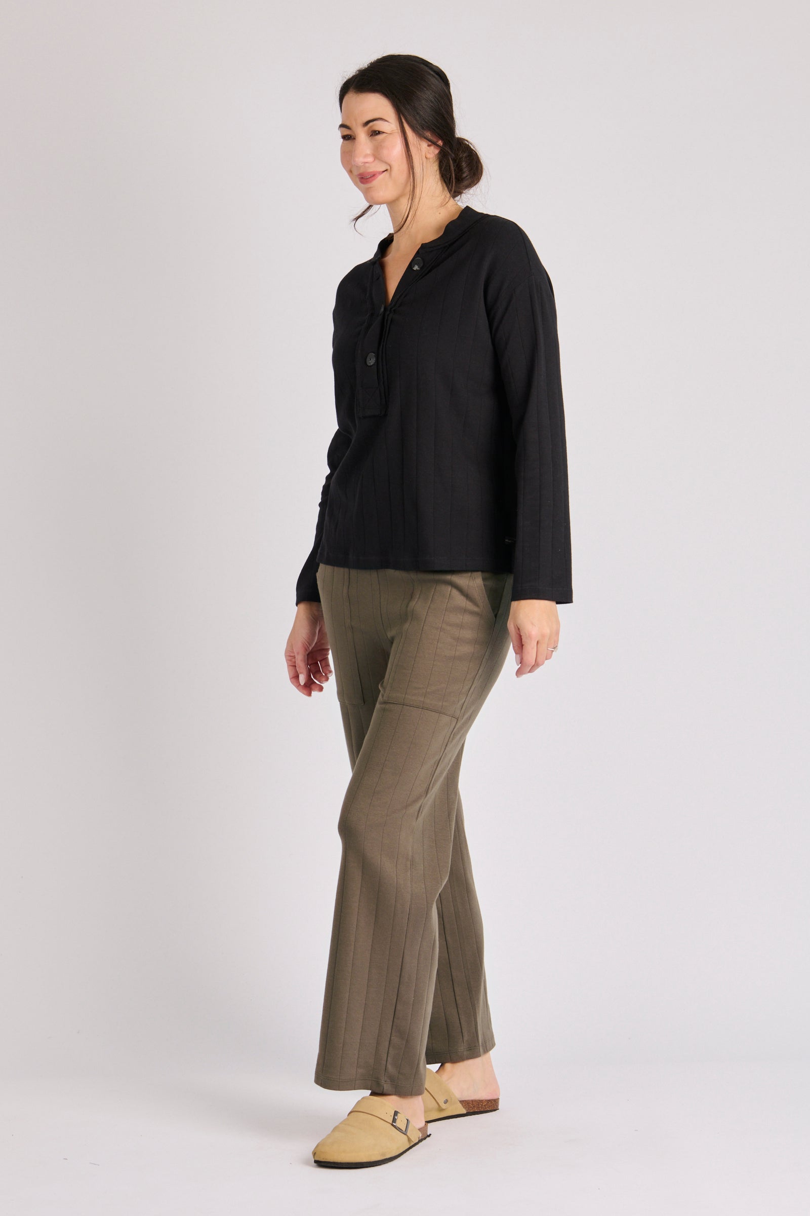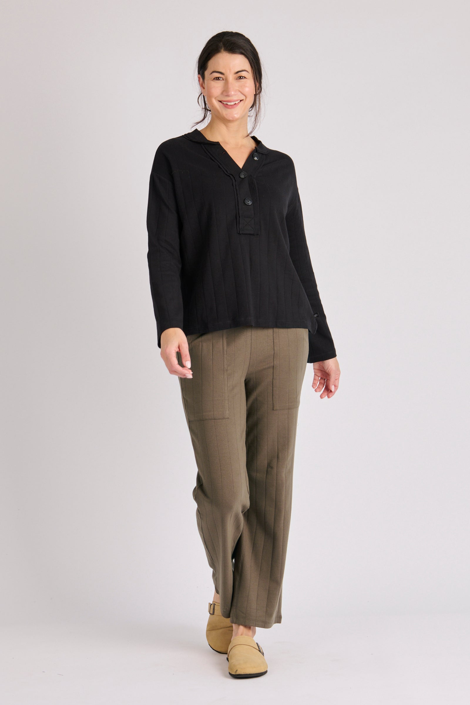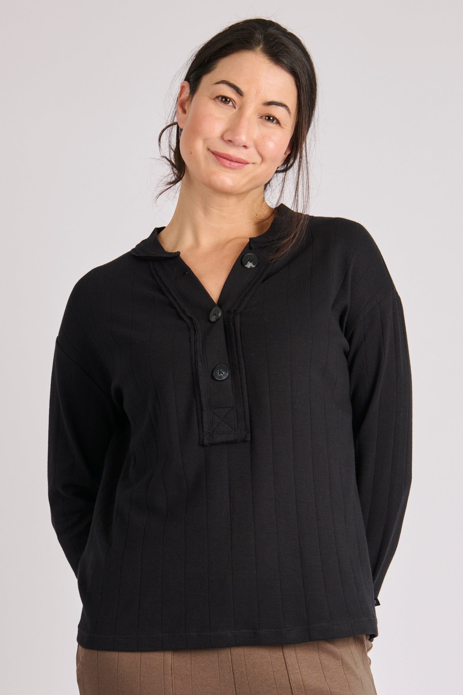 The Rib Long Sleeve Henley Tee in Black is a refined take on an everyday essential. Crafted in a soft stretch rib, it skims the body beautifully while offering all-day comfort. The buttoned Henley neckline adds subtle structure, making it an easy layering piece that feels elevated yet effortless.