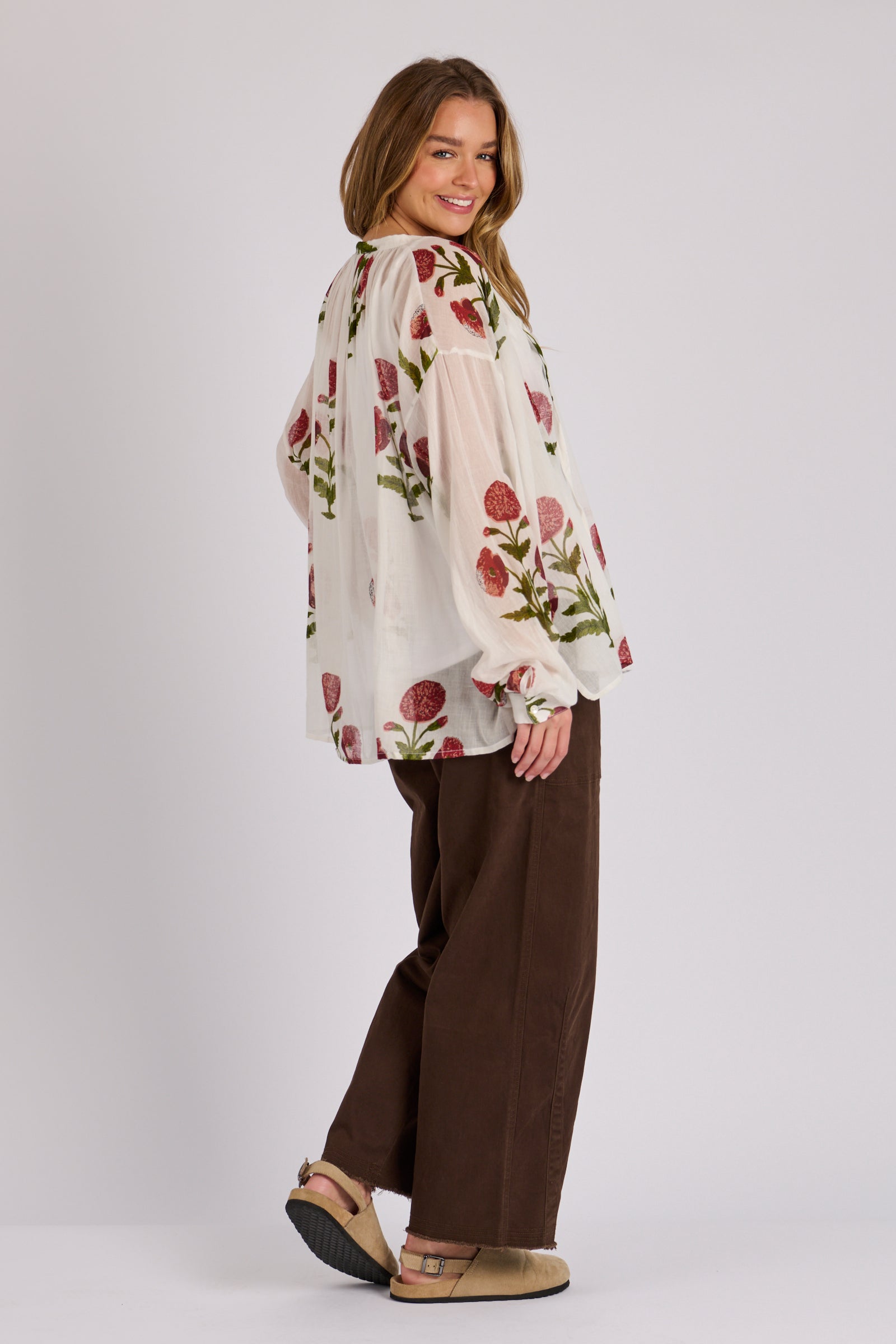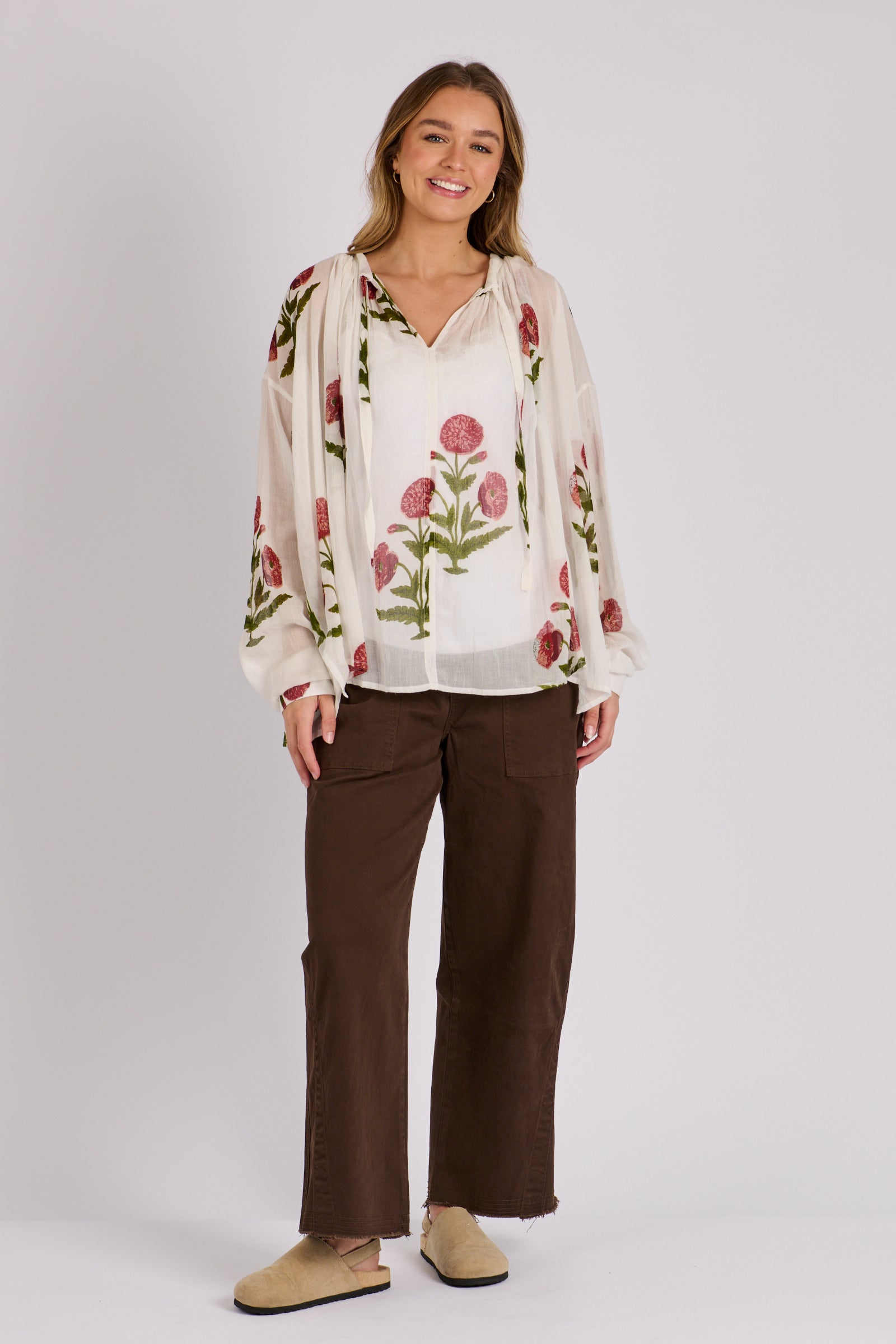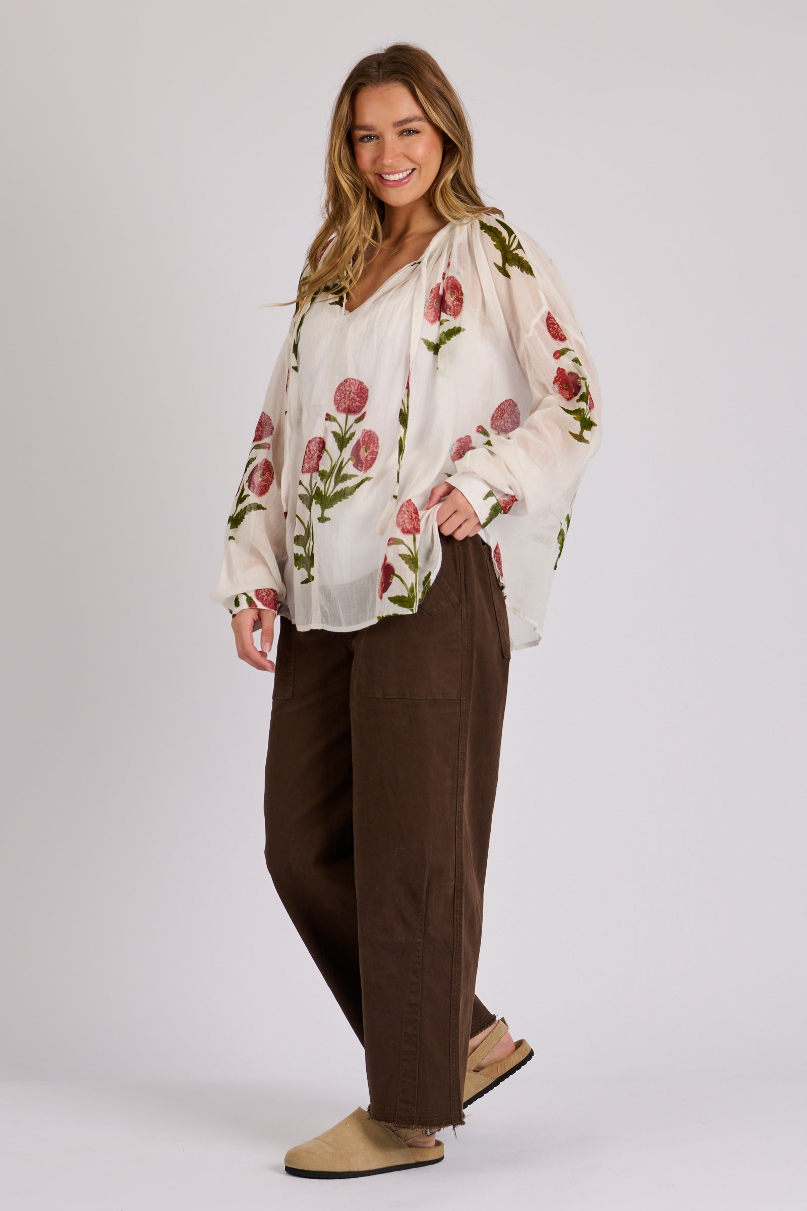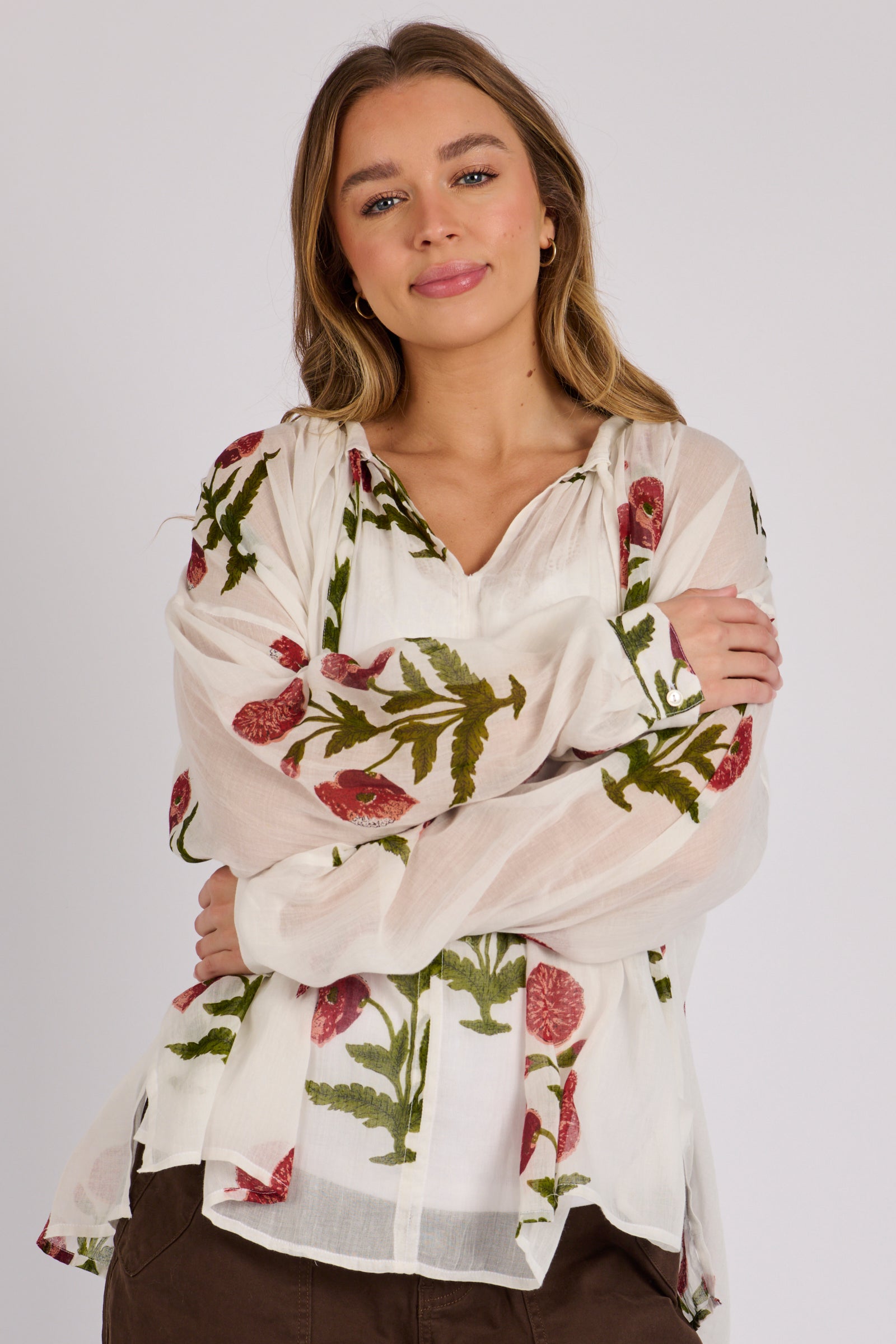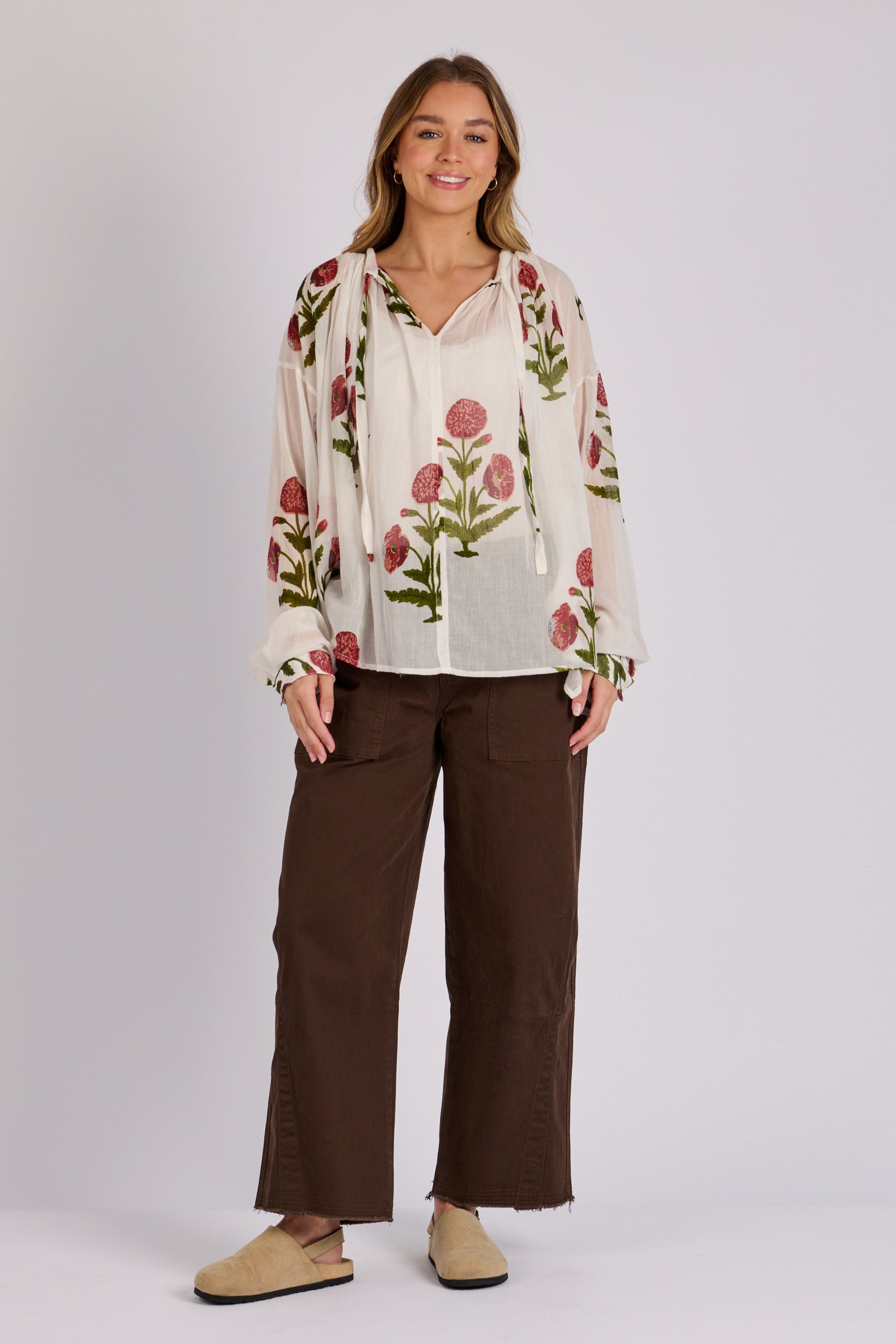 Float through your day in effortless style with the Gathered Neckline Blouse in White Floral. Crafted from breathable 100% cotton, this lightweight piece offers a soft, airy feel that’s perfect for warm days or layering through the seasons. The gathered neckline creates gentle volume, while the delicate floral print brings a fresh, feminine touch. Easy to dress up or down, it pairs beautifully with everything from relaxed denim to tailored separates.