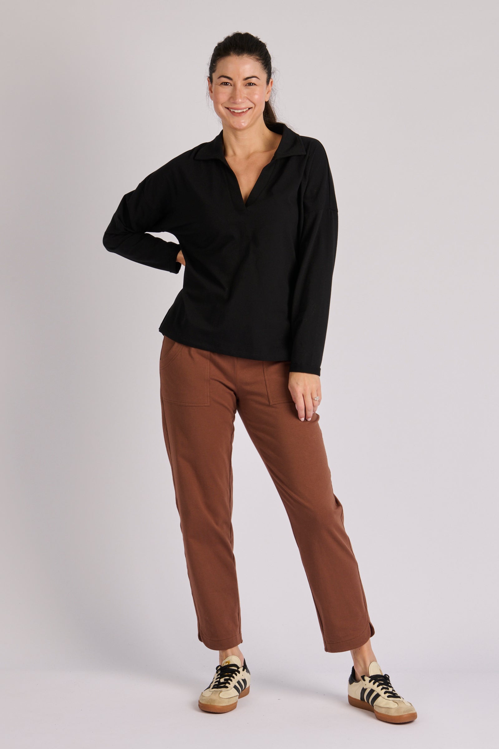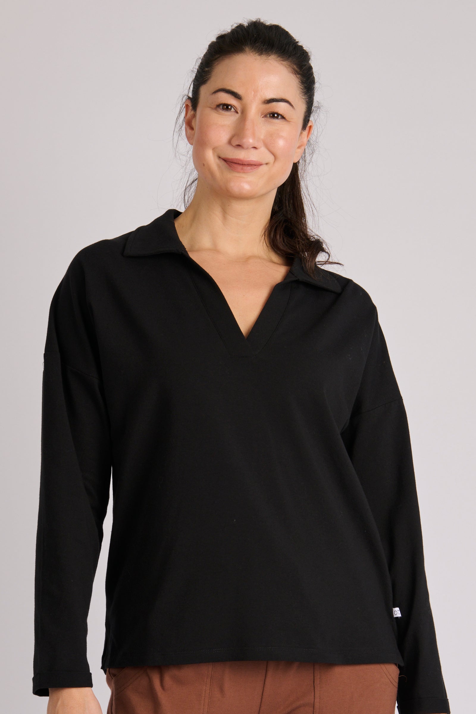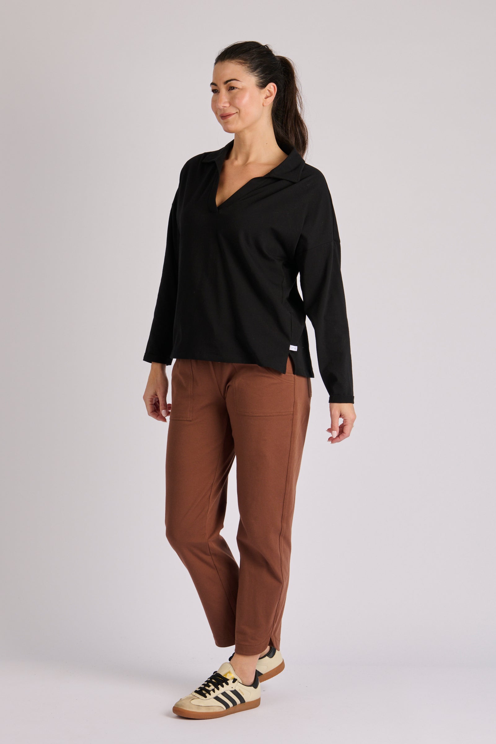 A relaxed everyday essential designed for comfort and effortless style. The Collared Long Sleeve Top is crafted from a soft cotton elastane blend that offers breathable stretch and an easy drape. Featuring a relaxed silhouette with a soft collar and open neckline, this piece feels polished while remaining incredibly comfortable. Perfect for travel, layering, or casual everyday wear, it pairs beautifully with denim, beach pants or relaxed trousers.