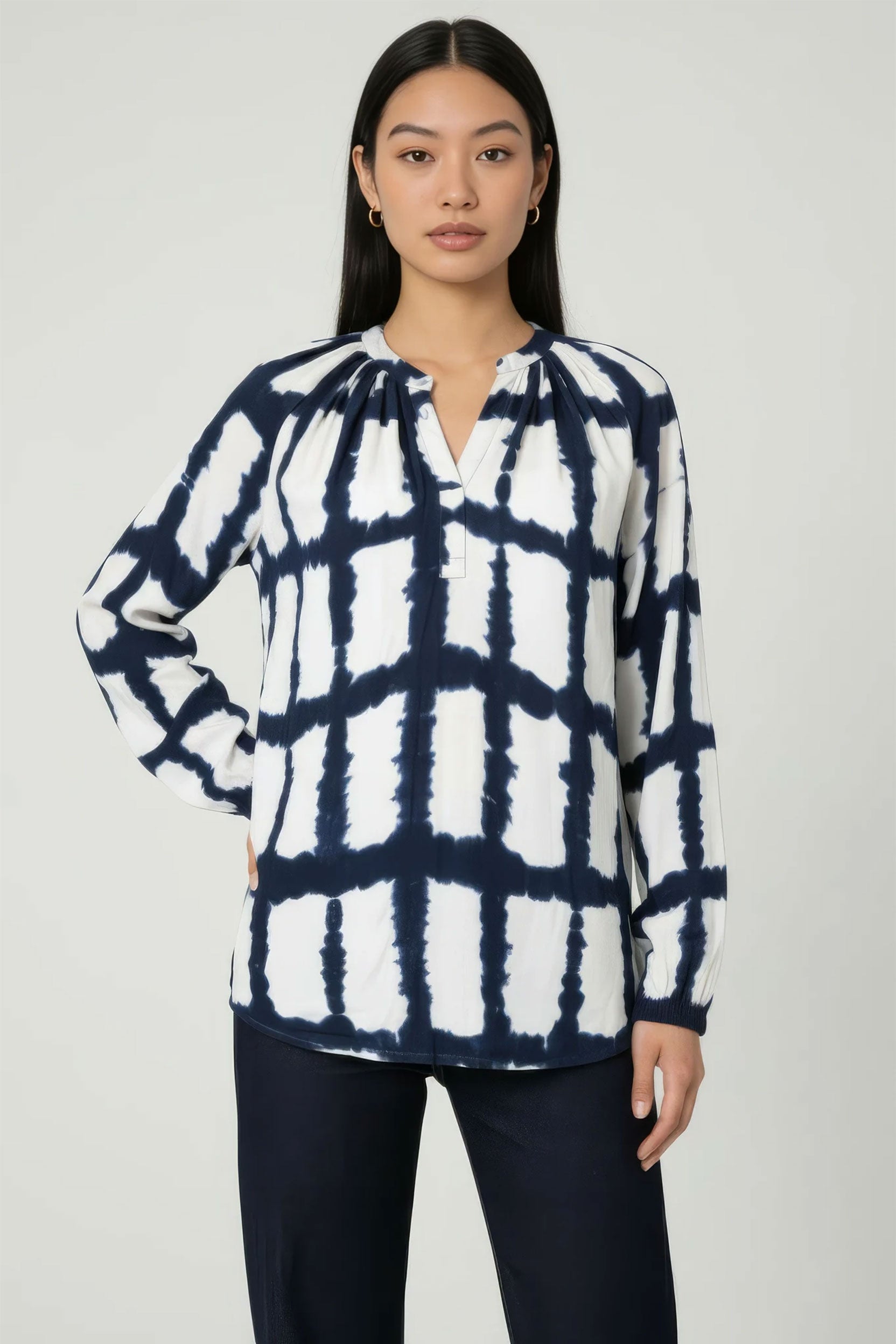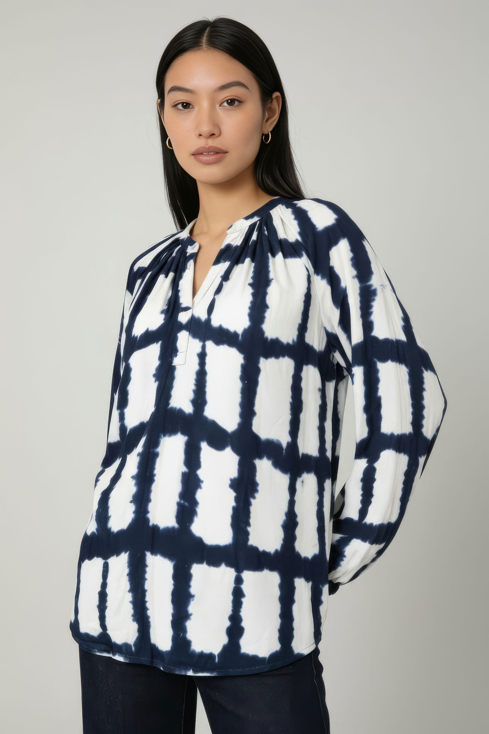 Soft, fluid and beautifully detailed, the Gathered Neckline Blouse is crafted from luxurious viscose satin twill with a gentle sheen. Featuring delicate gathers through the neckline and a relaxed silhouette, this long-sleeve style drapes effortlessly on the body while the blue grid print adds a modern, graphic edge. An easy piece to dress up or down, perfect with denim or tailored pants.