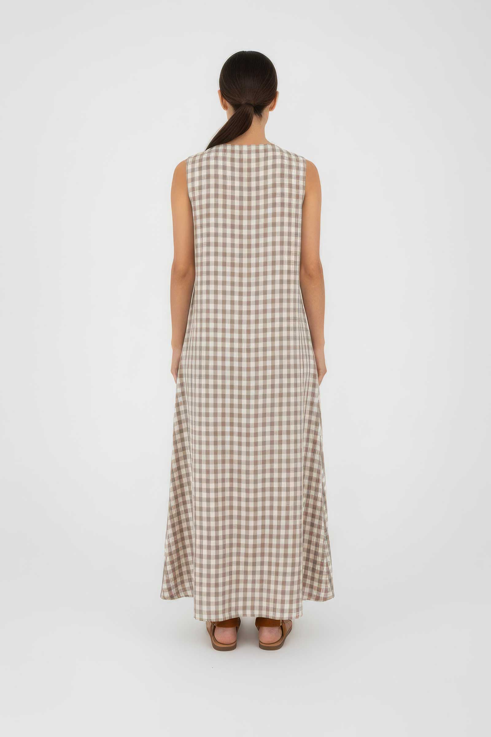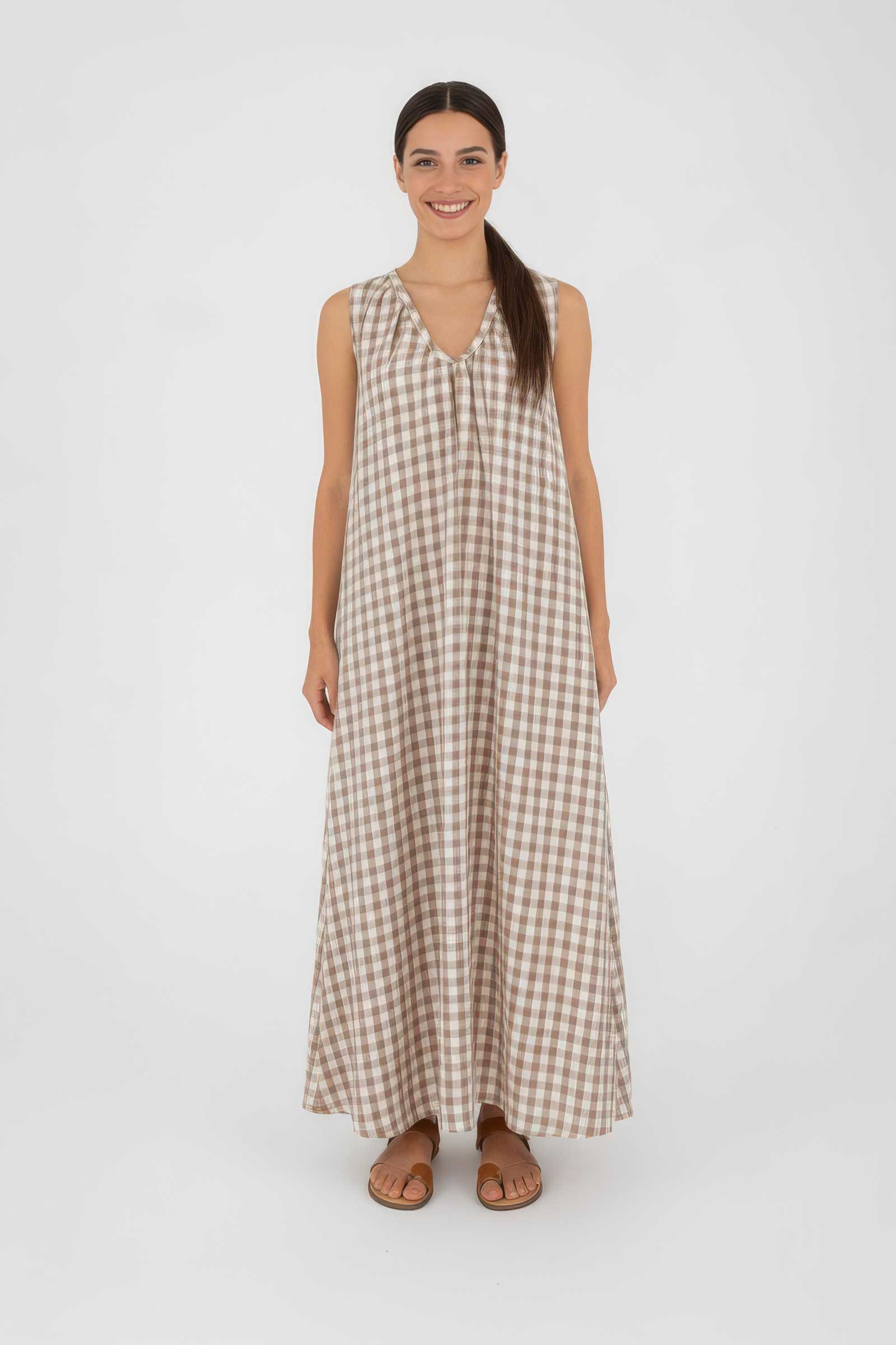 Details: Sleeveless design, V-neckline with soft gathers, and an all-over chocolate check pattern
