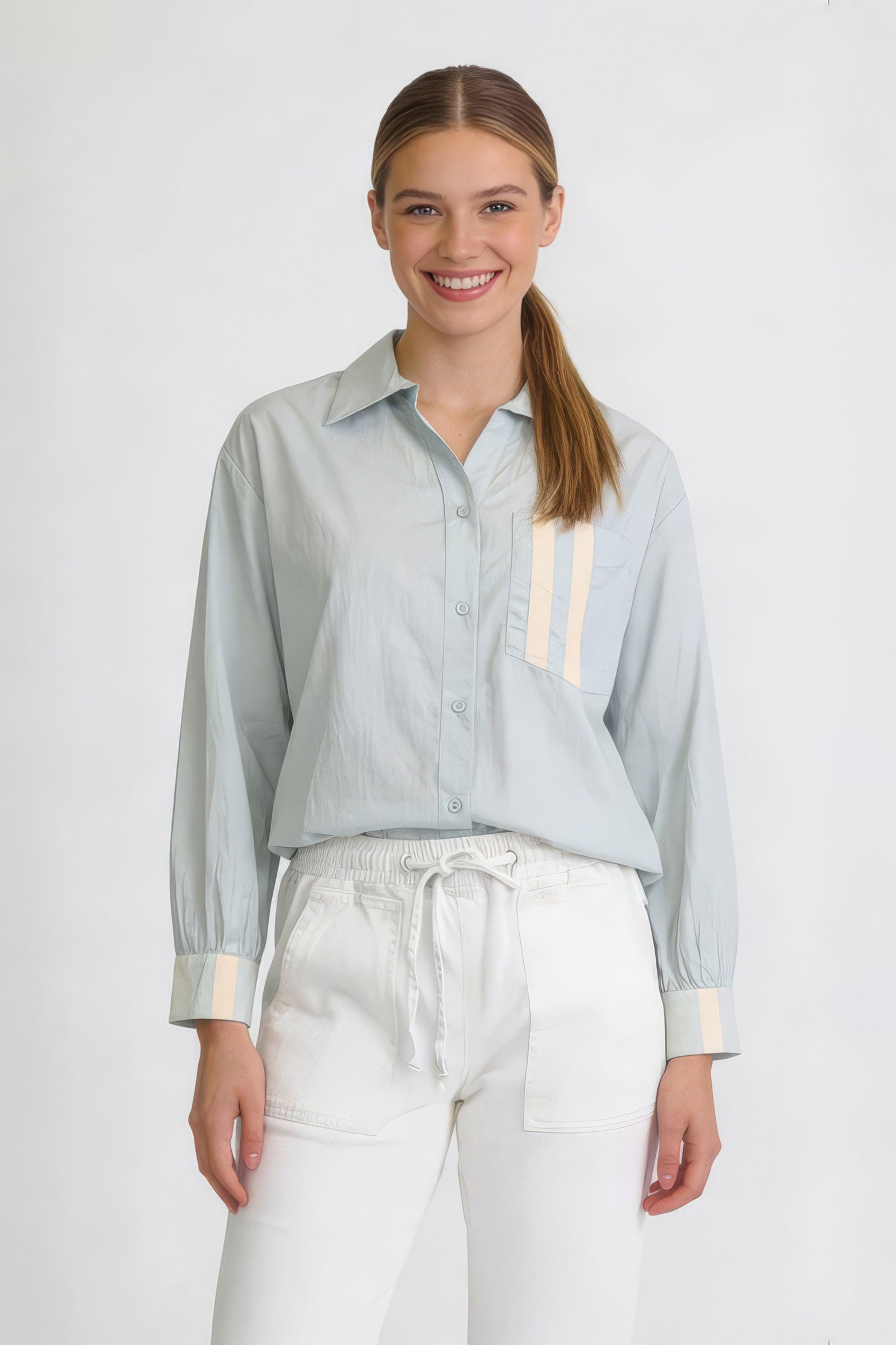 Details: Chest pocket feature, buttoned cuffs, and a soft washed finish