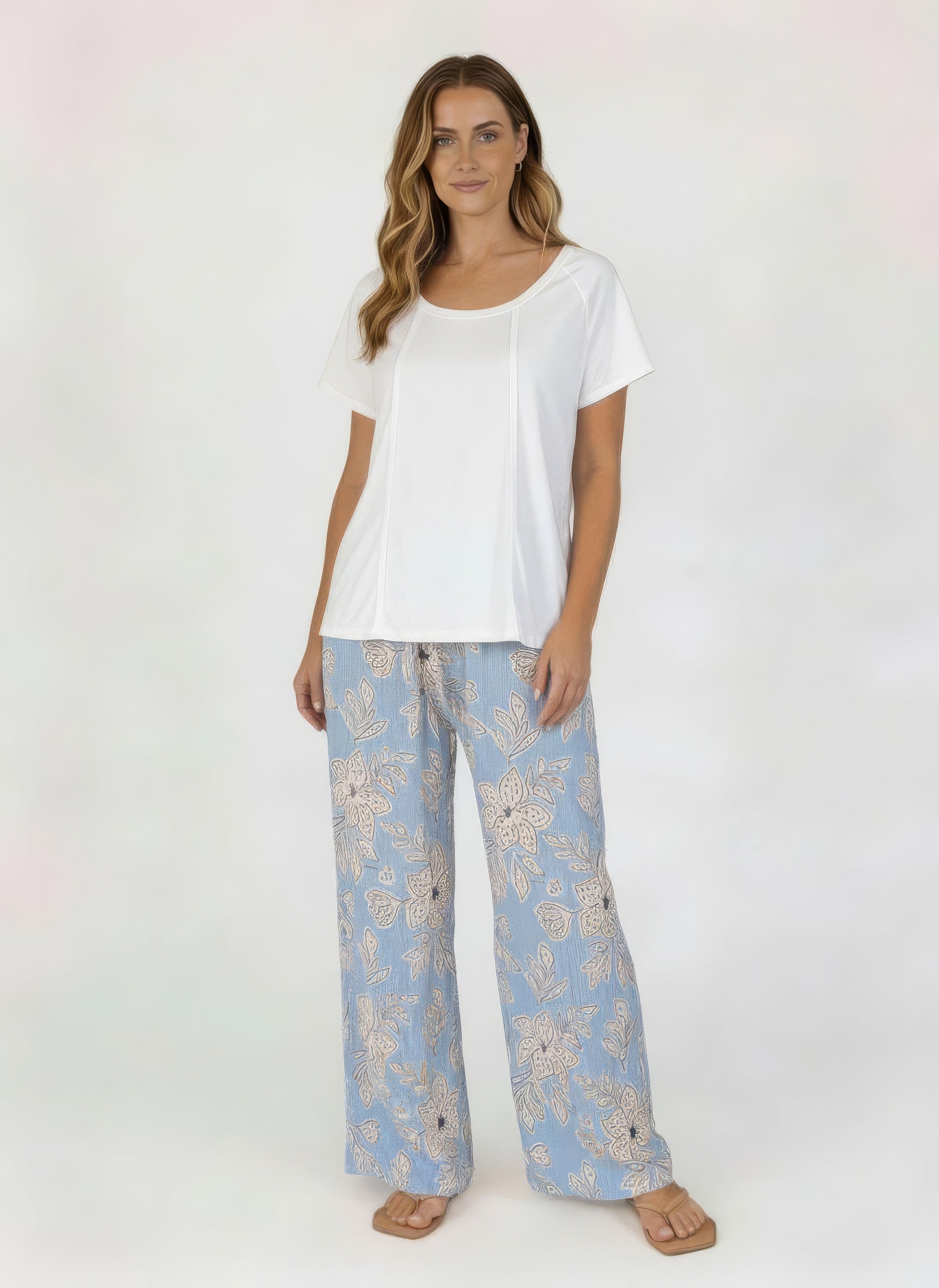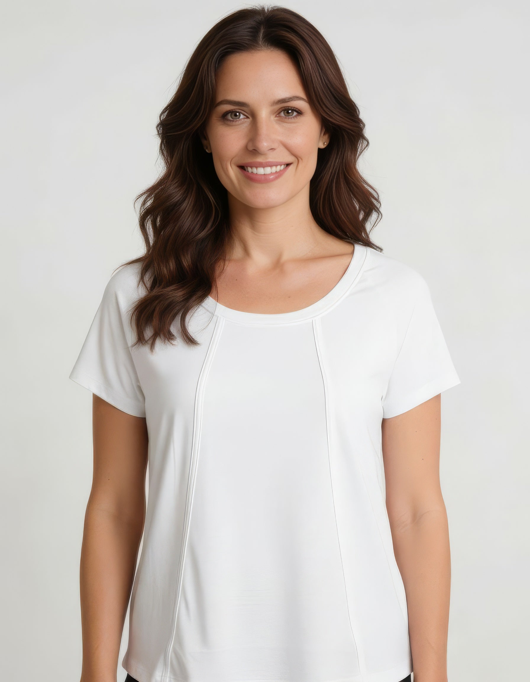 The Panelled Tee in White is an elevated take on an everyday essential, designed for comfort with subtle shaping. Featuring softly contoured panel lines through the front, this tee offers a flattering silhouette while maintaining an easy, relaxed feel. Crafted from a soft slub jersey with stretch, it’s breathable, lightweight and perfect for everyday wear. Style it with denim, relaxed pants or skirts for effortless, polished dressing.