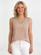 Design: Classic mocha stripe with contrast neckline and armhole binding for a subtle pop of colour.