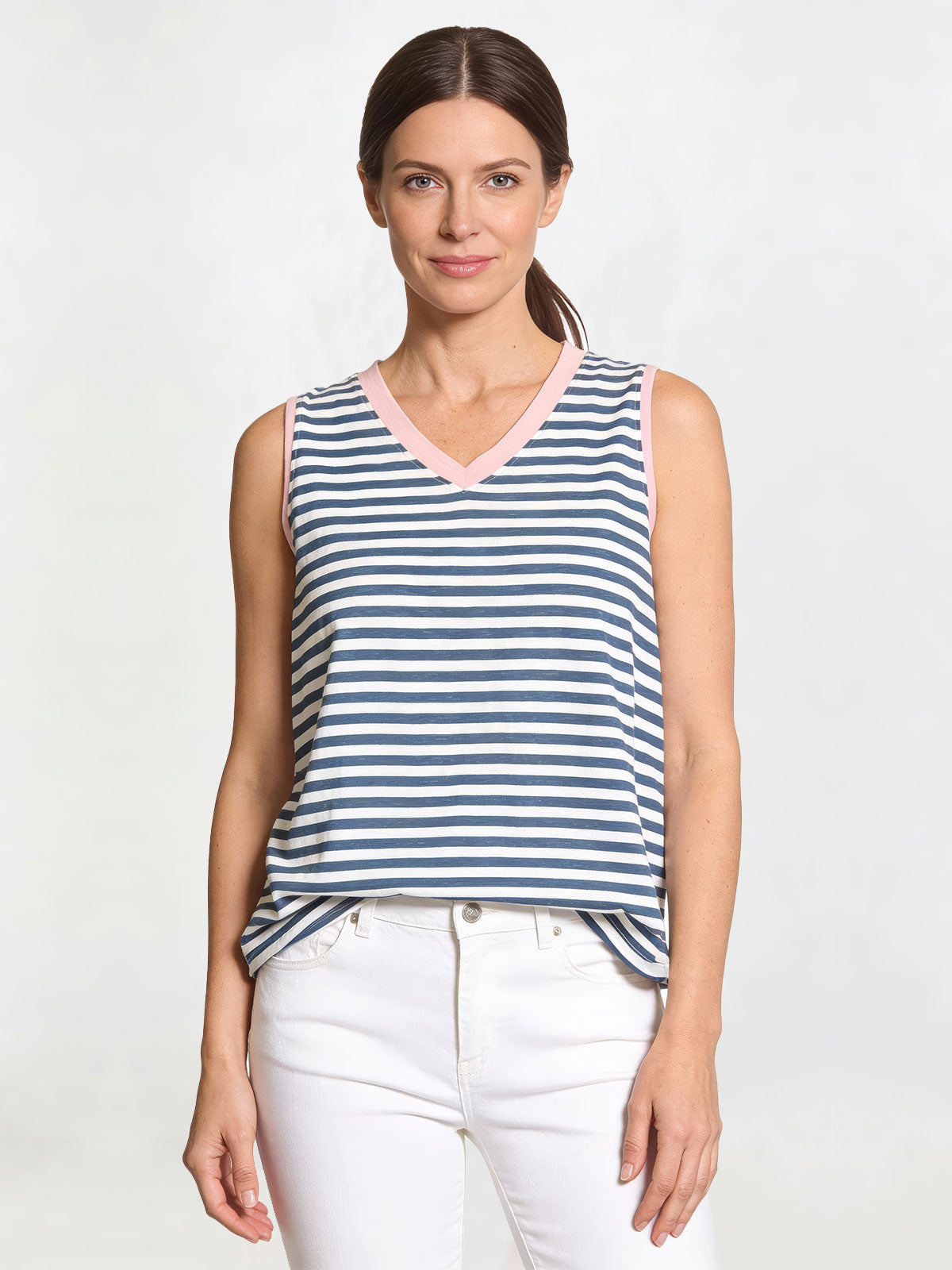 Details: Sleeveless cut for warm days, a flattering V neckline, and a drop back hem that offers added coverage.