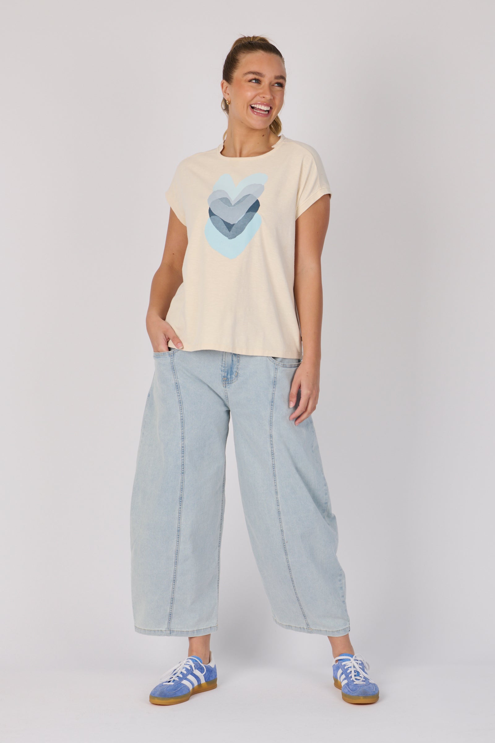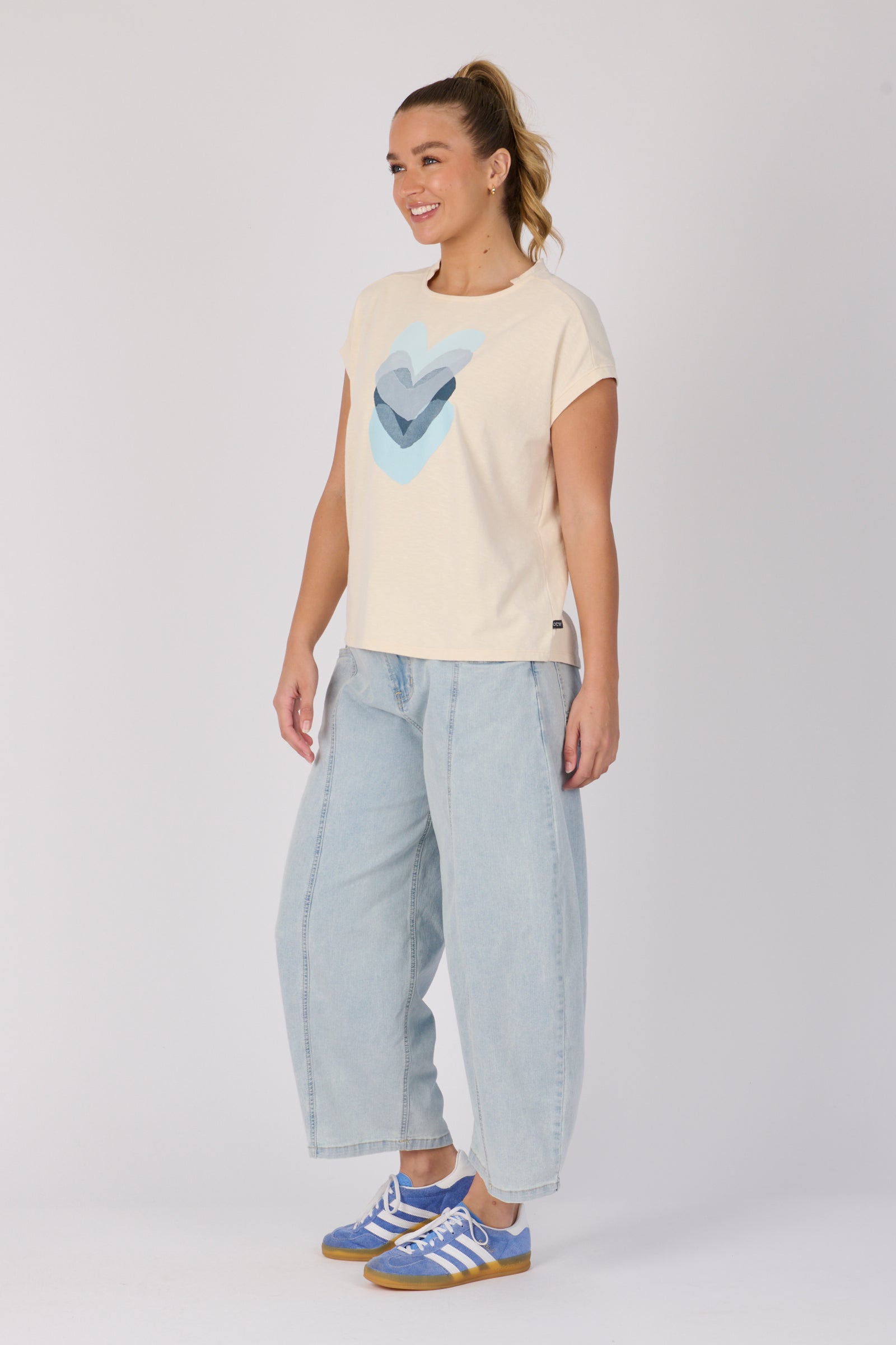 The Half Collar Tee in Ecru Falling Hearts is crafted from a soft cotton blend for easy everyday wear. Featuring a relaxed fit with a round neckline, short sleeves, and a half-collar detail for a modern touch, this tee combines casual comfort with subtle style.