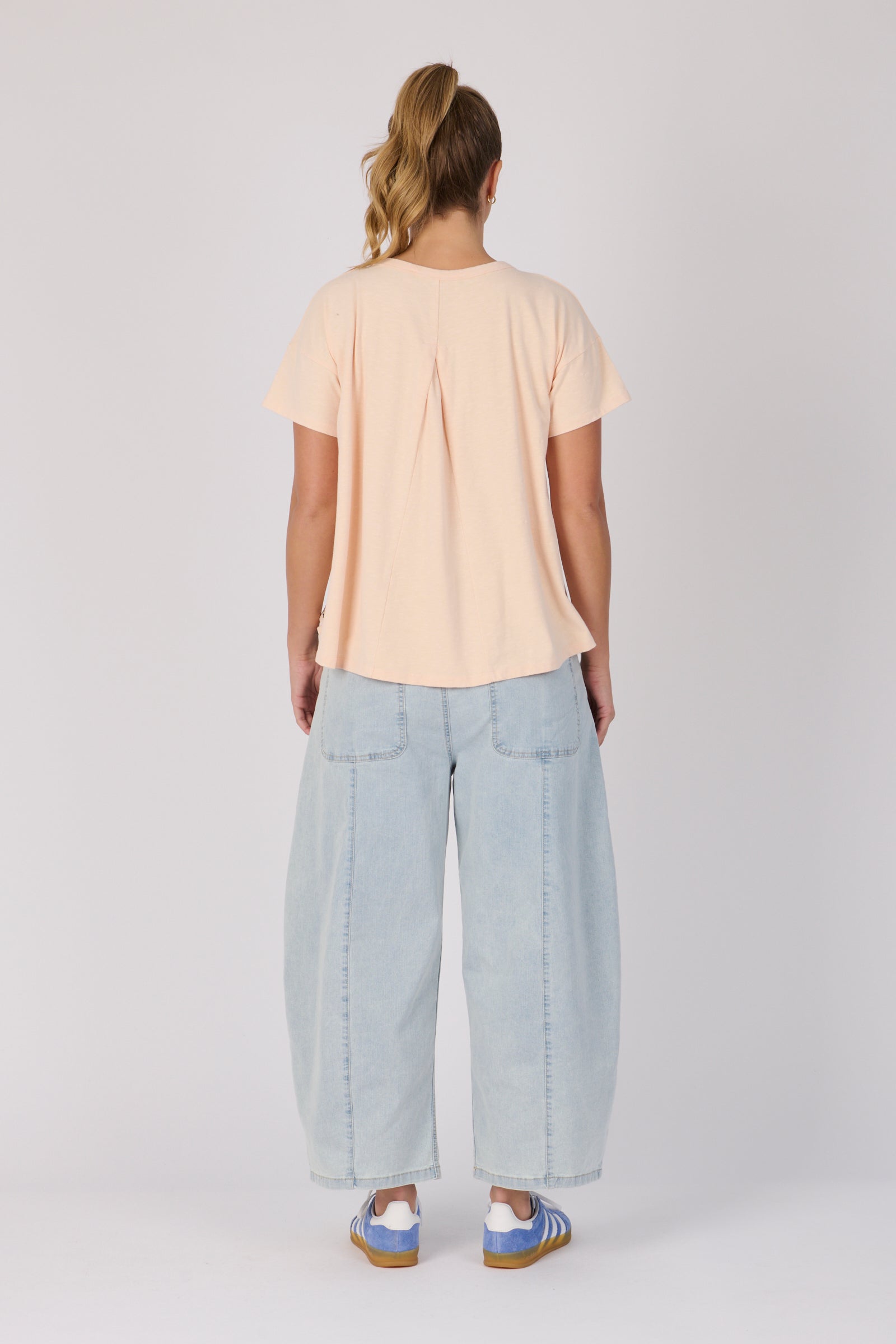 The Pleat Back Tee in Ecru is crafted from a soft cotton blend for everyday comfort. Featuring a relaxed fit with a round neckline, dropped shoulders, and a pleat back detail for added shape. A versatile wardrobe staple you’ll wear on repeat.