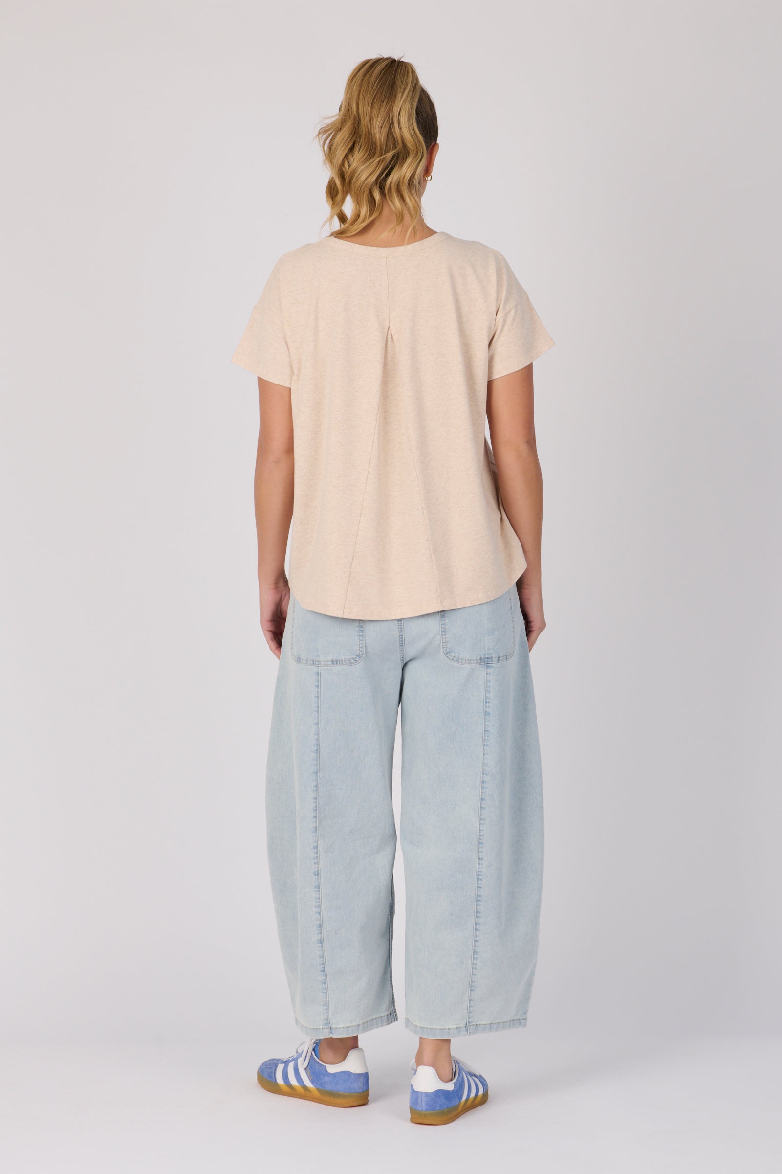 The Pleat Back Tee in Oatmeal Marle is crafted from a soft cotton blend for everyday comfort. Featuring a relaxed fit with a round neckline, dropped shoulders, and a pleat back detail for added shape. A versatile wardrobe staple you’ll wear on repeat.
