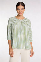 The Gathered Neck Blouse in Green Blue Check is a relaxed, feminine style designed for effortless everyday wear. Featuring a softly gathered neckline and an easy, flowing silhouette, this blouse offers comfort with subtle detail. Crafted from lightweight 100% crinkle cotton, it’s breathable and airy — perfect for warm days or easy layering. The soft green and blue check adds a fresh, timeless feel that pairs beautifully with neutral pants, denim or skirts.