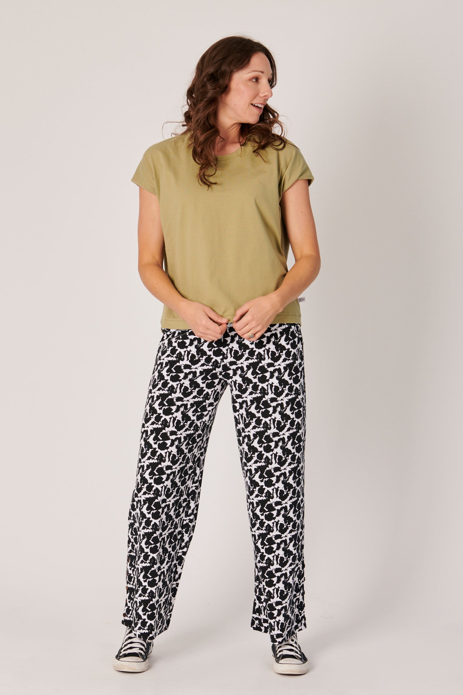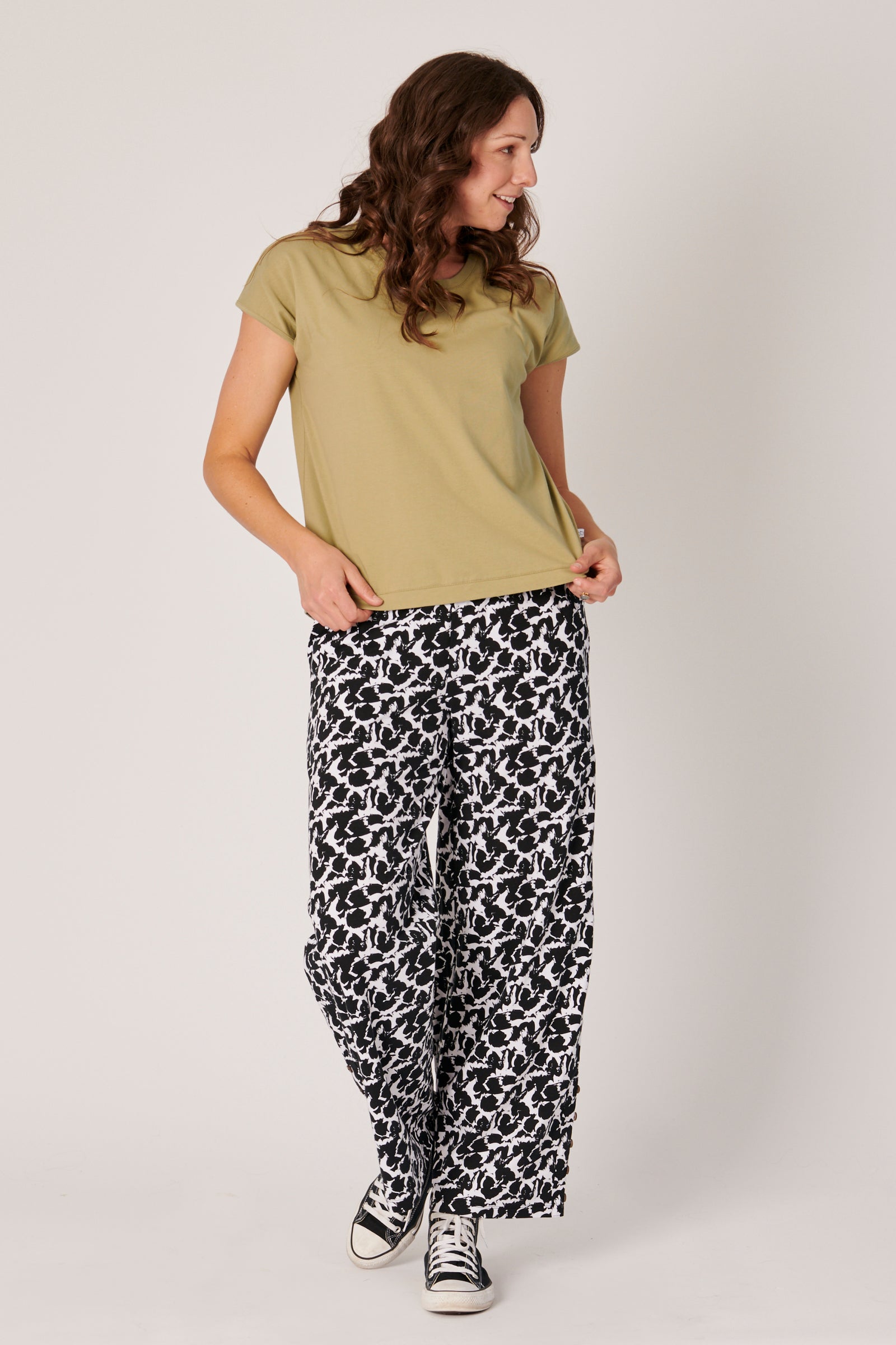 Its curved hemline is slightly longer at the back, creating a soft, feminine shape that looks great tucked in or left out. The tee is crafted from a blend of 95% cotton and 5% elastane, giving it a breathable, soft feel with a hint of stretch. This blend ensures that the tee holds its shape throughout the day while allowing ease of movement, making it ideal for all-day wear.