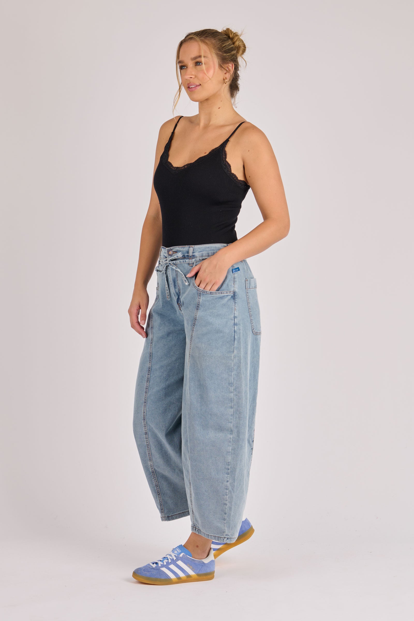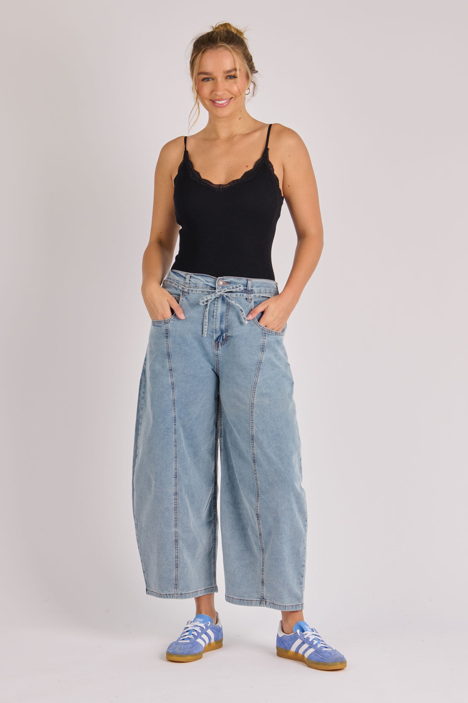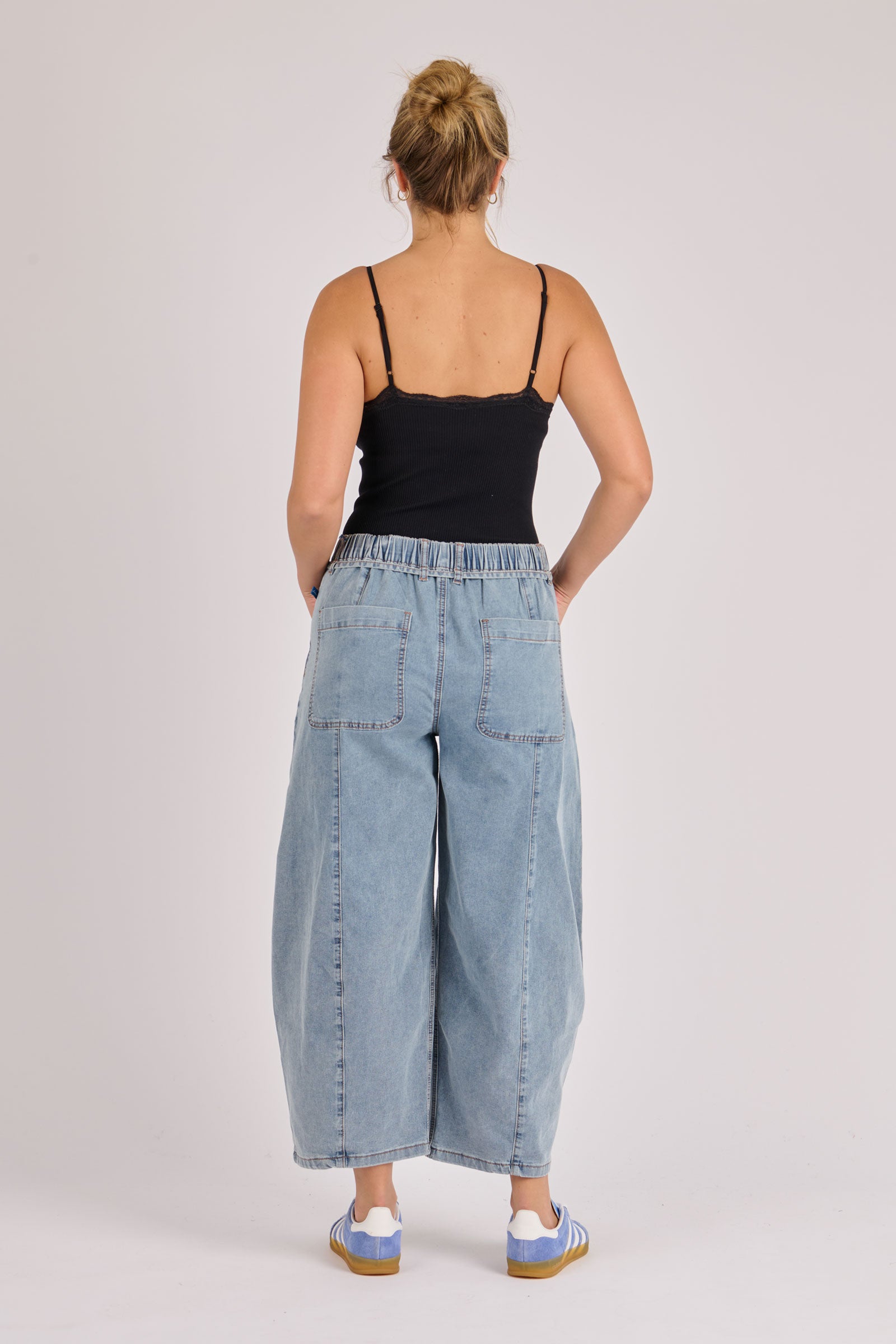 The Barrel Leg Jeans in Pale Blue are crafted from a comfortable, structured blend of 75% Cotton, 23% Polyester and 2% Elastane — giving them a soft denim feel with light stretch for everyday movement. Designed with a modern barrel silhouette, these jeans feature curved panel lines that shape the leg, offering a flattering and contemporary fit. The drawstring waistband adds relaxed comfort while the cropped ankle length gives them an effortlessly cool finish. Pair with the matching Short Sleeve Jacket for a coordinated, fresh summer set.