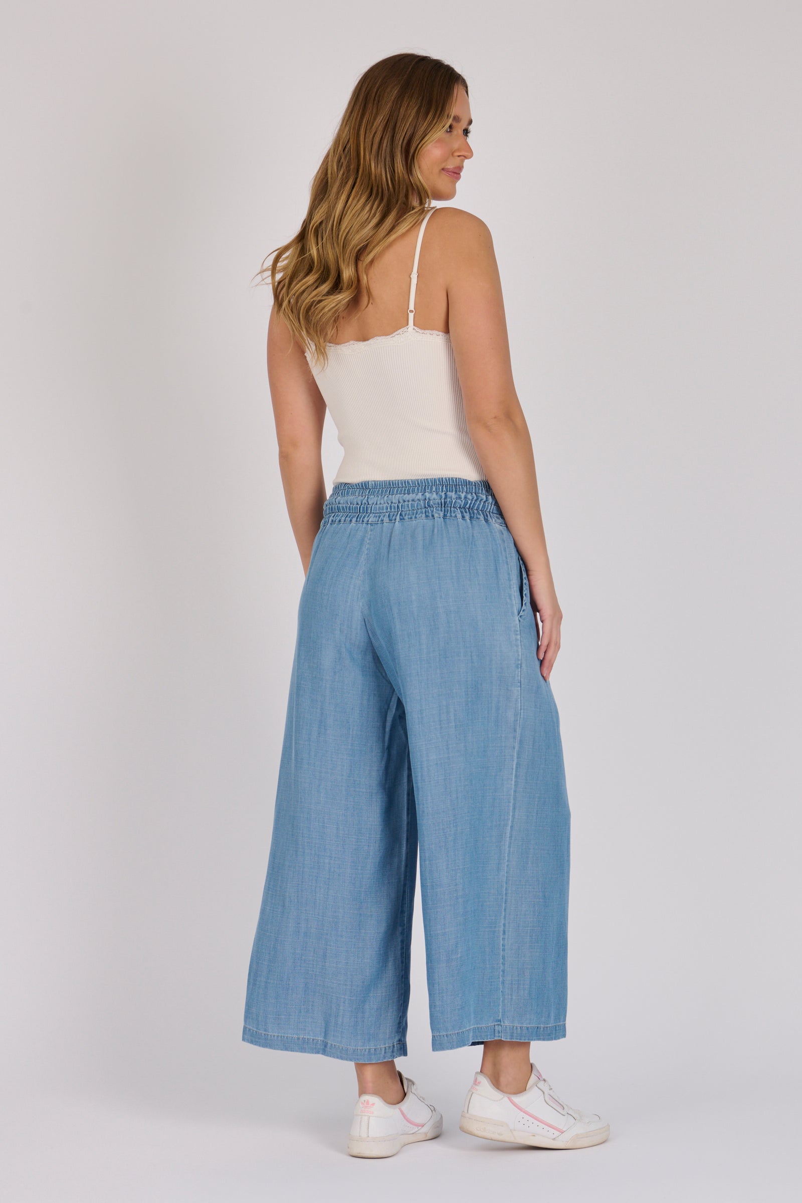 The Wide Leg Pull On Pant in Light Blue is crafted from 100% Lyocell for a soft, breathable, and beautifully fluid drape. Designed with an easy pull-on waistband, adjustable drawstring, and gentle pleat detailing, these pants deliver effortless comfort without compromising on style. The wide-leg silhouette creates a relaxed, airy feel — perfect for warm-weather days, weekend dressing, or pairing with the matching lyocell jacket for a coordinated look.