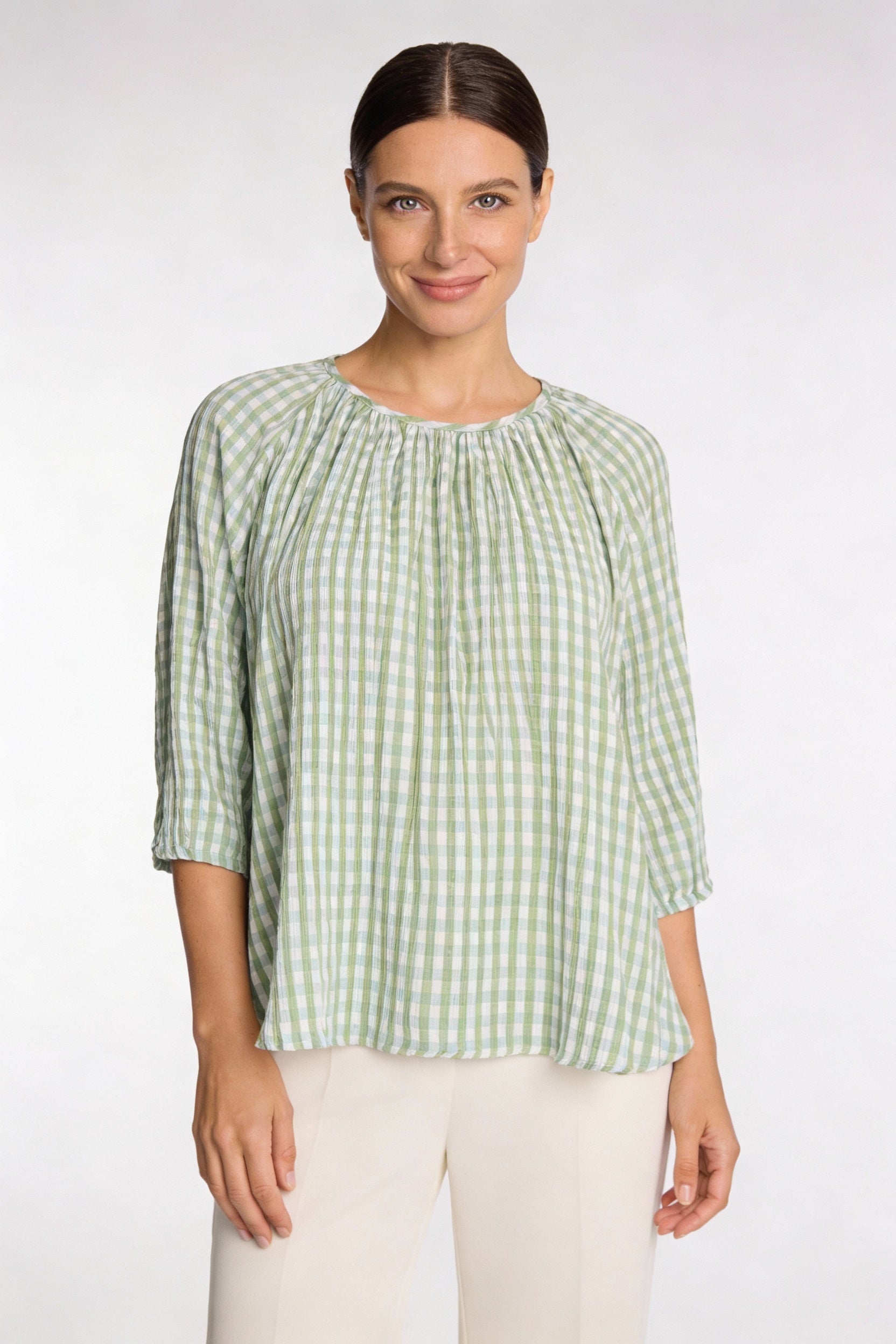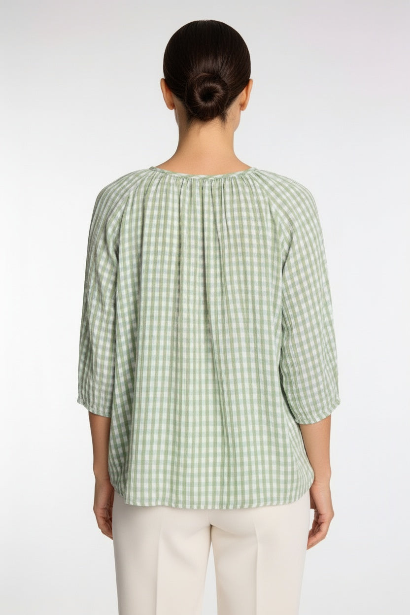 The Gathered Neck Blouse in Green Blue Check is a relaxed, feminine style designed for effortless everyday wear. Featuring a softly gathered neckline and an easy, flowing silhouette, this blouse offers comfort with subtle detail. Crafted from lightweight 100% crinkle cotton, it’s breathable and airy — perfect for warm days or easy layering. The soft green and blue check adds a fresh, timeless feel that pairs beautifully with neutral pants, denim or skirts.