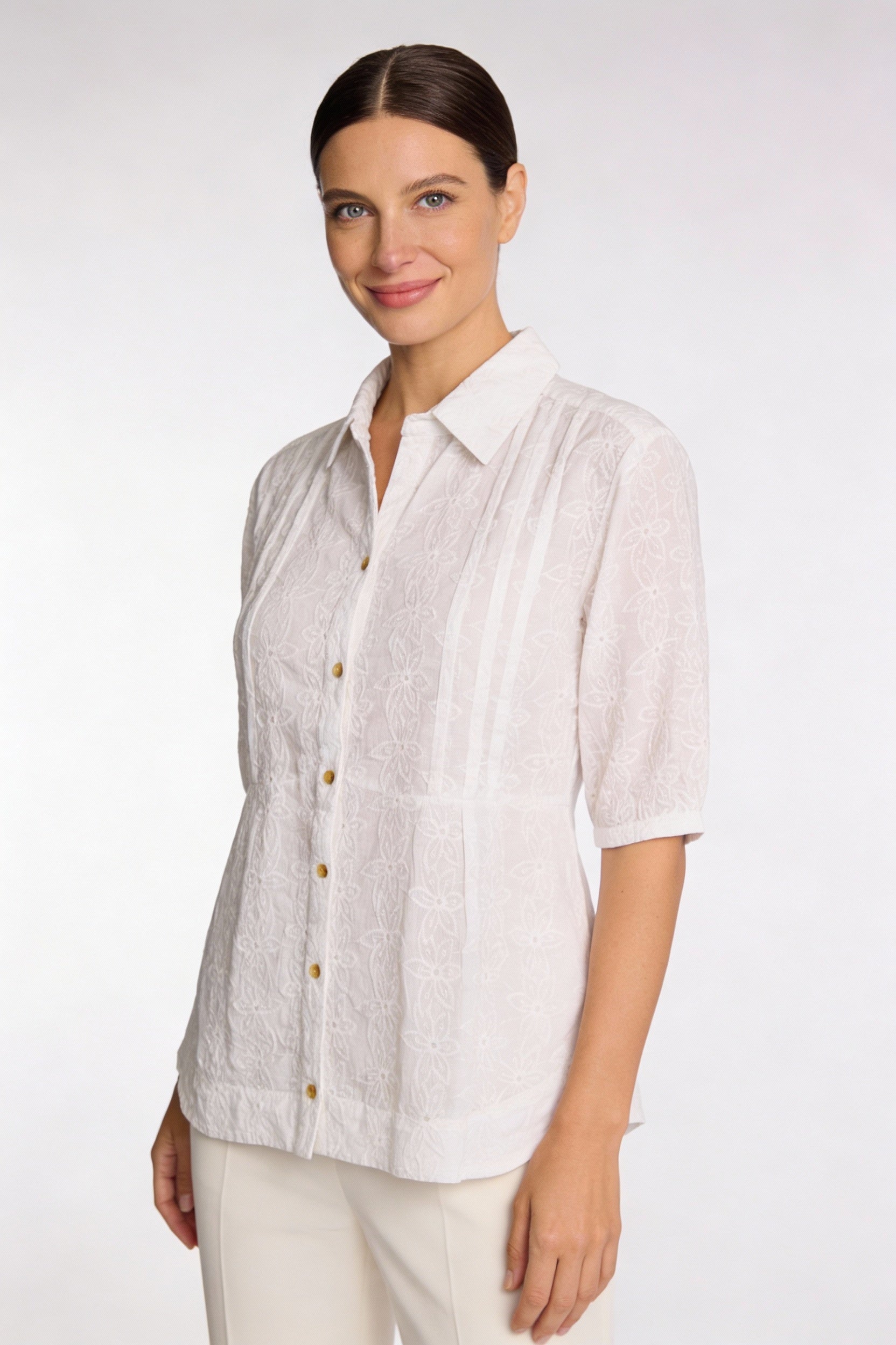 The Pleat Detail Button Through Blouse in White is a timeless, feminine style designed for effortless everyday wear. Featuring delicate pleat detailing through the front and soft embroidery throughout, this blouse offers texture and interest while remaining easy to style. Crafted from lightweight embroidered cotton, it’s breathable and comfortable — perfect for warm days or layering through the seasons. Finished with a classic button-through front, it pairs beautifully with relaxed pants, denim or skirts for an elevated everyday look.